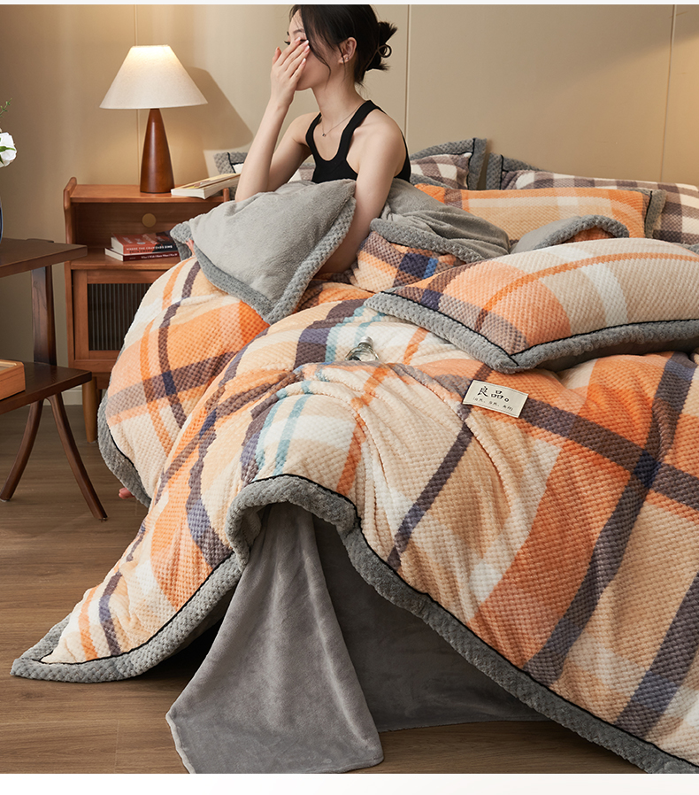 早晨家纺 2025新款豆豆款菠萝格提花四件套 豆豆绒-大格橙