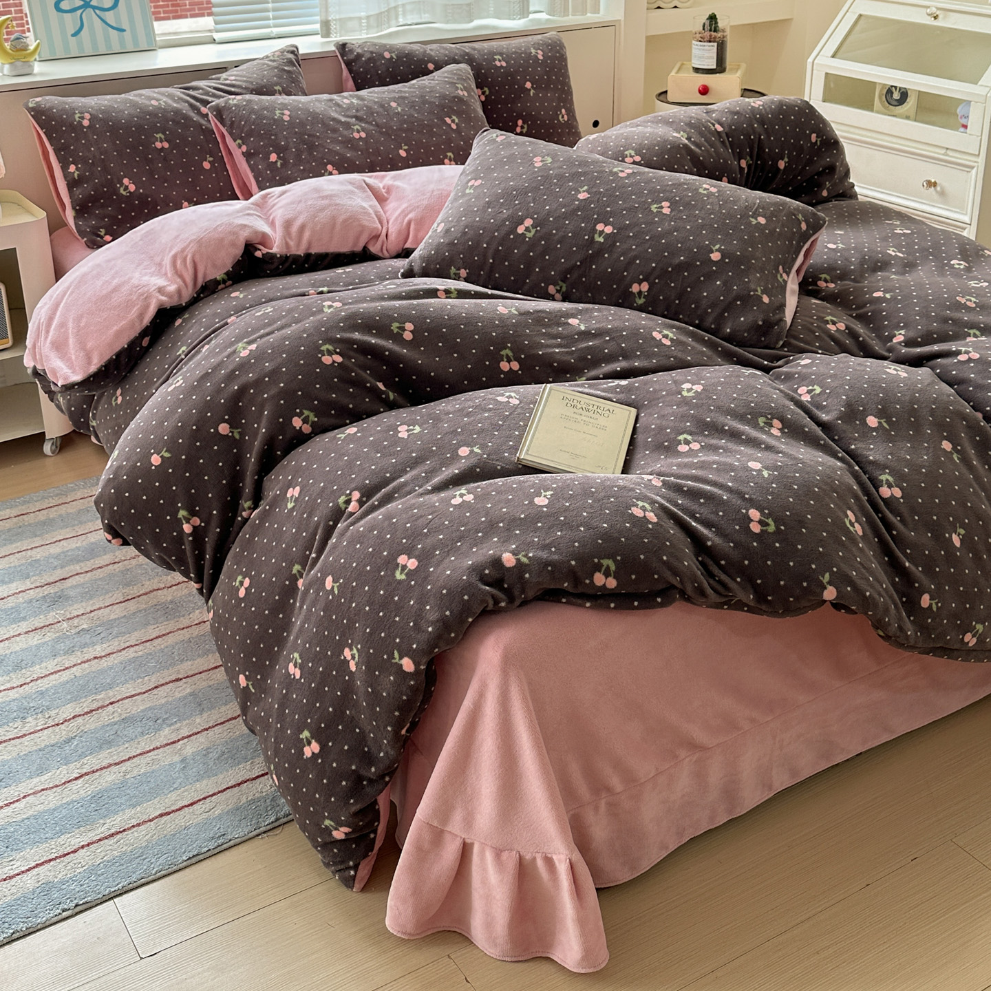 商品名称:梦莱斯 2025新款加厚保暖双面牛奶绒四件套 黑巧樱桃