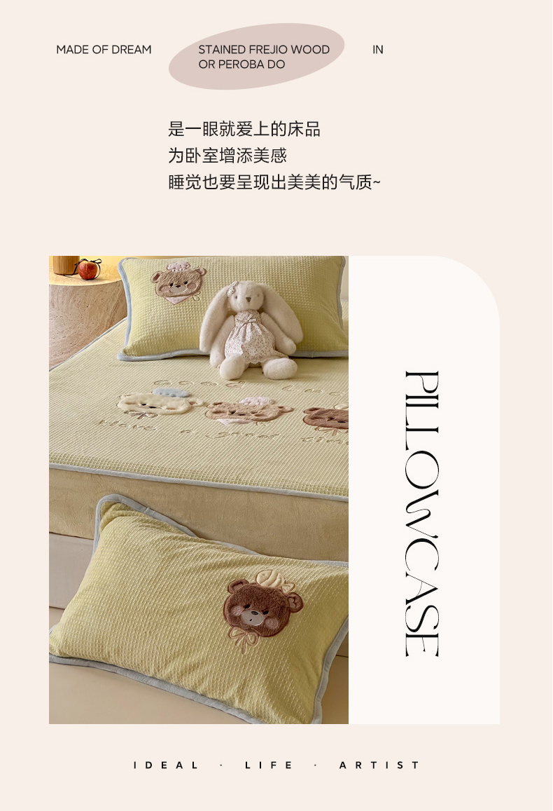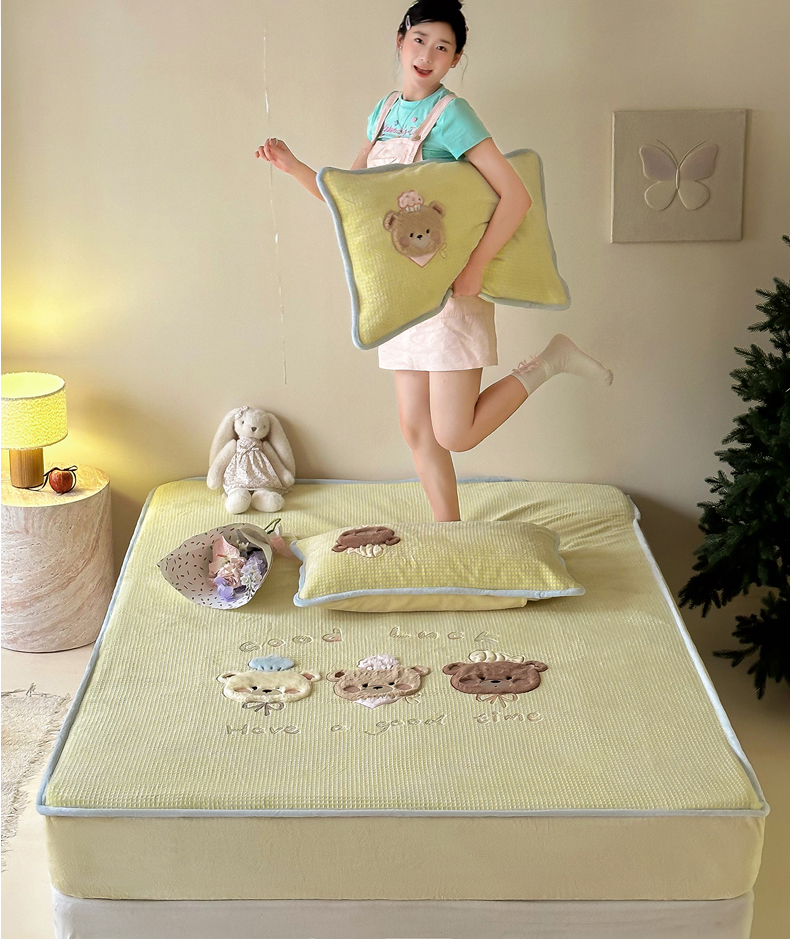 商品名称:Sweet dreams甜梦 2025新款华夫格绒兔毛贴布床笠三件套 三只小熊粉