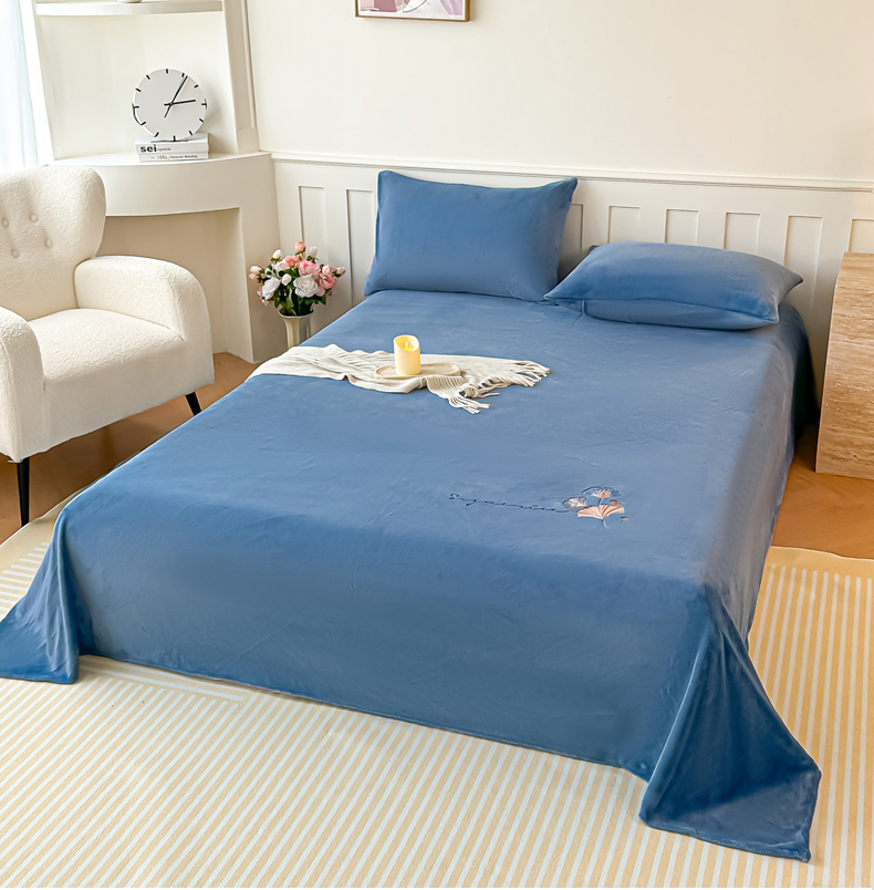 卓缦家纺 2025新款秋冬牛奶绒刺绣床单加厚三件套单品 宾利蓝