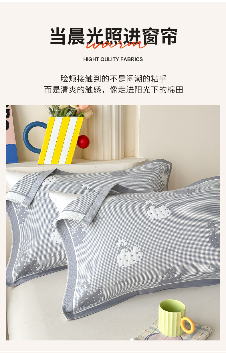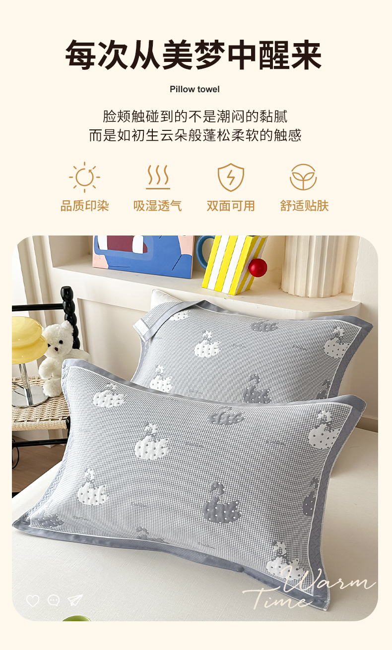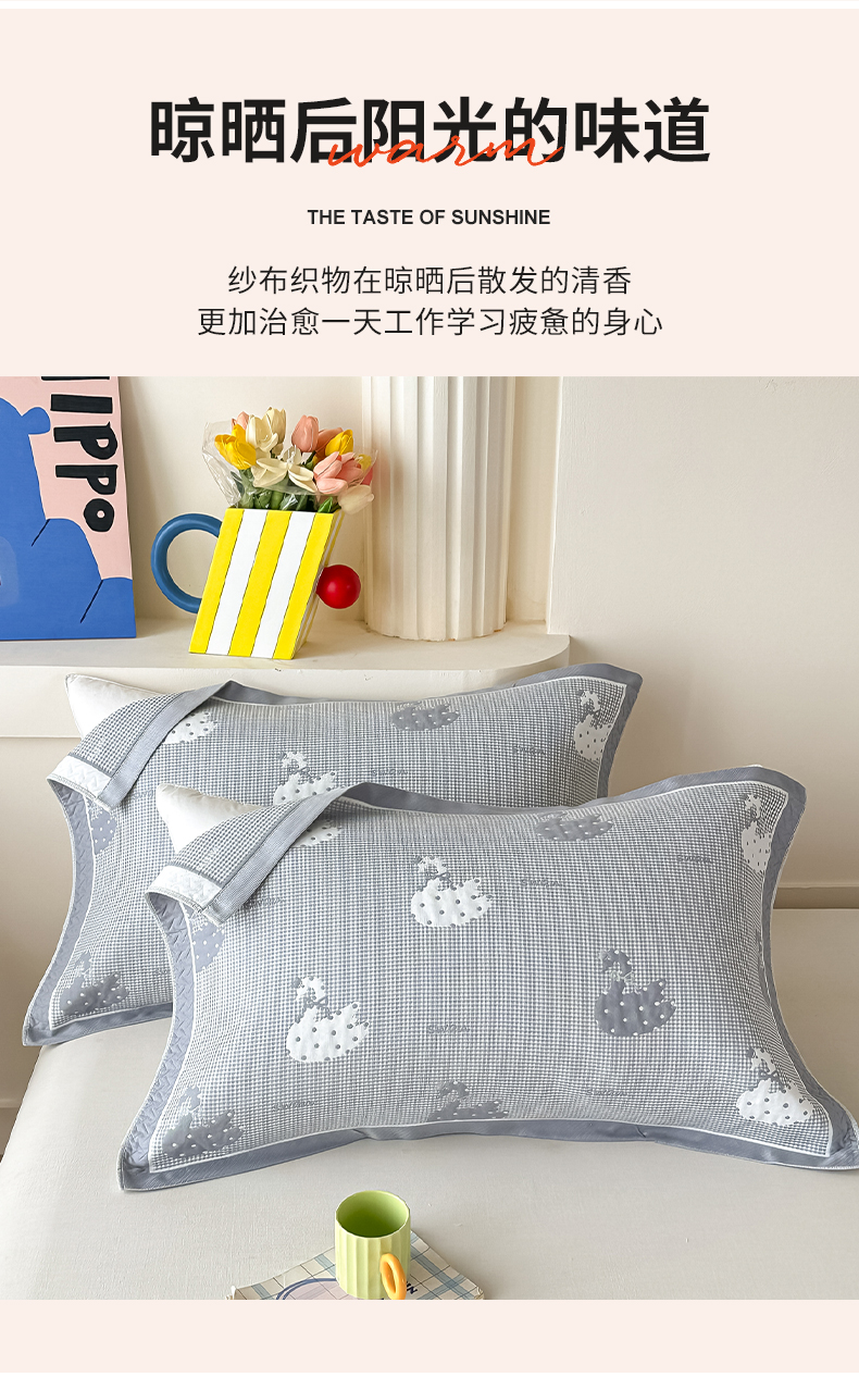 沐瑟家纺 2025新款亲肤柔软纱布小米格枕巾 小天鹅-浅灰色 52*78cm枕巾/对