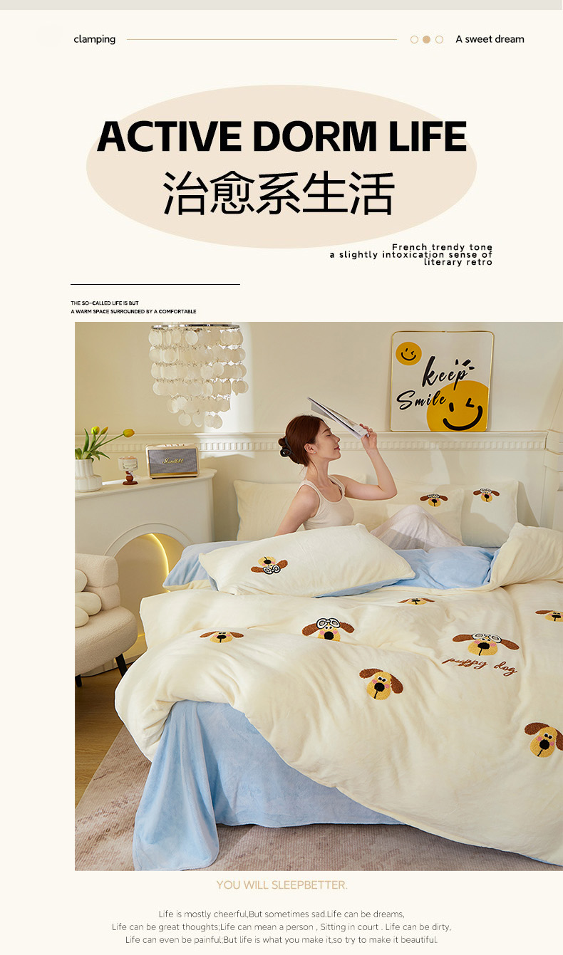 (总)楼兰公主毛毯专供 2025新款高克重230g牛奶绒数码印花毛巾绣卡通四件套,布拉拉,腊肠狗,奶油熊,淘气狗,小粉猫,小男孩,小苹果,小企鹅