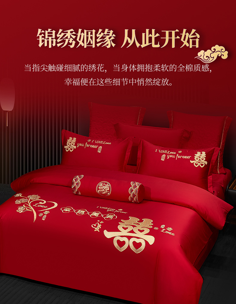 浩情国际婚庆供货中心 2026新款100%全棉纯棉新中式刺绣大红结婚婚庆四件套多件套 HQ-幸福美满