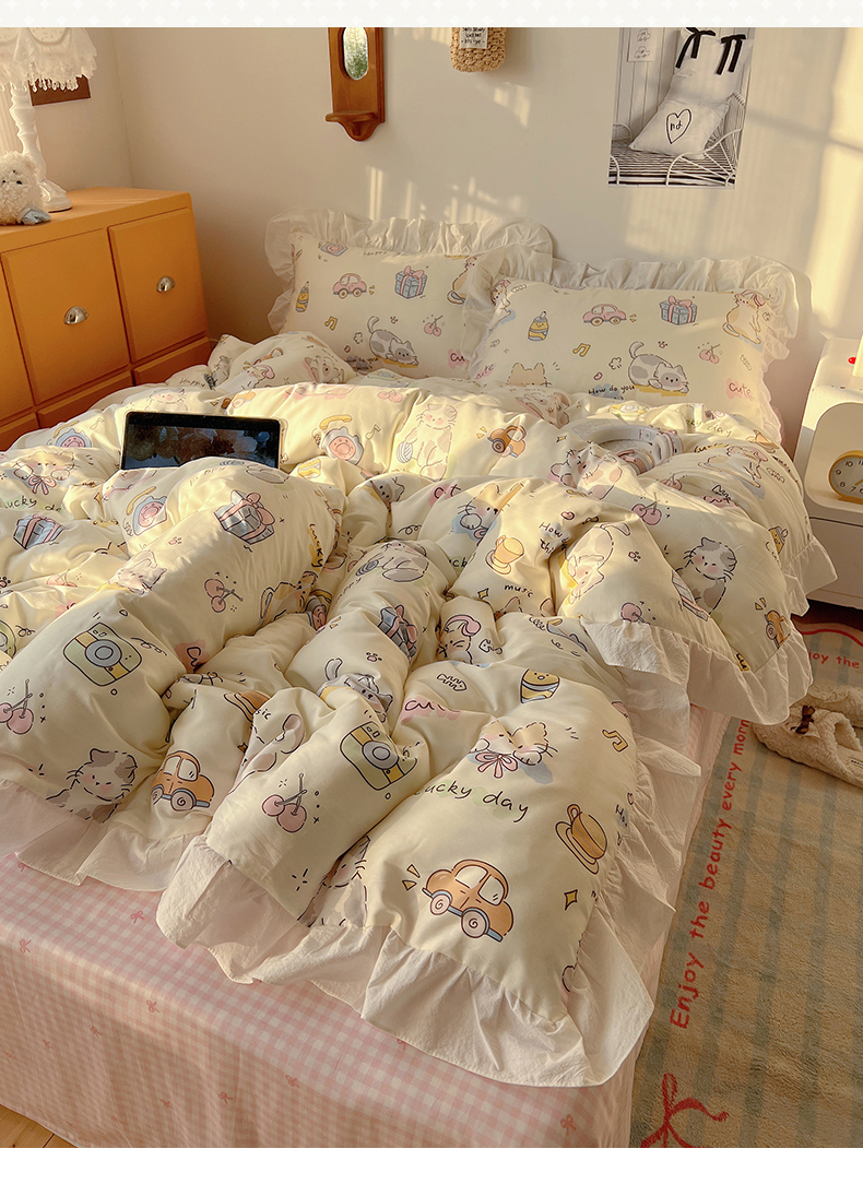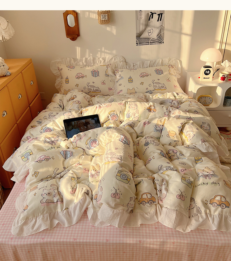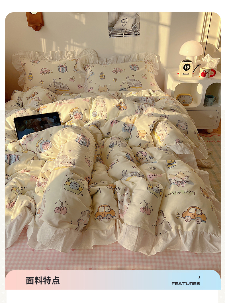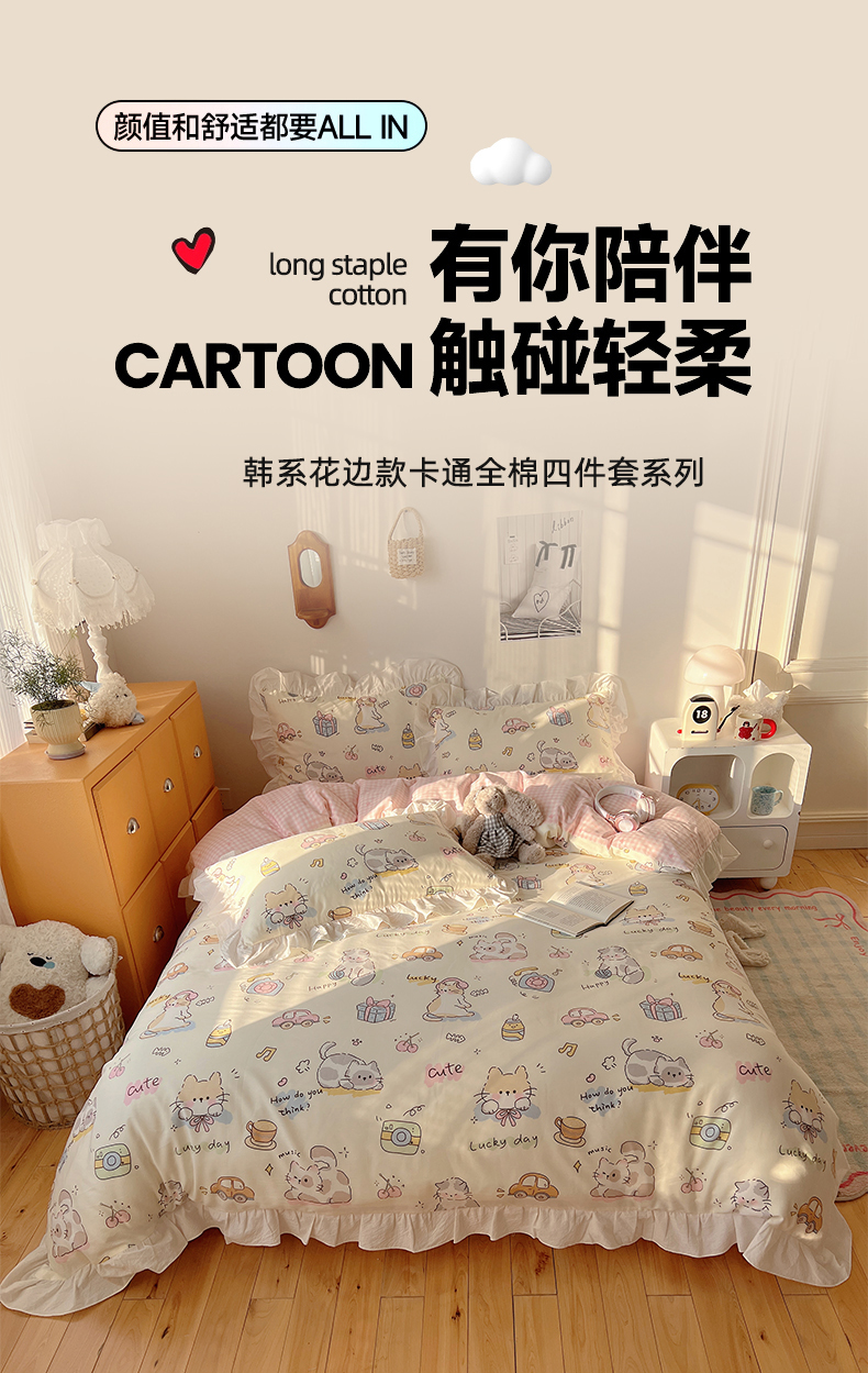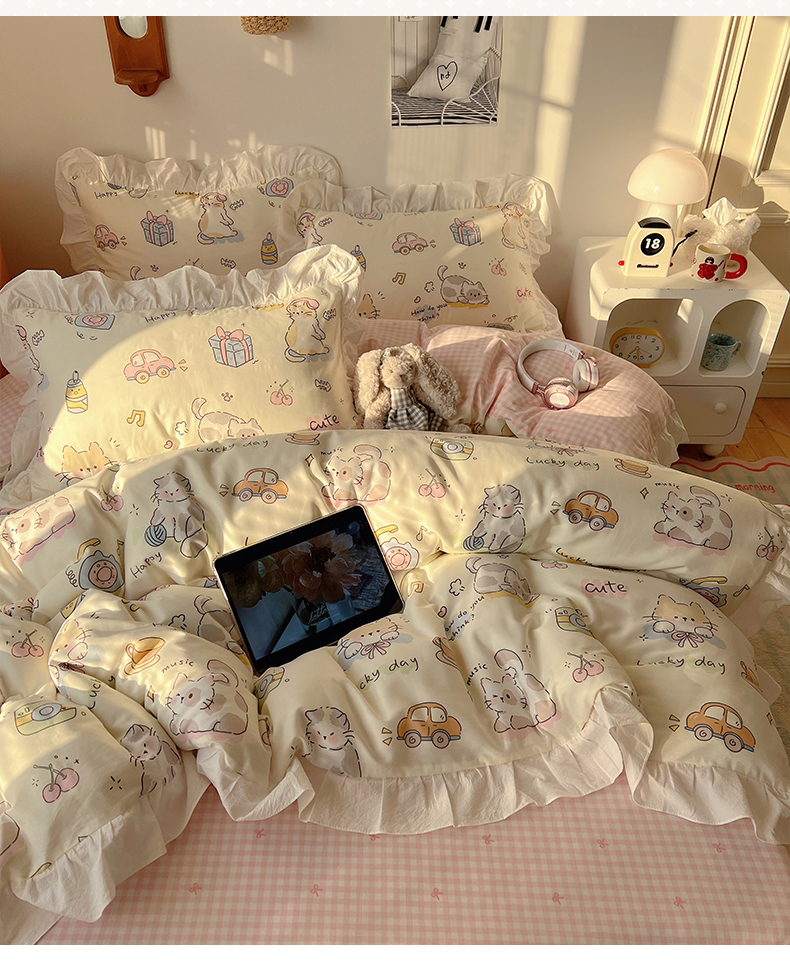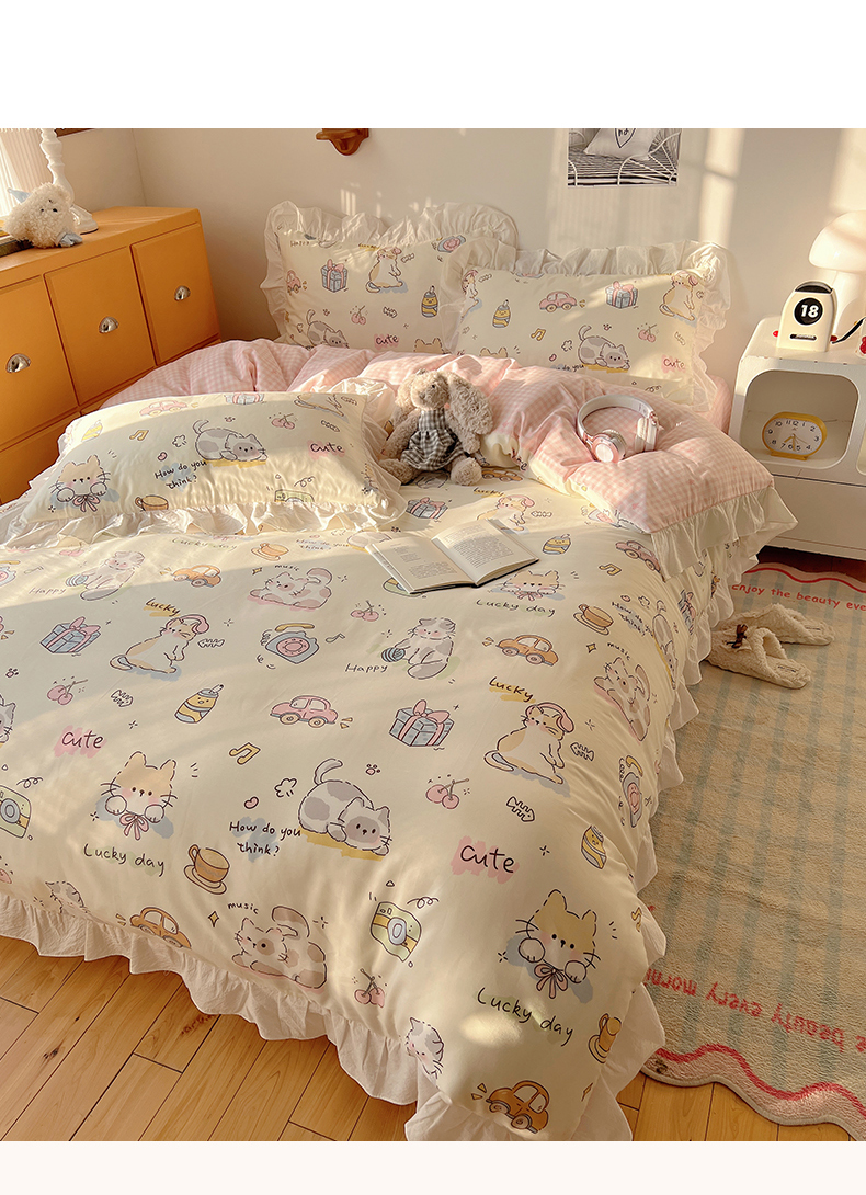 商品名称:六巷胡同 2026春夏新款韩系可爱风花边款卡通全棉四件套(第一系列) 花边猫咪聚会趴