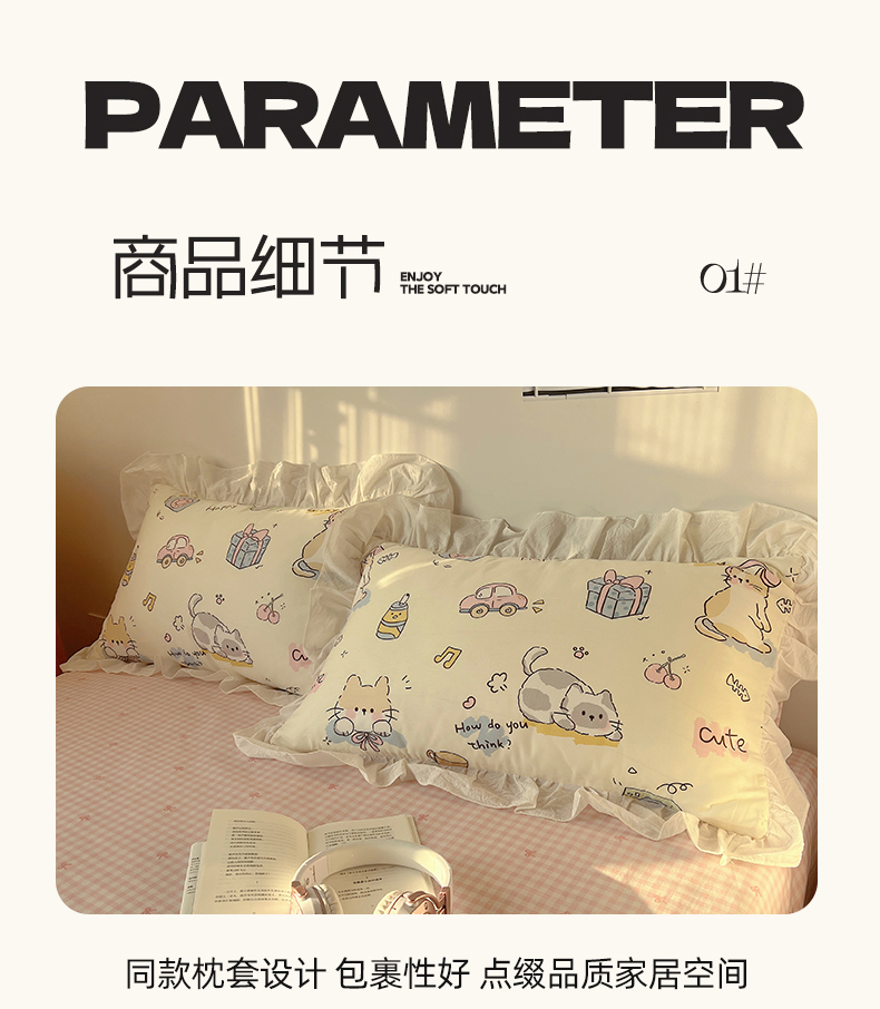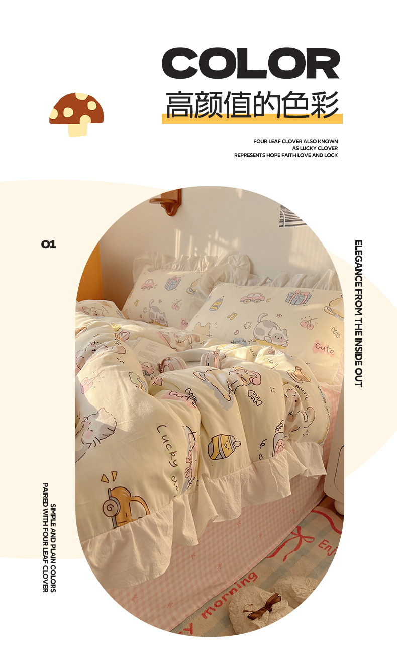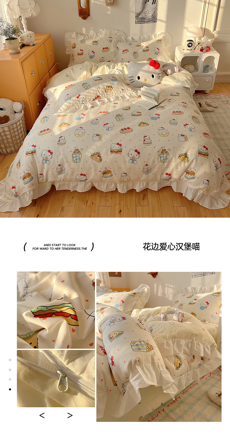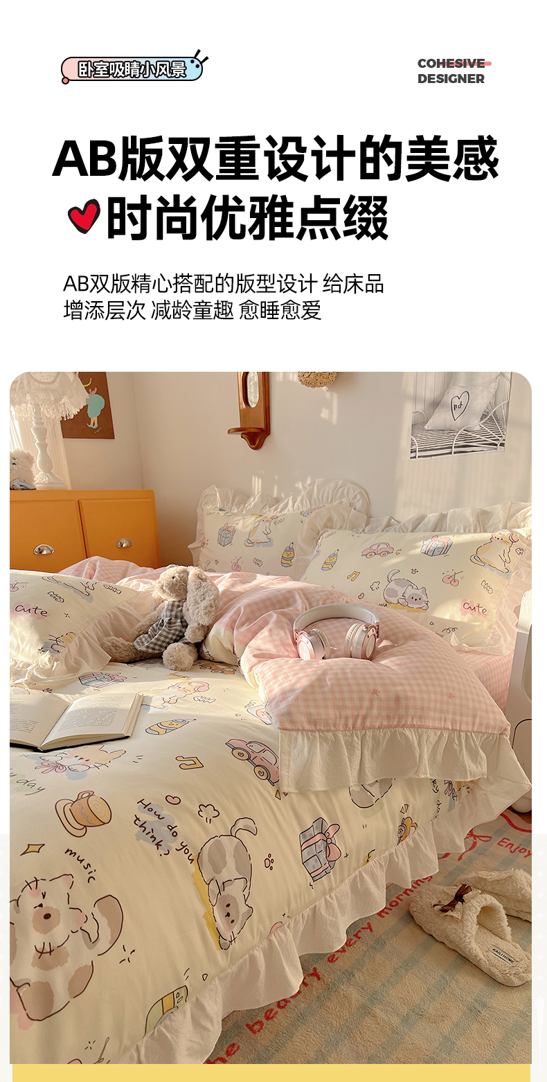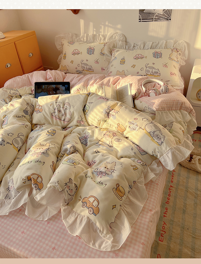 商品名称:六巷胡同 2026春夏新款韩系可爱风花边款卡通全棉四件套(第一系列) 花边猫咪聚会趴