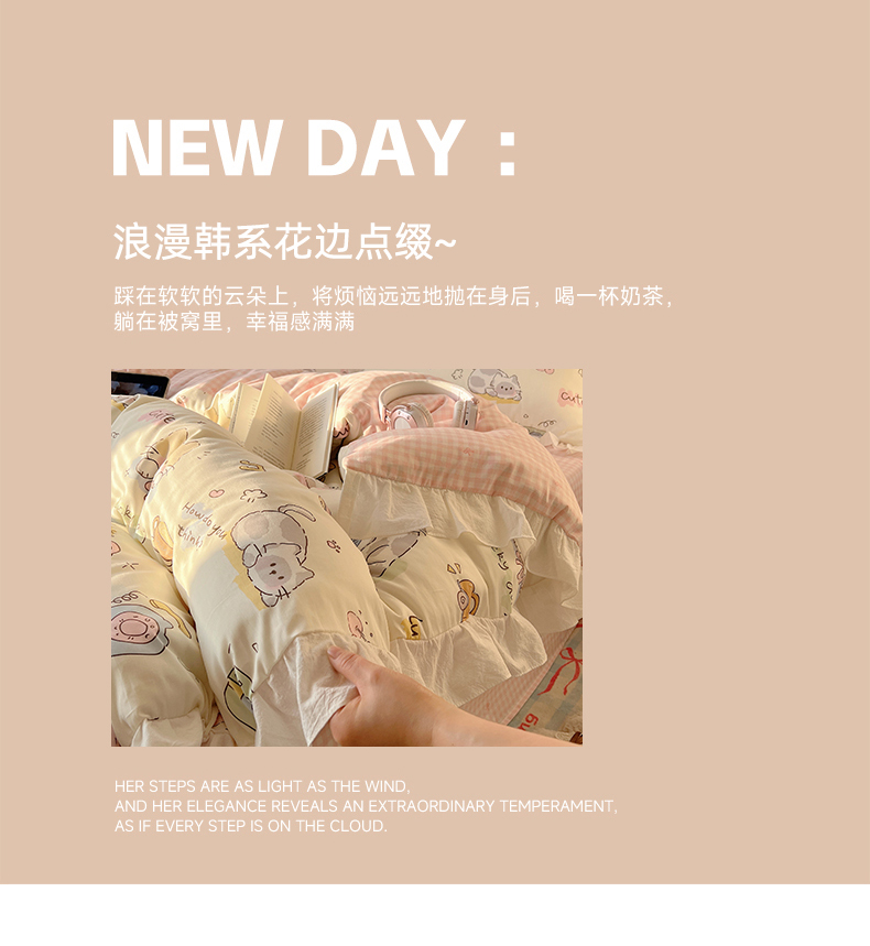 (总)六巷胡同 2026春夏新款韩式INS减龄花边款全棉卡通四件套,花边洋气柯基崽,花边欢乐课堂趴,花边假日庄园兔,花边蓝格奶油狗,花边浪漫碎花犬,花边秘境花园熊,花边奶油甜心熊