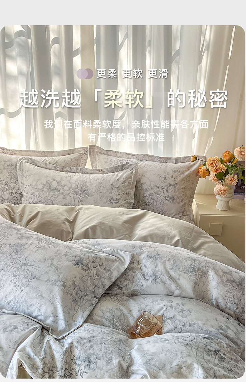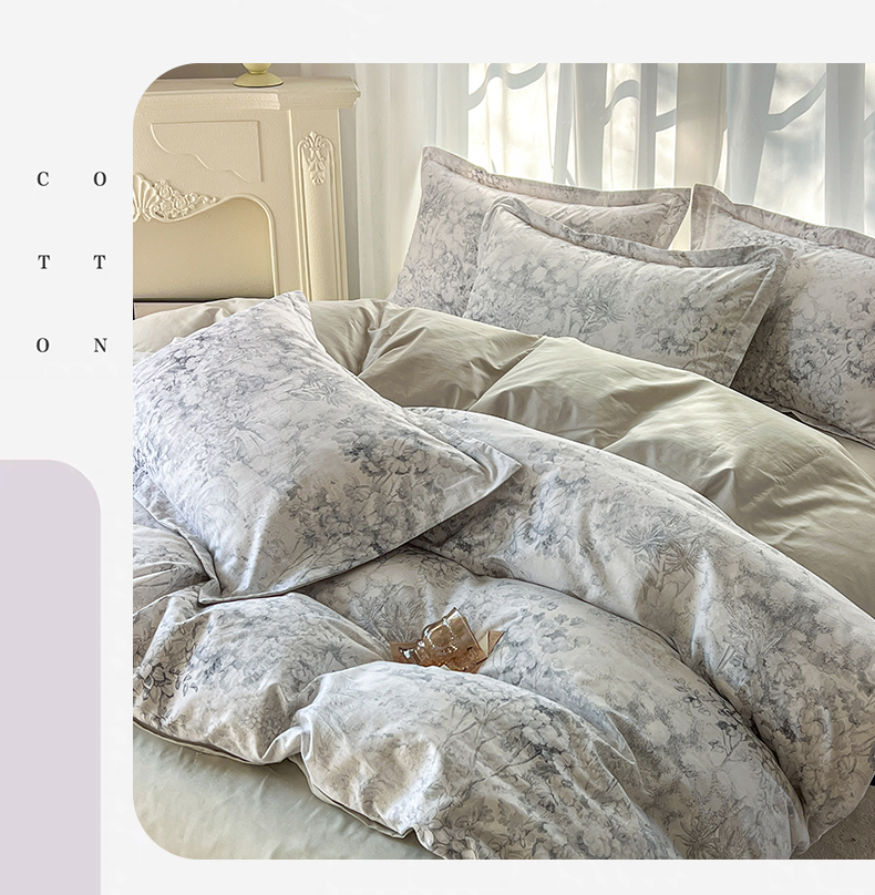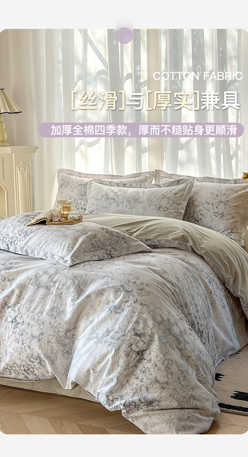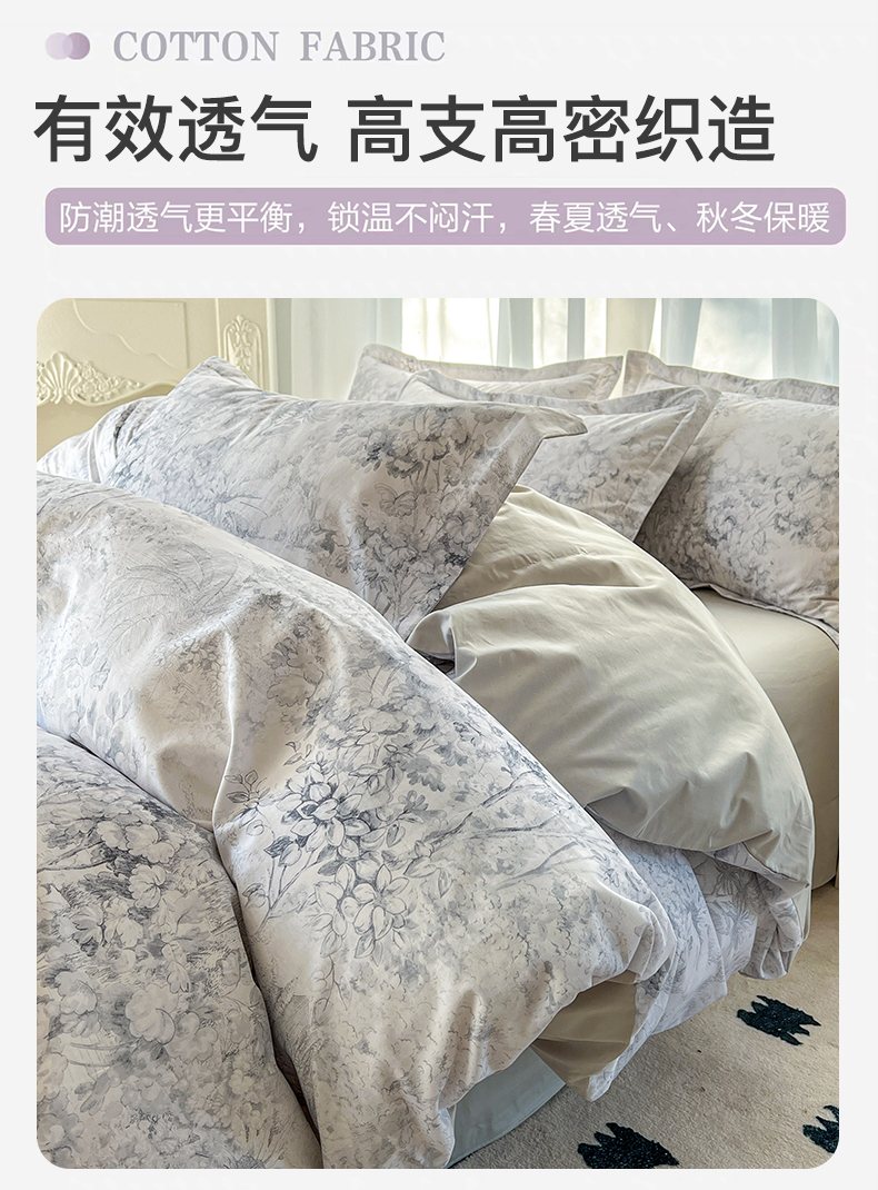 卧趣家纺 2026新款纯棉花卉系列全棉印花四件套 清珞-灰