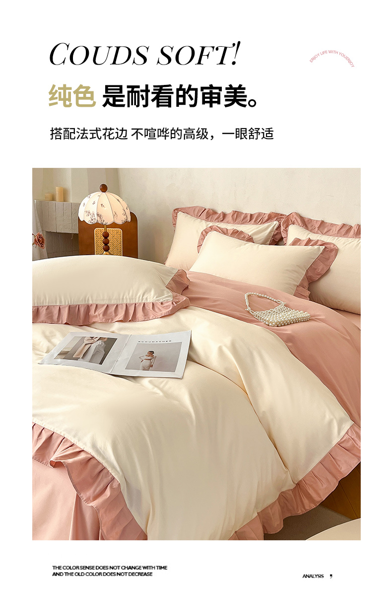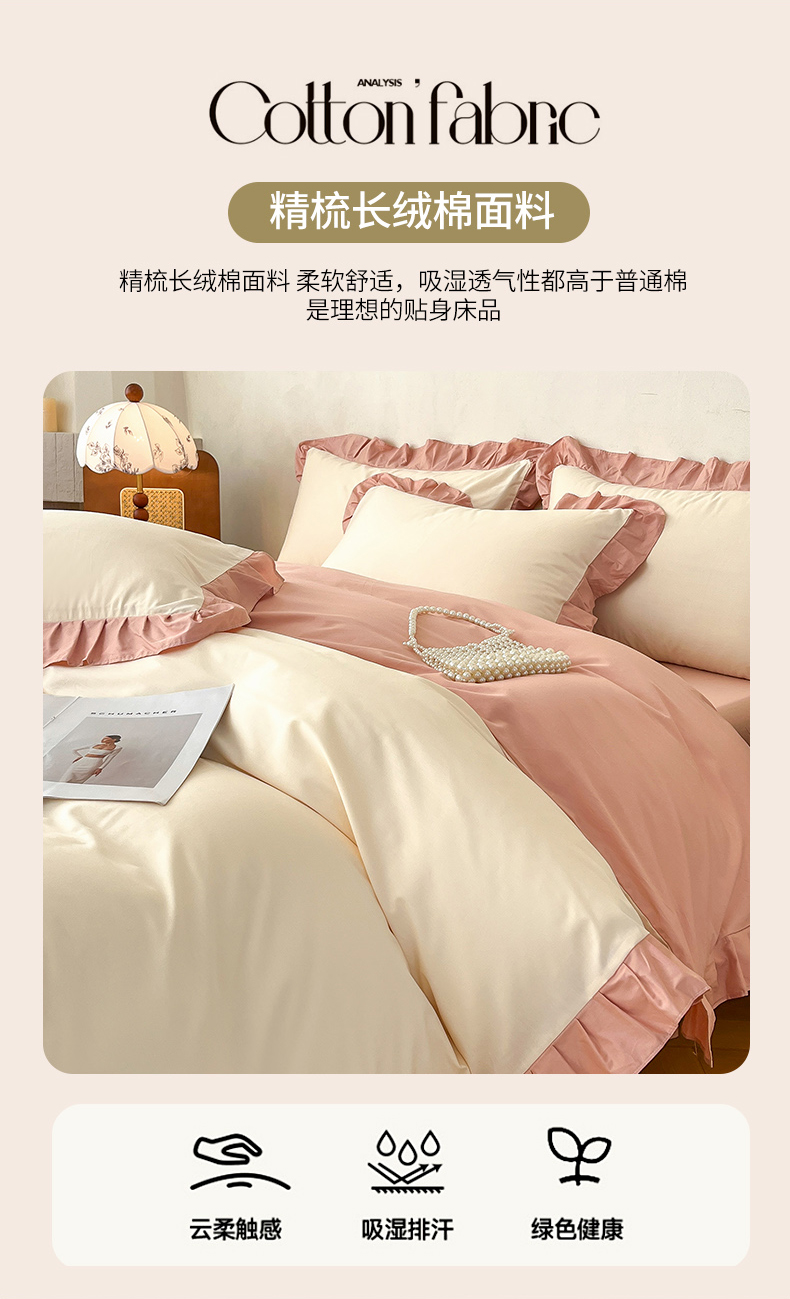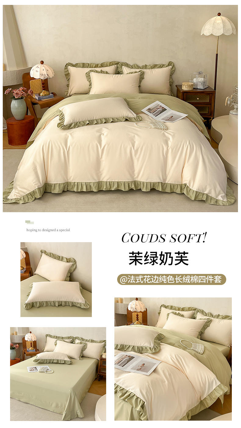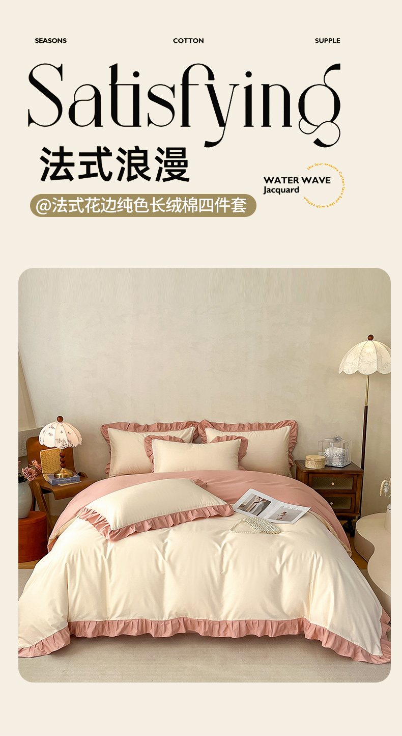 当前位置: 91家纺网 > 商品网购 > 床品套件 > 四件套 > 全棉普通四件套 > 艾迪尚家纺 2026新款法式韩版荷叶边纯色长绒棉四件套 奶芙慕粉