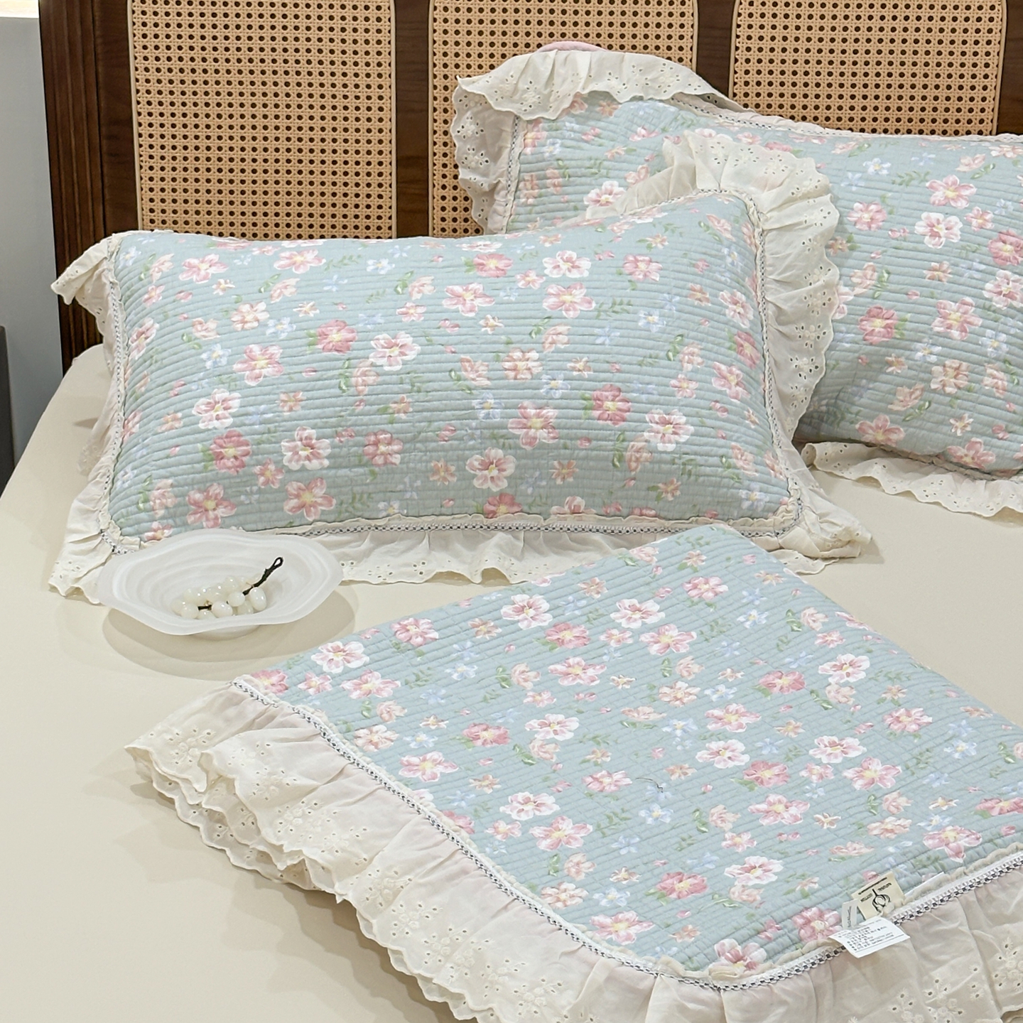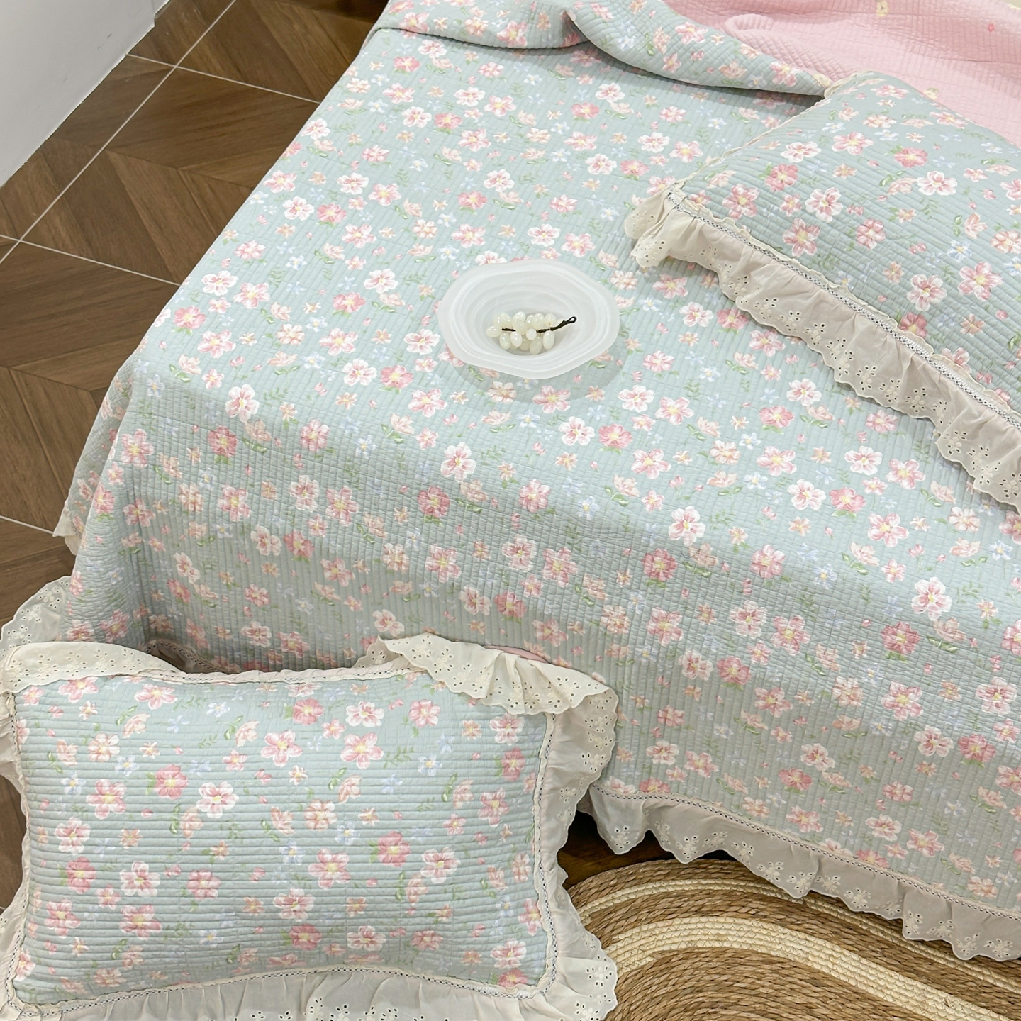 商品名称:床盖工厂店 2025新款法式双面全面填充棉花床盖三件套 恋恋花开-绿