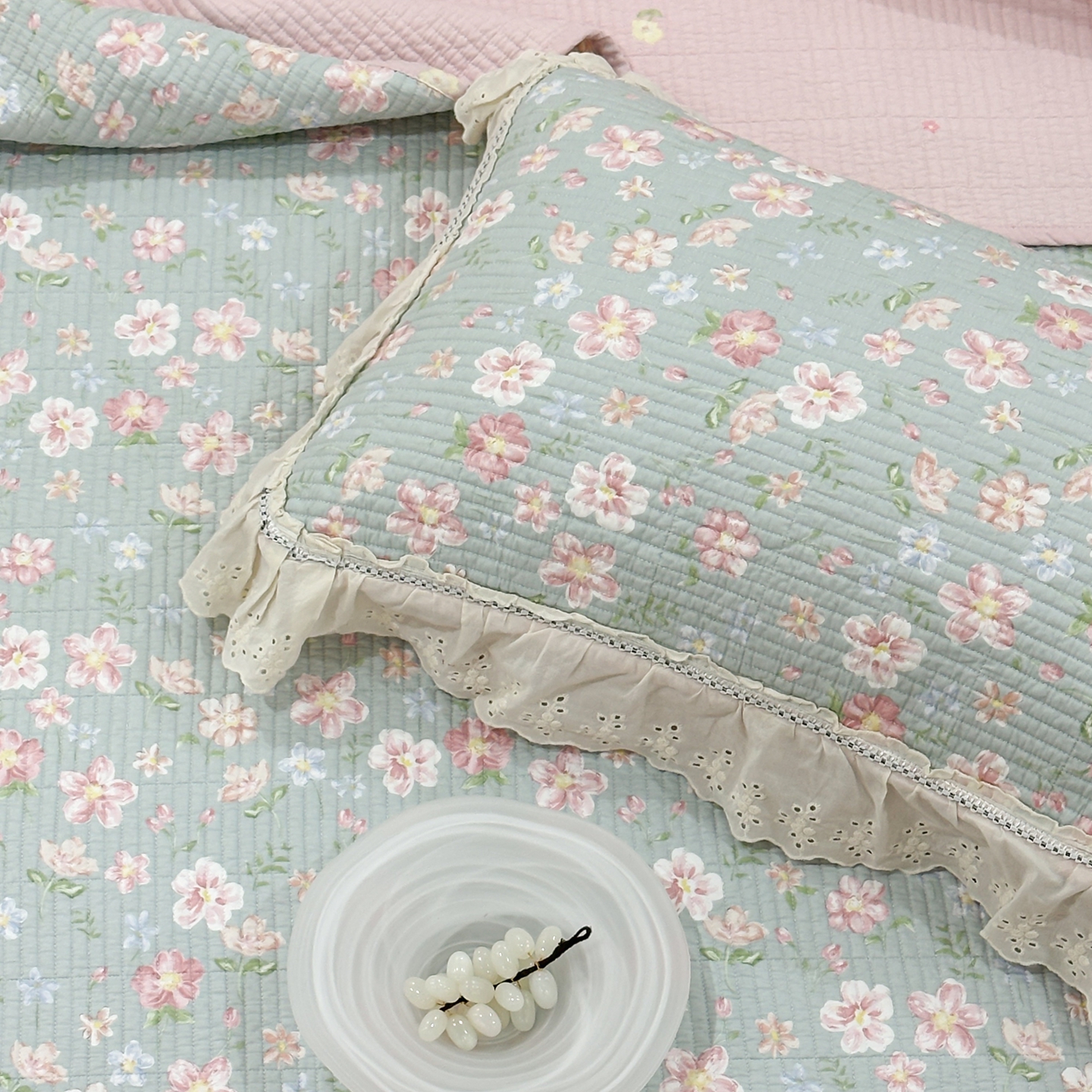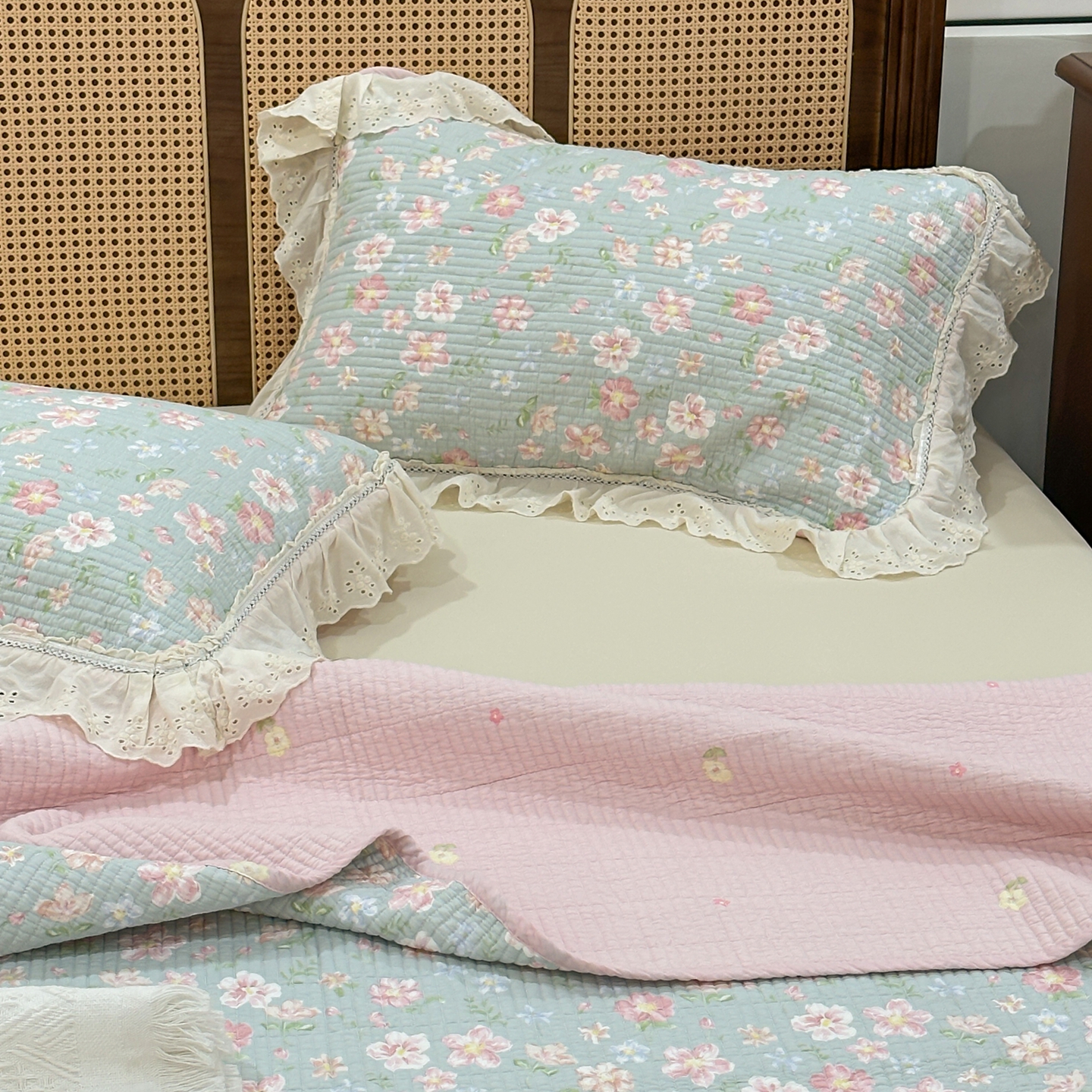 (总)床盖工厂店 2026新款双面水洗全棉填充棉花床盖三件套-欧瑞系列,欧瑞-粉,欧瑞-绿,欧瑞-米,组合图