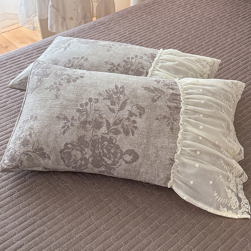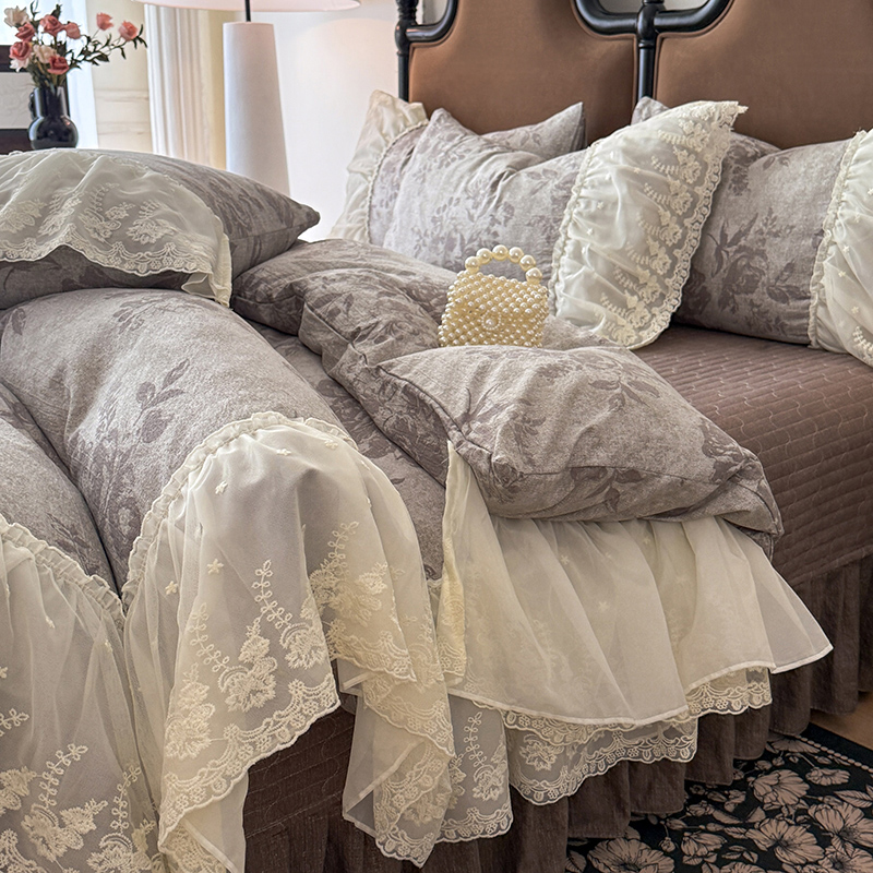 苏米娜2026春夏新款法式复古双层花边大蕾丝水洗棉亚麻床盖款四件套全棉纯棉印花小碎花四件套 巴洛克灰
