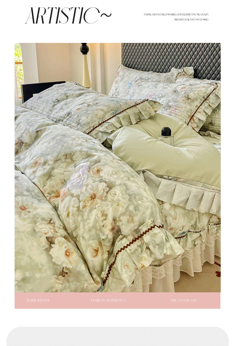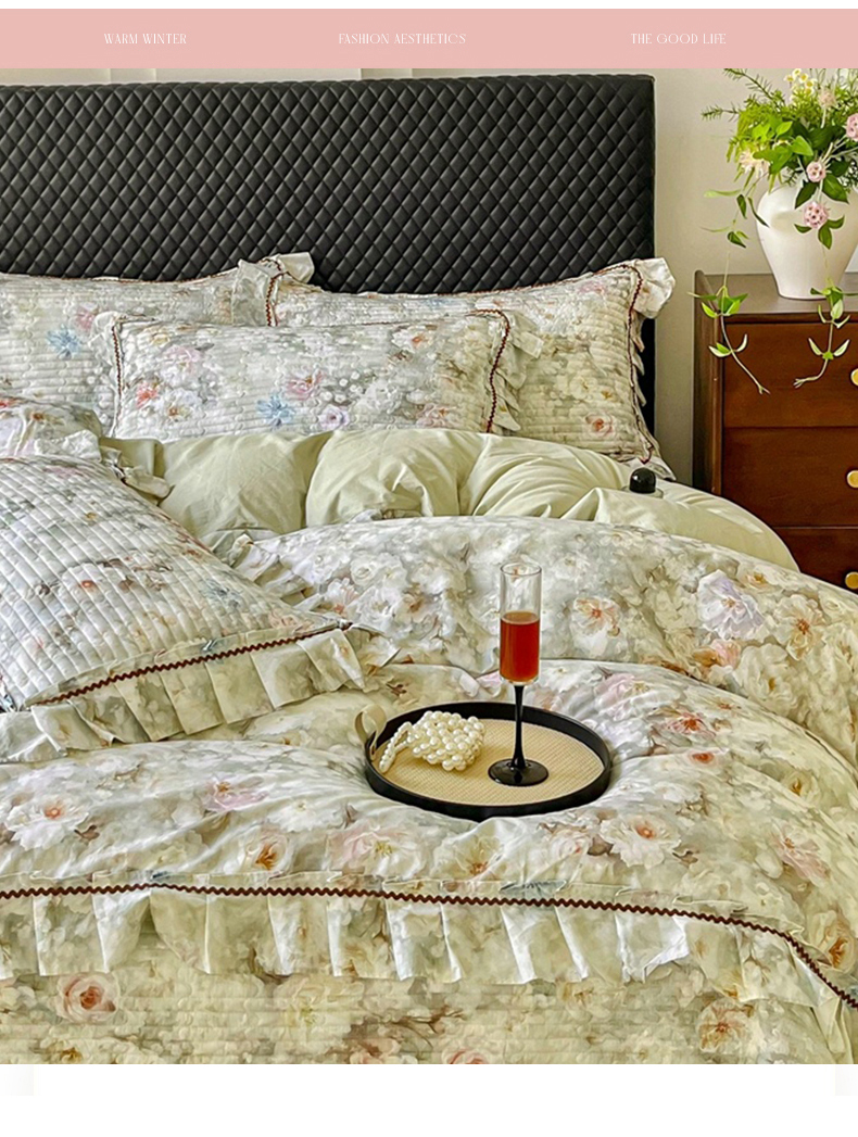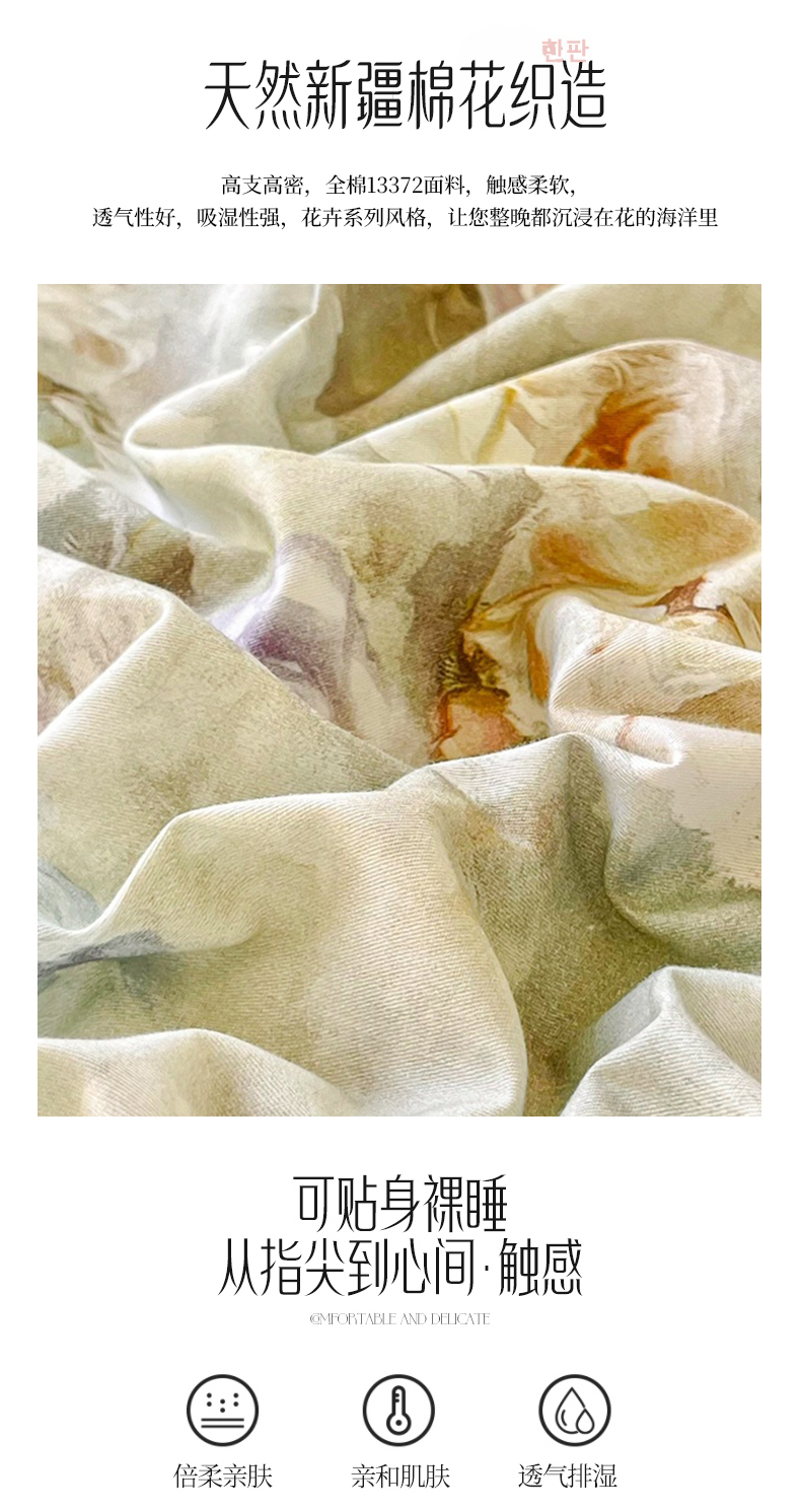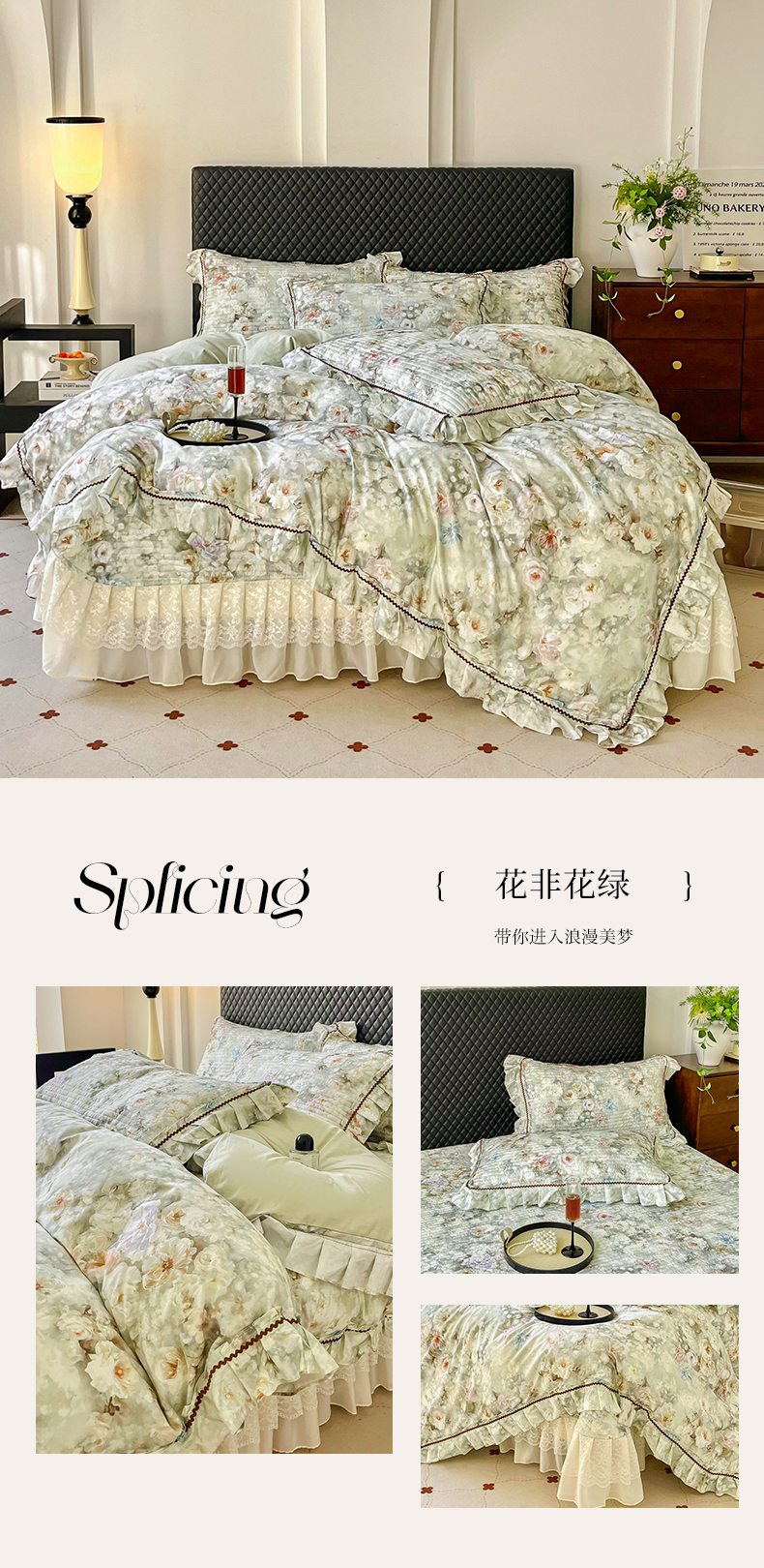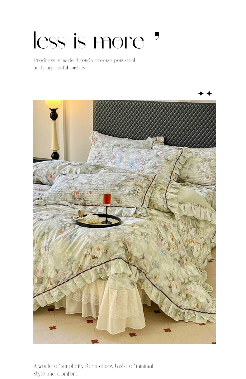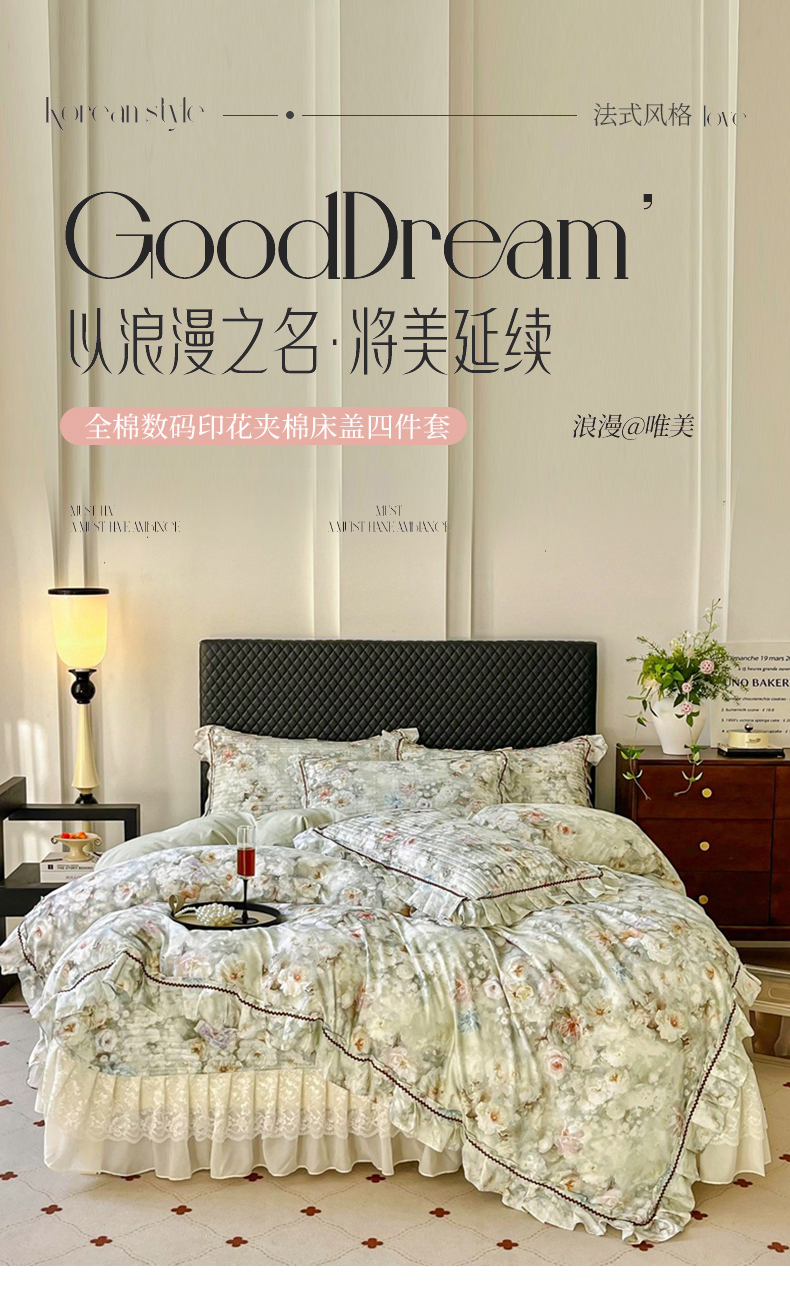 商品名称:胜权家纺 2026新款A类全棉法式13372数码印花夹棉床盖四件套系列 花非花绿