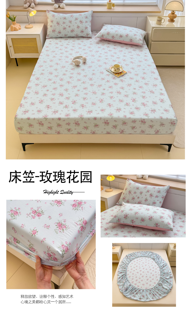 • 91家纺网 家纺一手货源 找家纺 爱多多家居 2026新款针织棉双层纱床笠 床笠三件套  床笠-玫瑰花园
