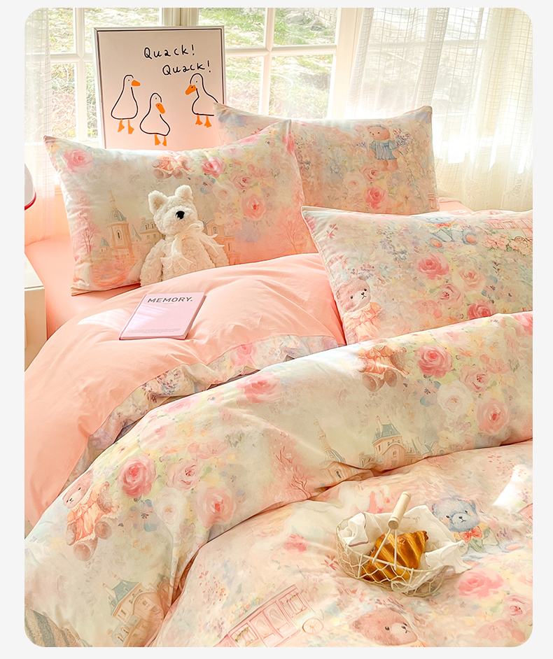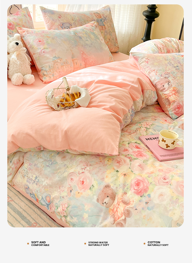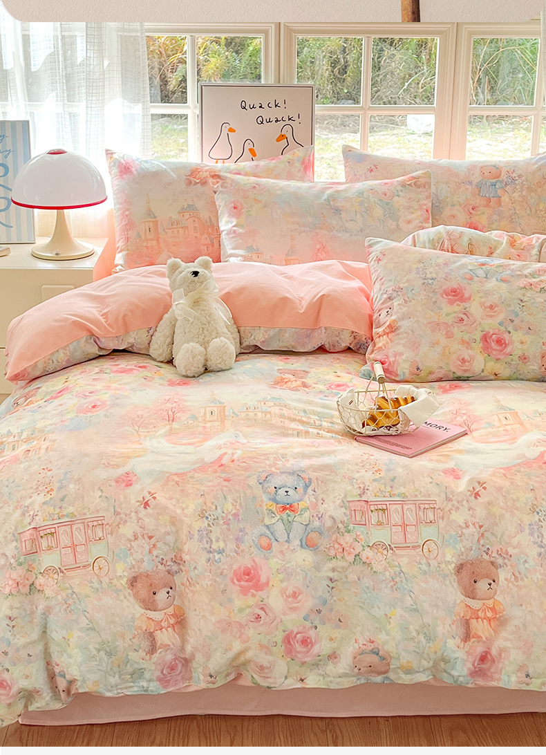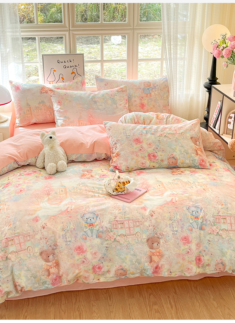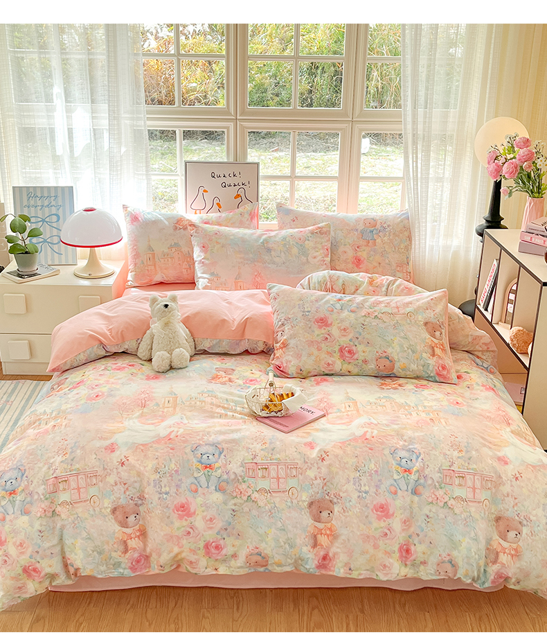 商品名称:睡美美家纺 2026新款13070数码印花全棉纯棉动物卡通三件套四件套 熊仔的玫瑰园