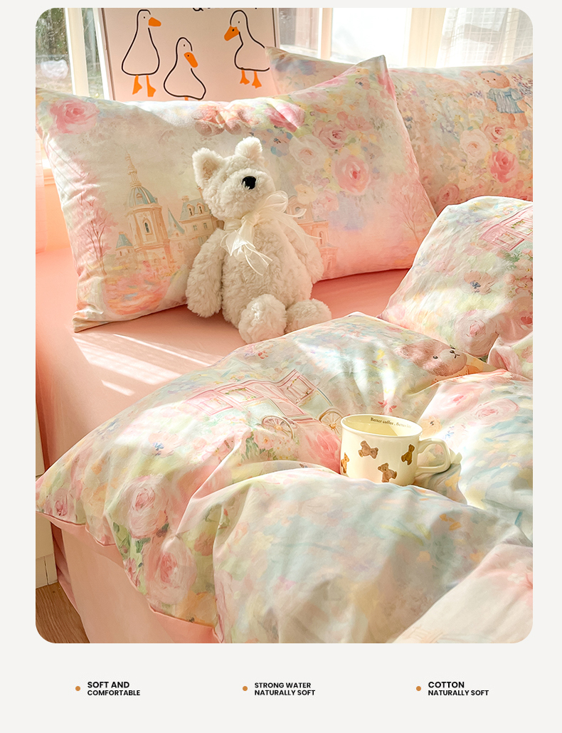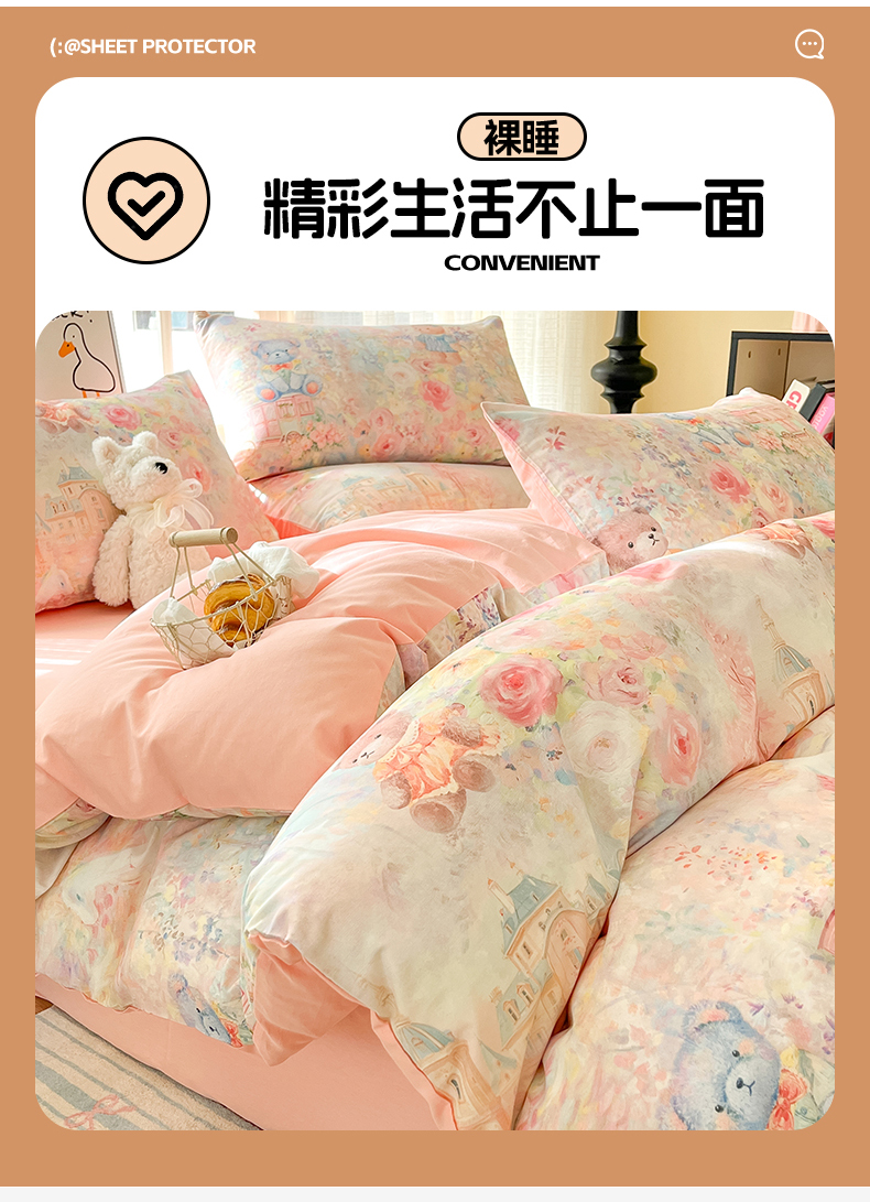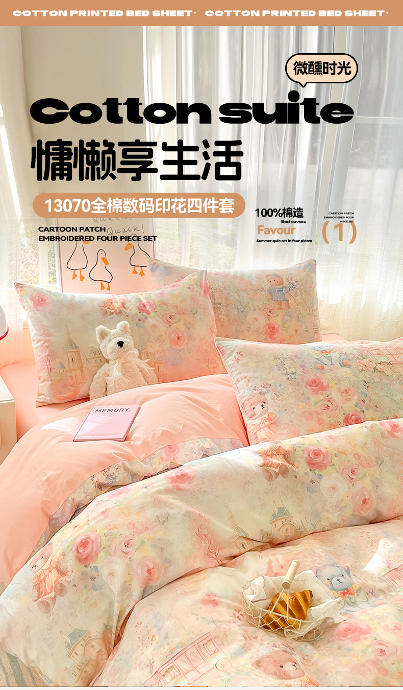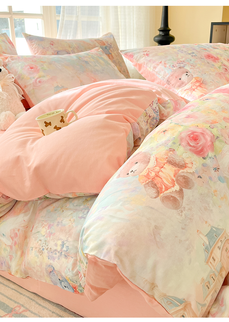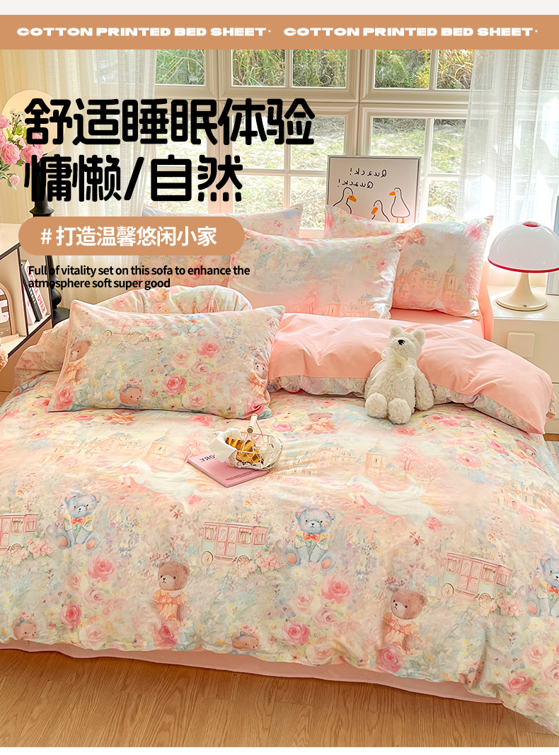商品名称:睡美美家纺 2026新款13070数码印花全棉纯棉动物卡通三件套四件套 熊仔的玫瑰园