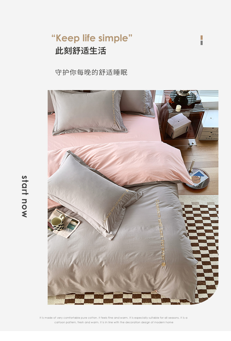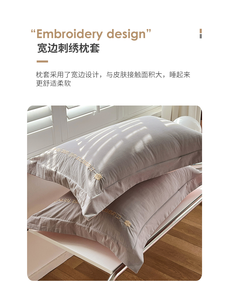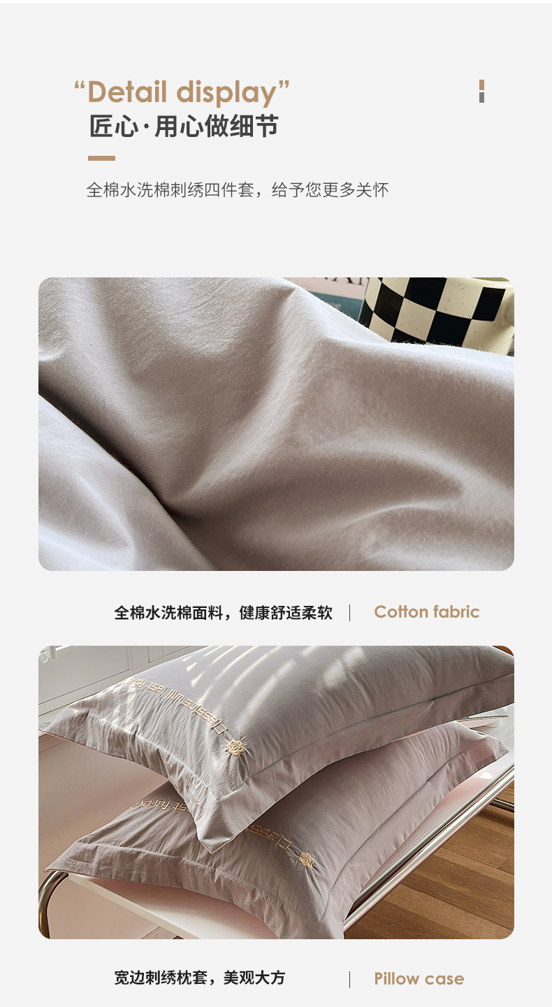 商品名称:拼社家纺 2026新款A类色织全棉水洗棉四件套纯棉四件套刺绣床上用品-漫系列 迷雾灰+玫瑰粉