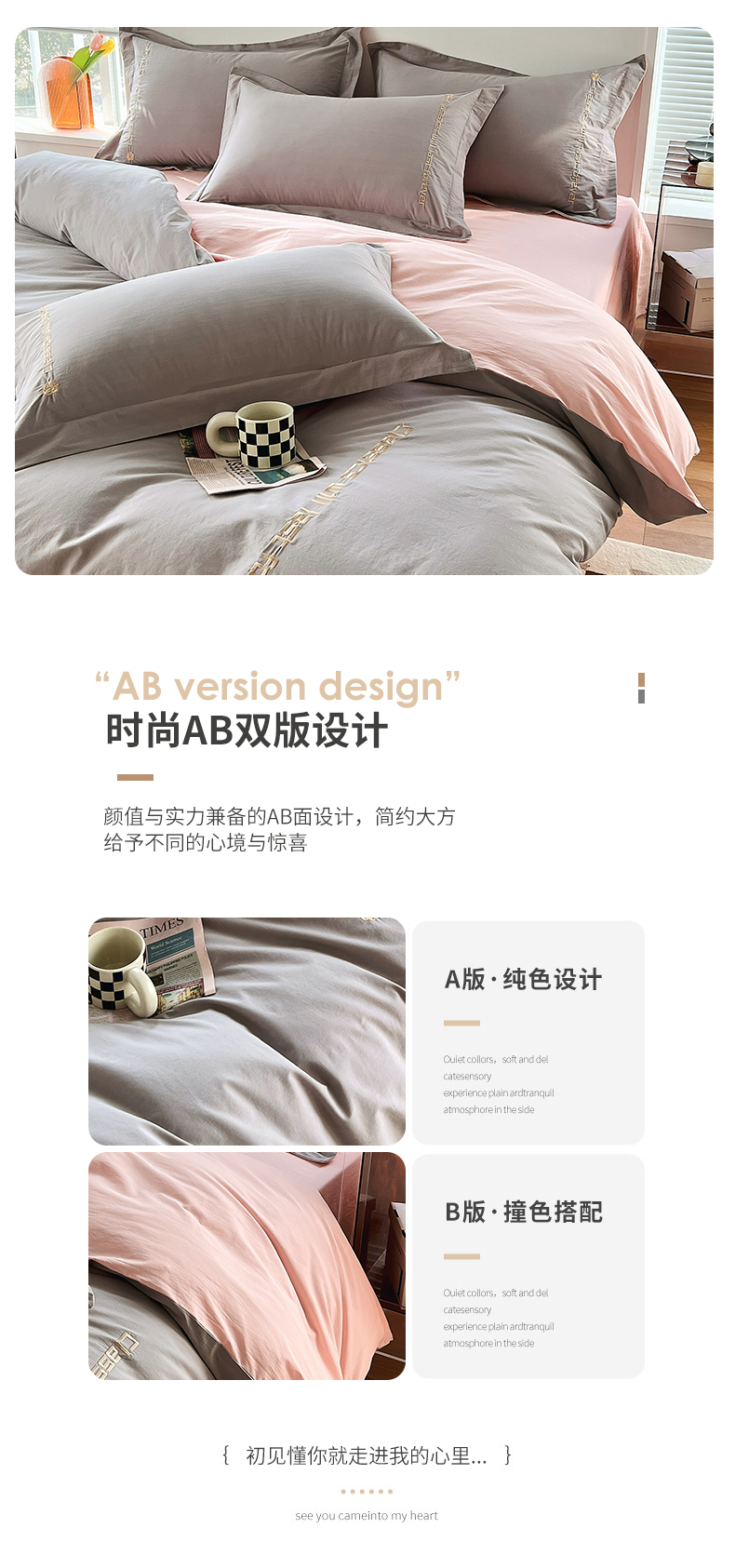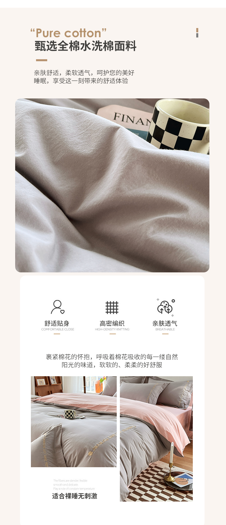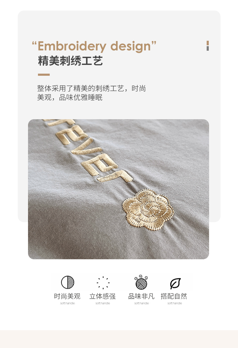 商品名称:拼社家纺 2026新款A类色织全棉水洗棉四件套纯棉四件套刺绣床上用品-漫系列 迷雾灰+玫瑰粉