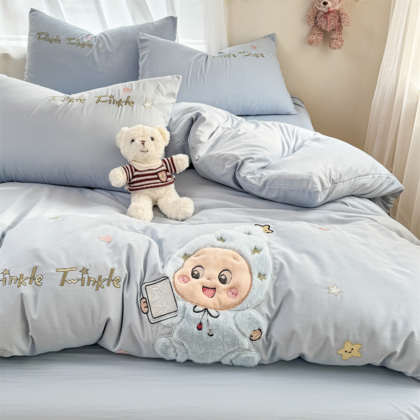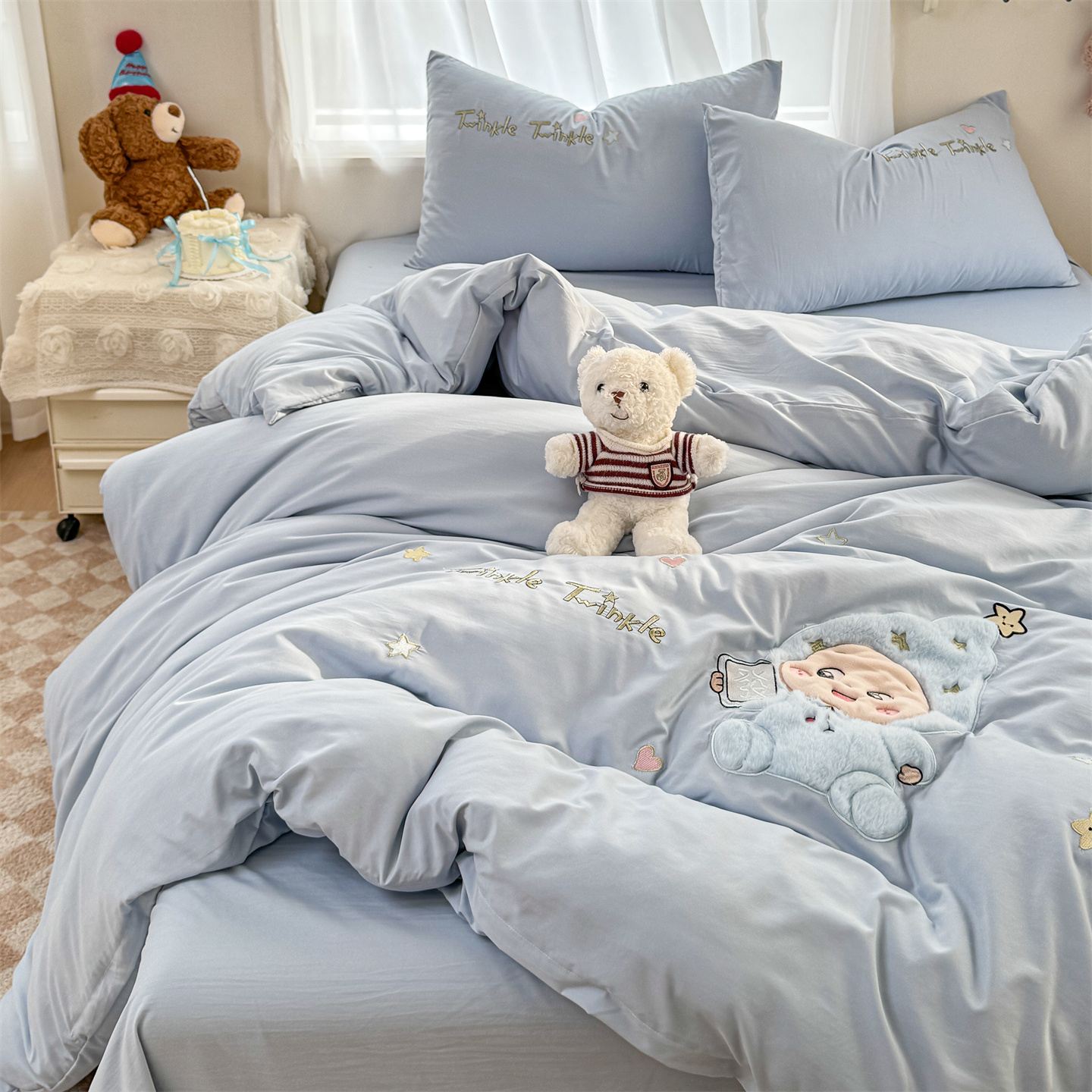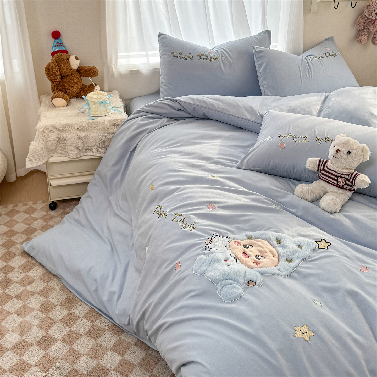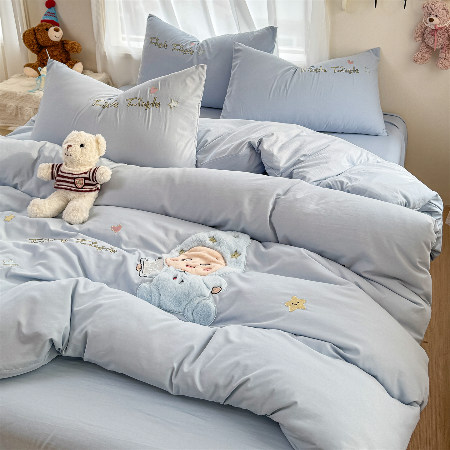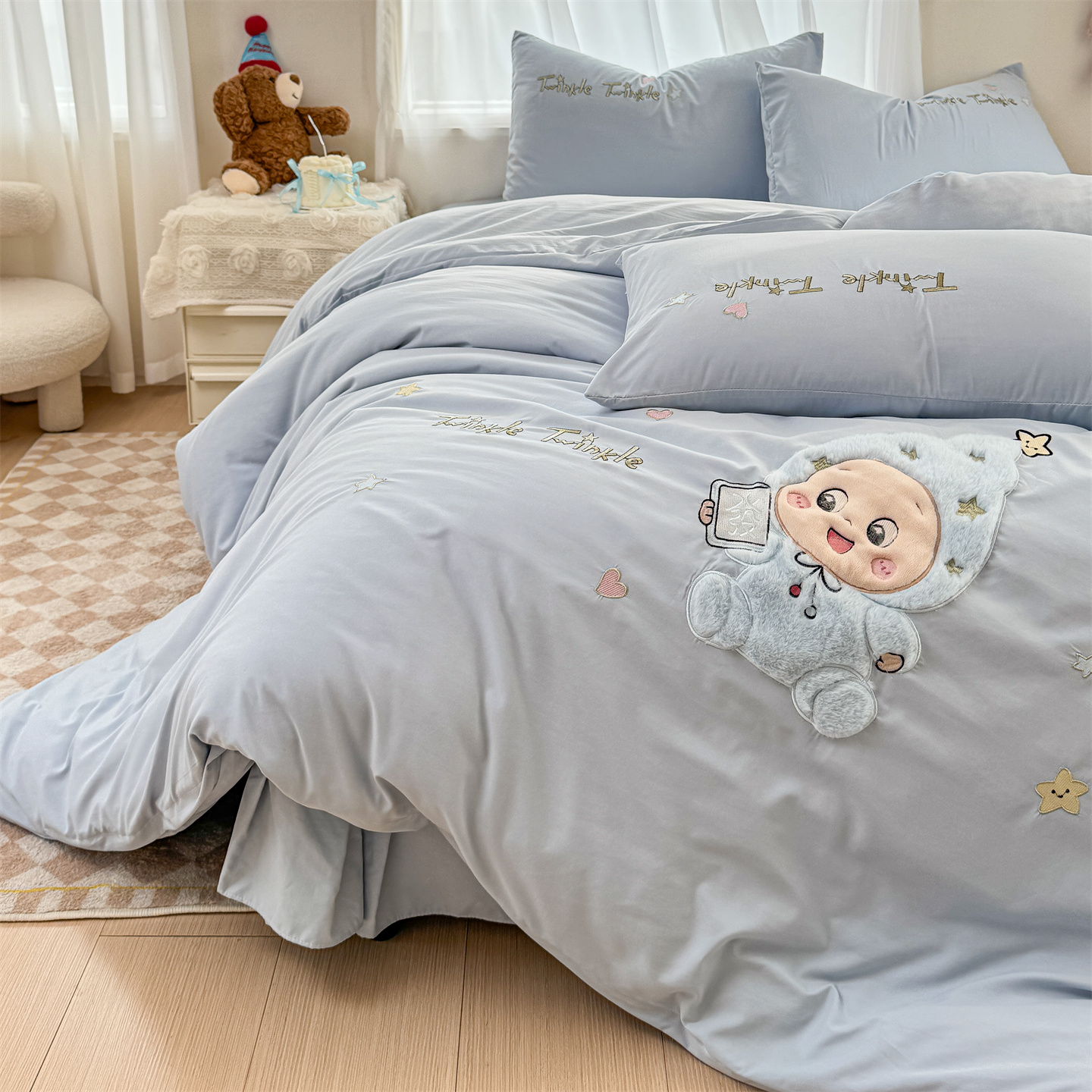 (总)橘子家 2026新款卡通绣花四件套,欢乐日记,梨好鸭,马上有福,咩咩羊,帕皮狗,泰迪狗,星星人,熊仔,有钱花