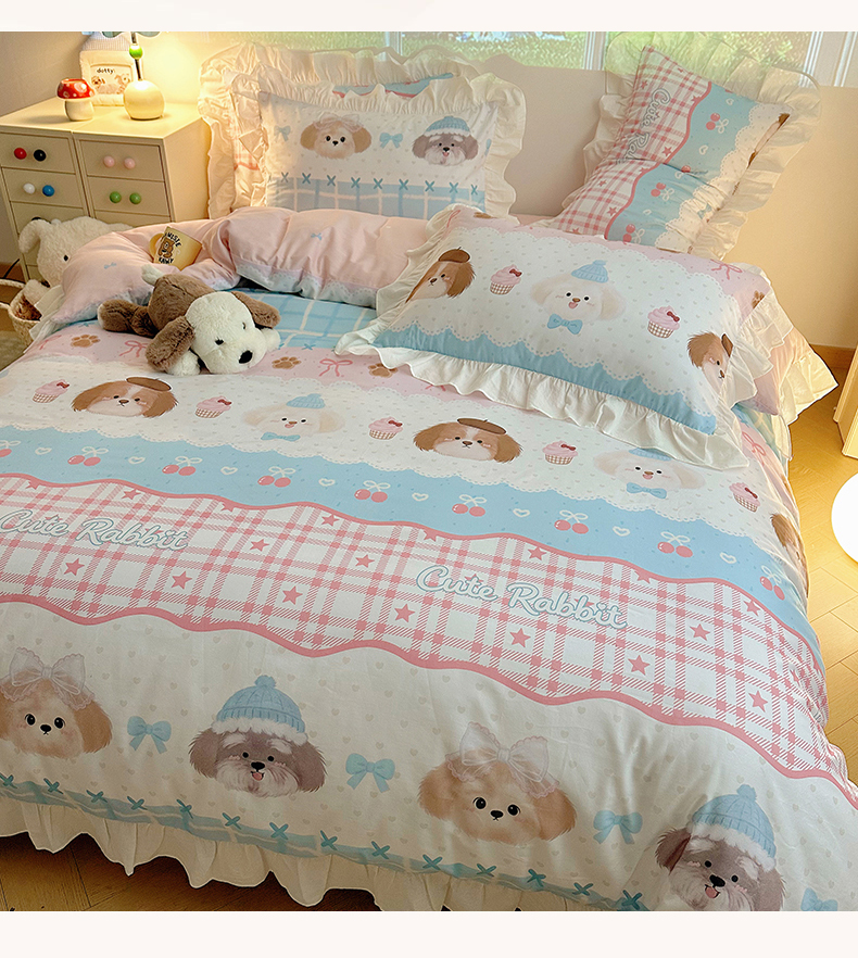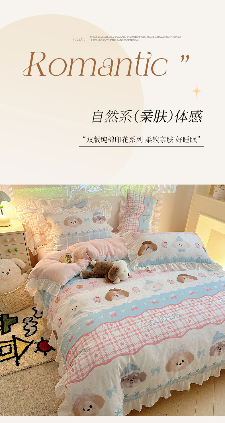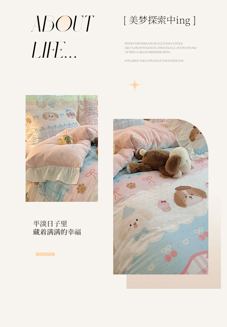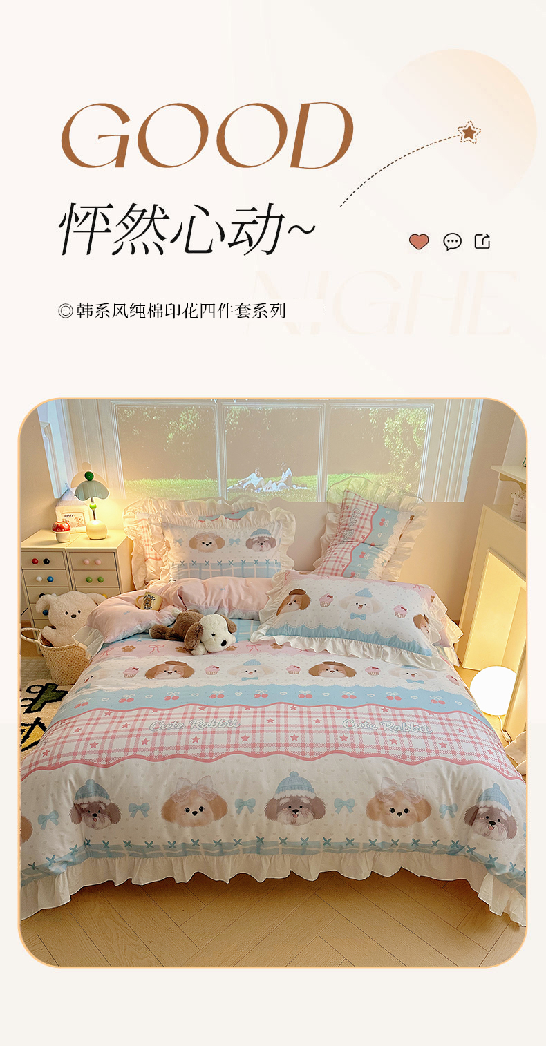 当前位置: 91家纺网 > 商品网购 > 床品套件 > 四件套 > 全棉普通四件套 > 孩子王家纺 2026新款韩式INS减龄小红书花边款全棉纯棉卡通四件套 花边小狗庄园