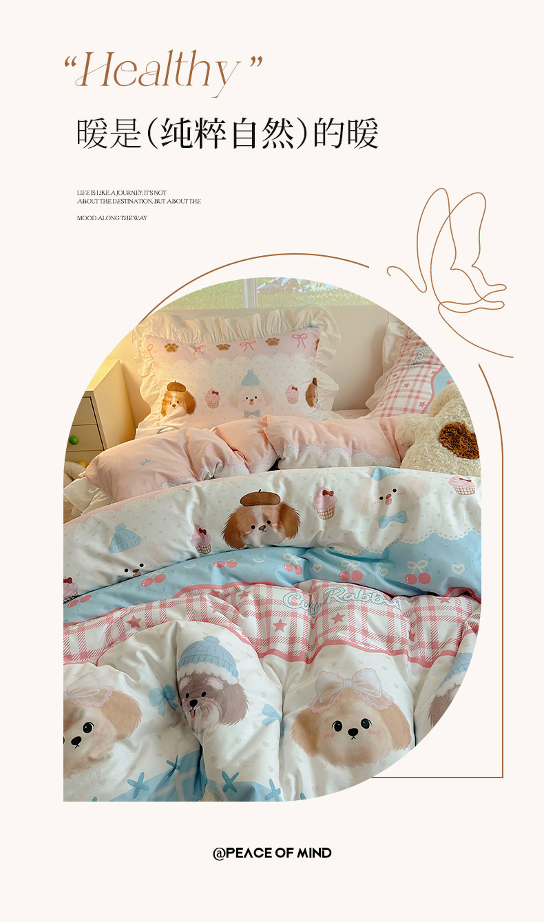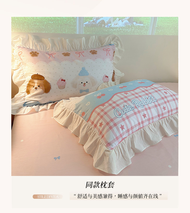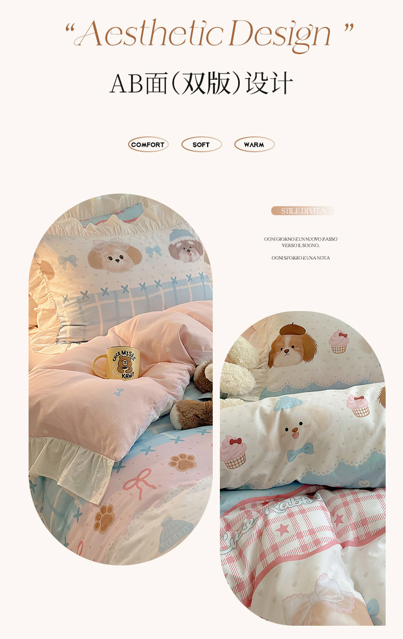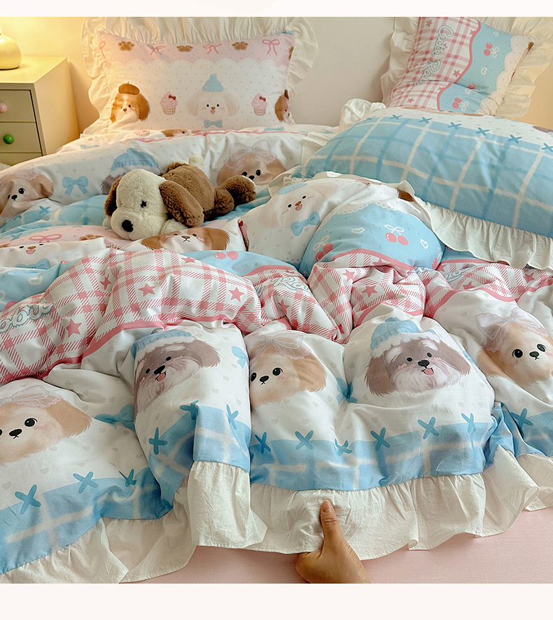 当前位置: 91家纺网 > 商品网购 > 床品套件 > 四件套 > 全棉普通四件套 > 孩子王家纺 2026新款韩式INS减龄小红书花边款全棉纯棉卡通四件套 花边小狗庄园