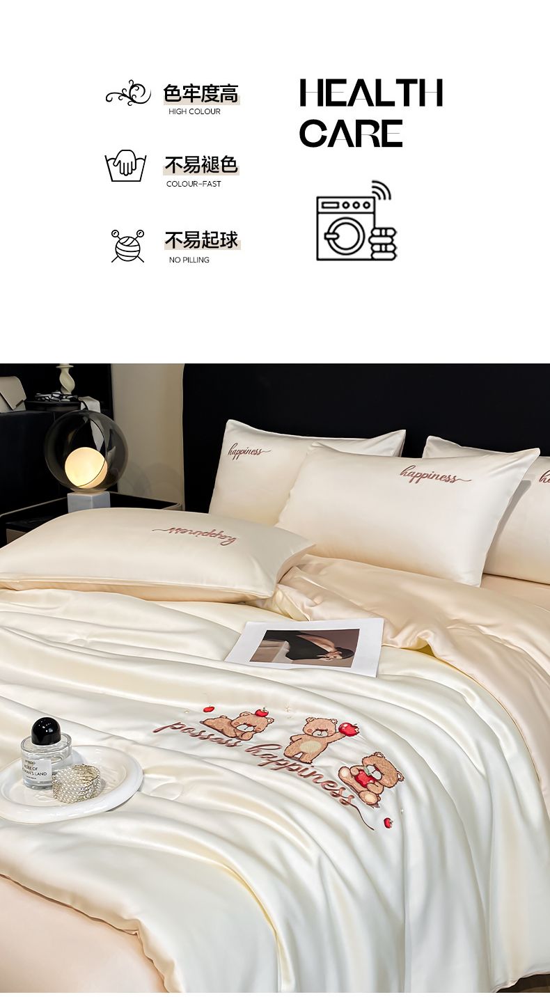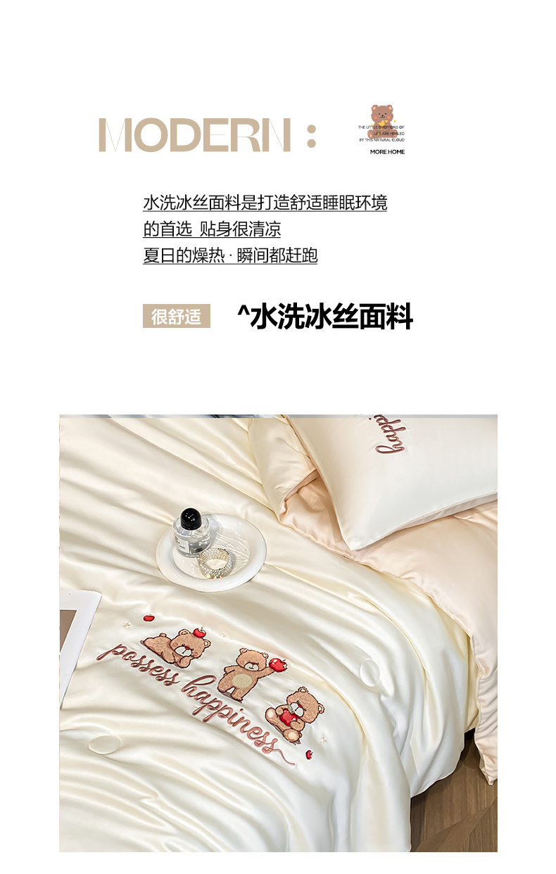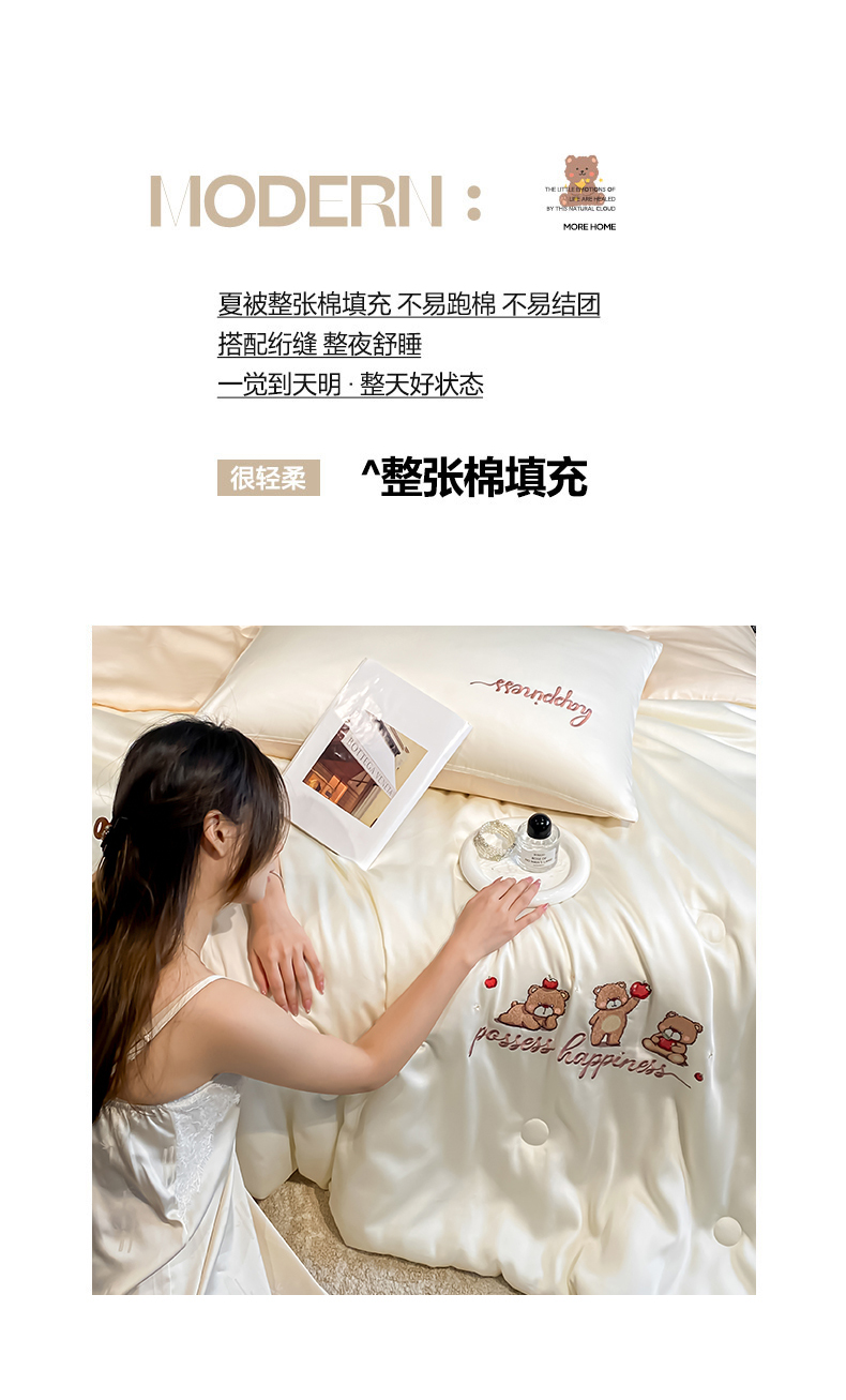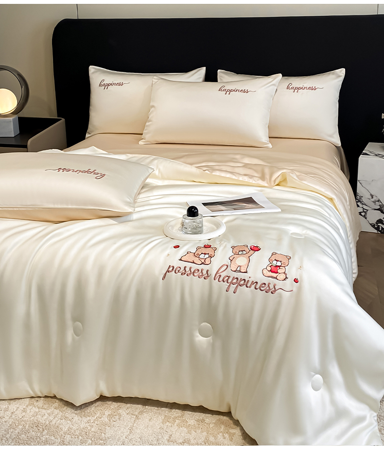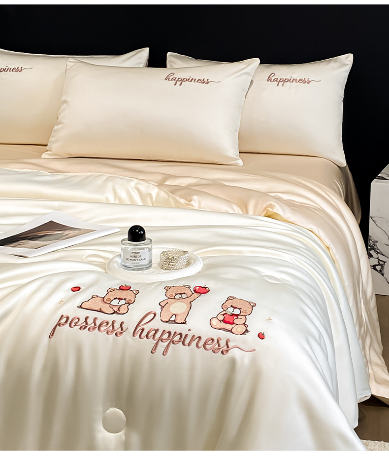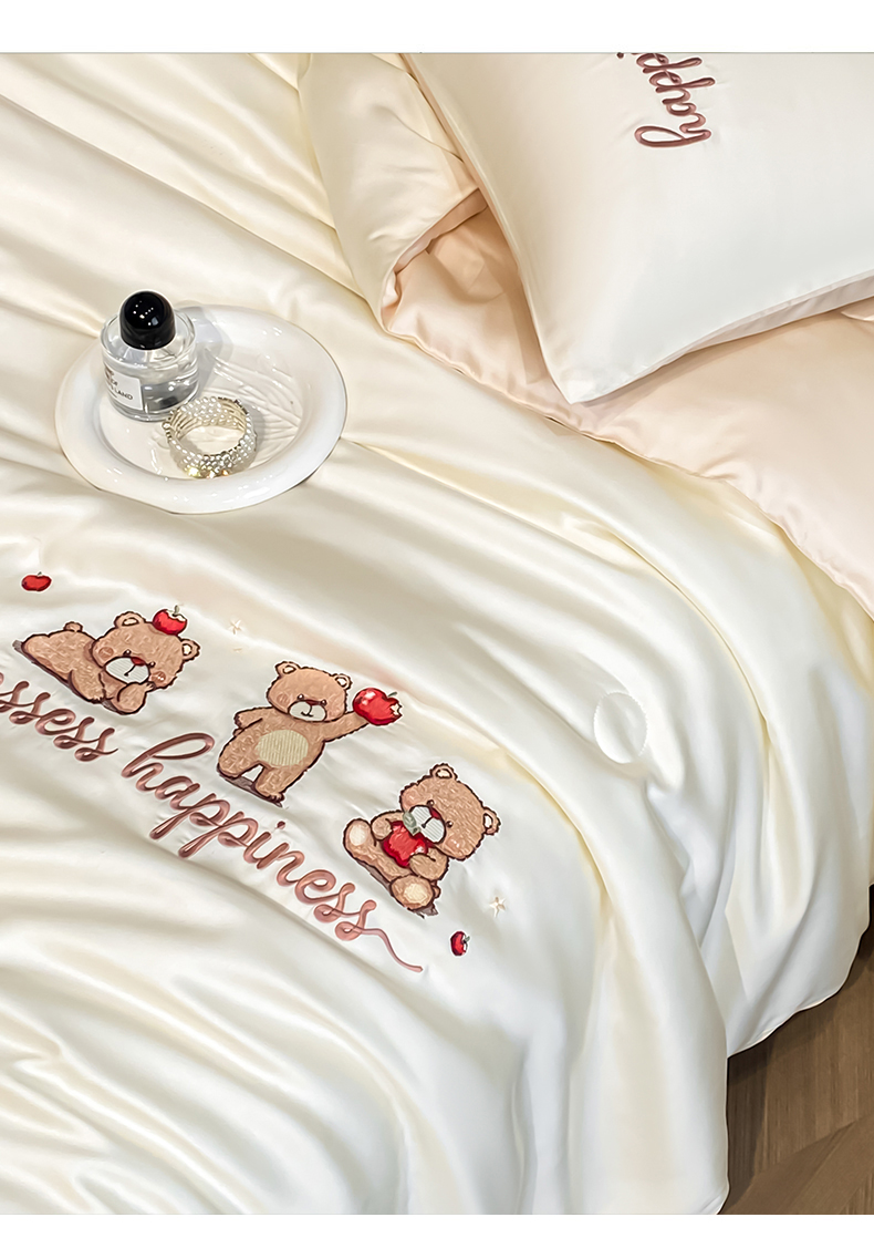 当前位置: 91家纺网 > 商品网购 > 床品套件 > 四件套 > 全棉普通四件套 > 云棉坊 2026新款水洗真丝冰丝刺绣夏被四件套-卡通款 萌萌熊-奶白+杏仁