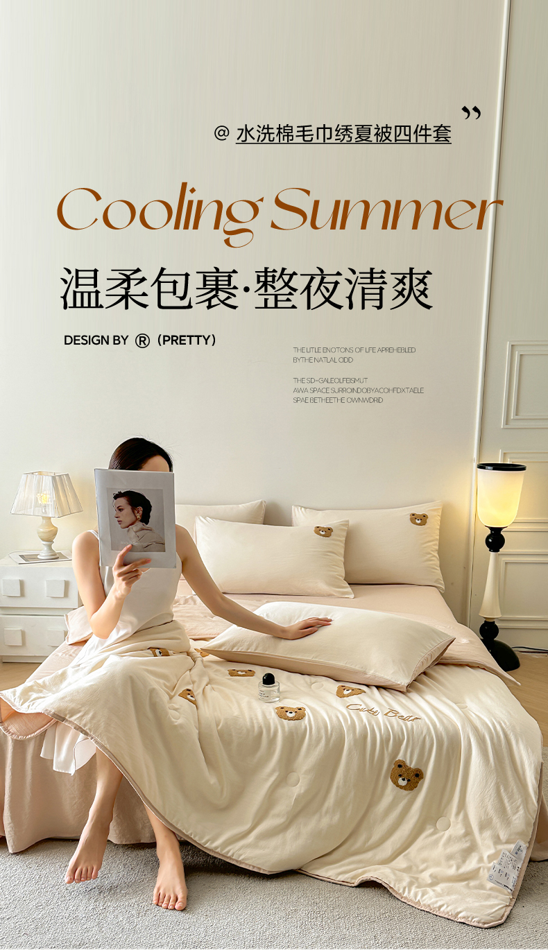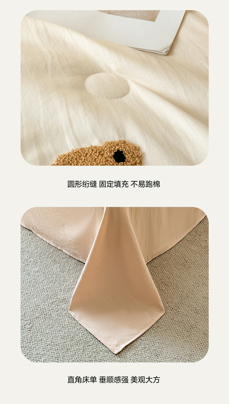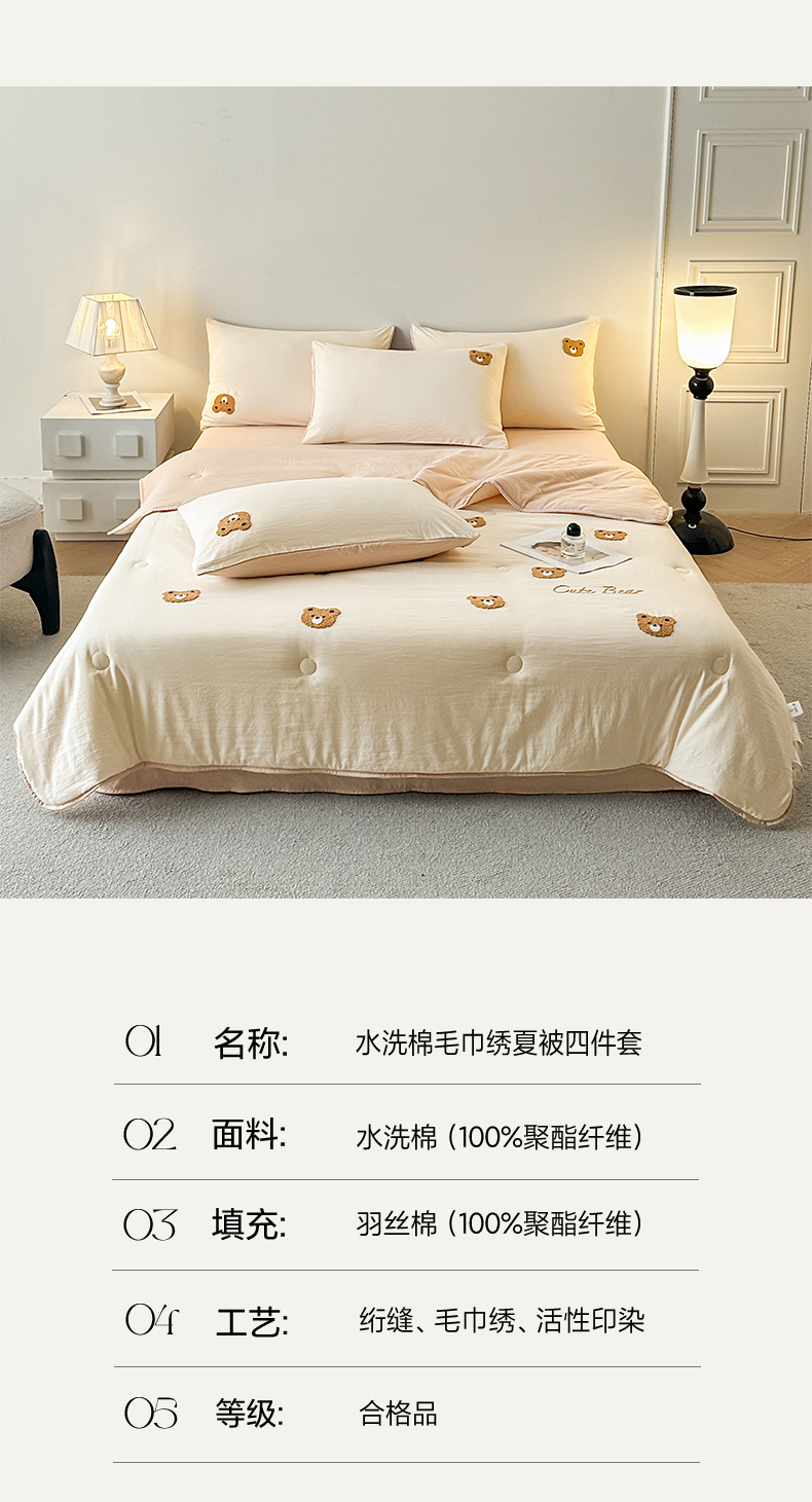 • 91家纺网 家纺一手货源 找家纺 遇见家居生活馆 2026新款水洗棉毛巾绣夏被四件套-艾拉 艾拉-小熊米白+香槟
