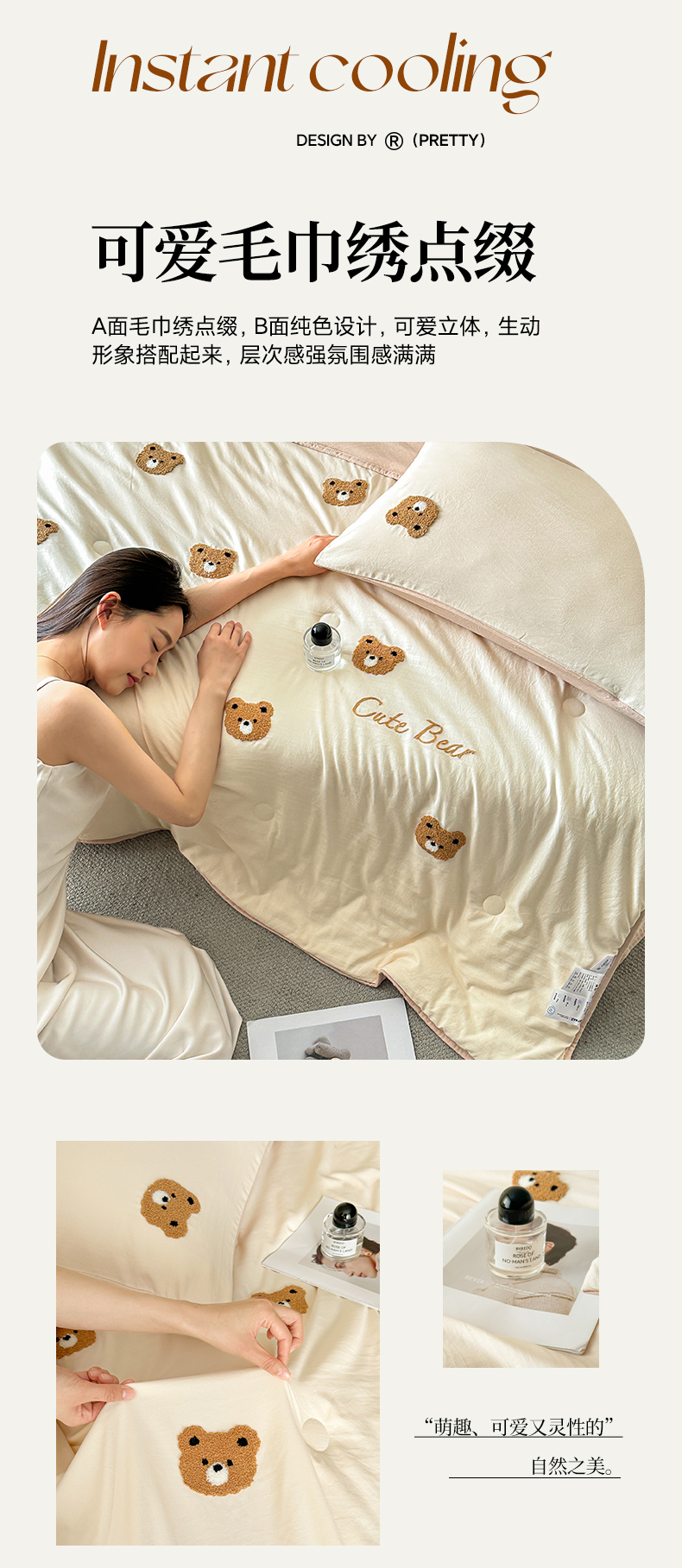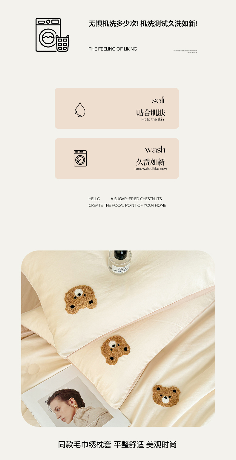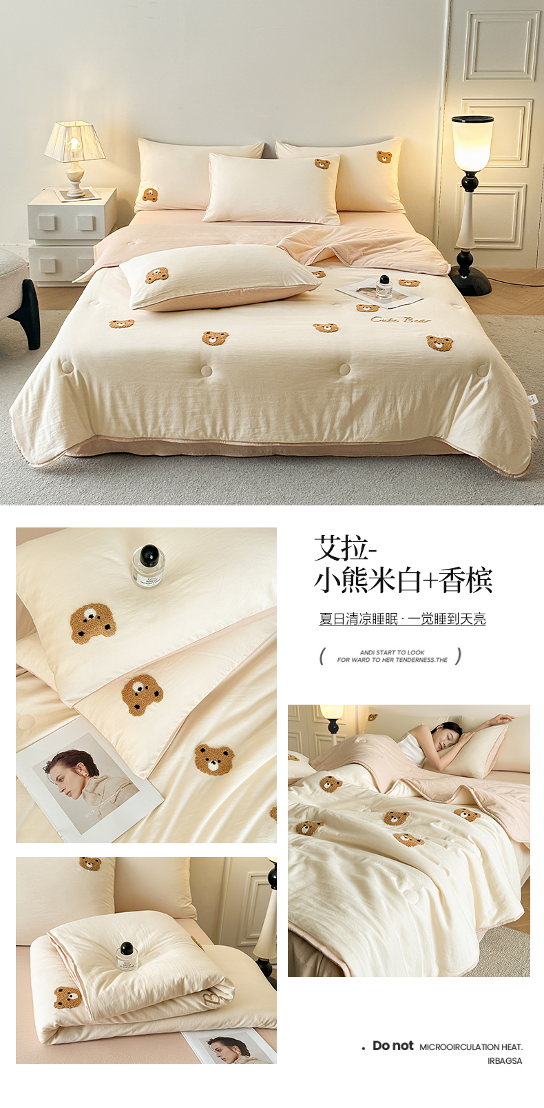 • 91家纺网 家纺一手货源 找家纺 遇见家居生活馆 2026新款水洗棉毛巾绣夏被四件套-艾拉 艾拉-小熊米白+香槟