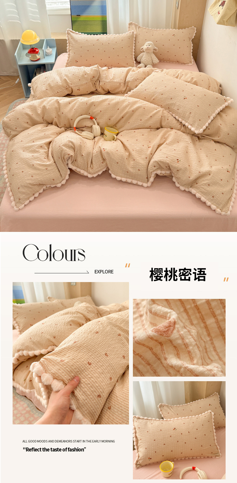 商品名称:N先生+V 13814689556 发大图/买家秀 2026新款A类毛球花边泡芙纱四件套 樱桃密语