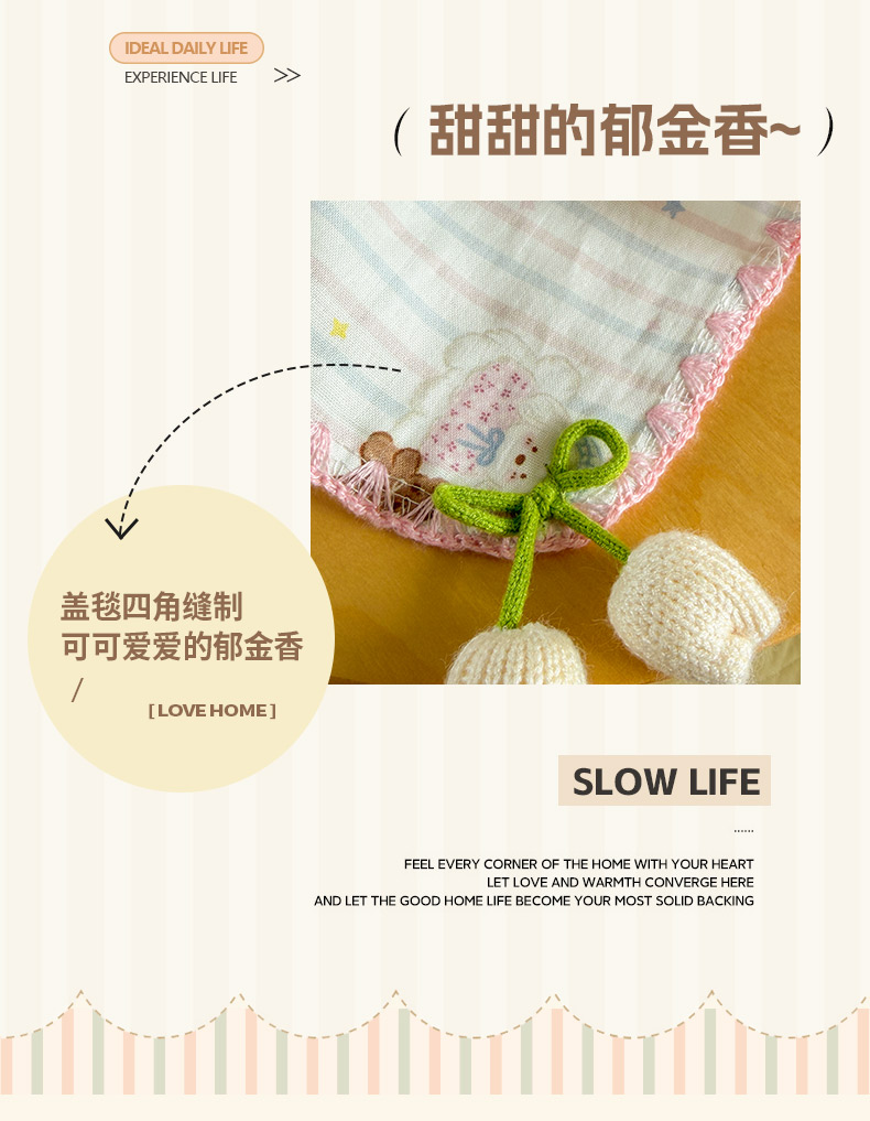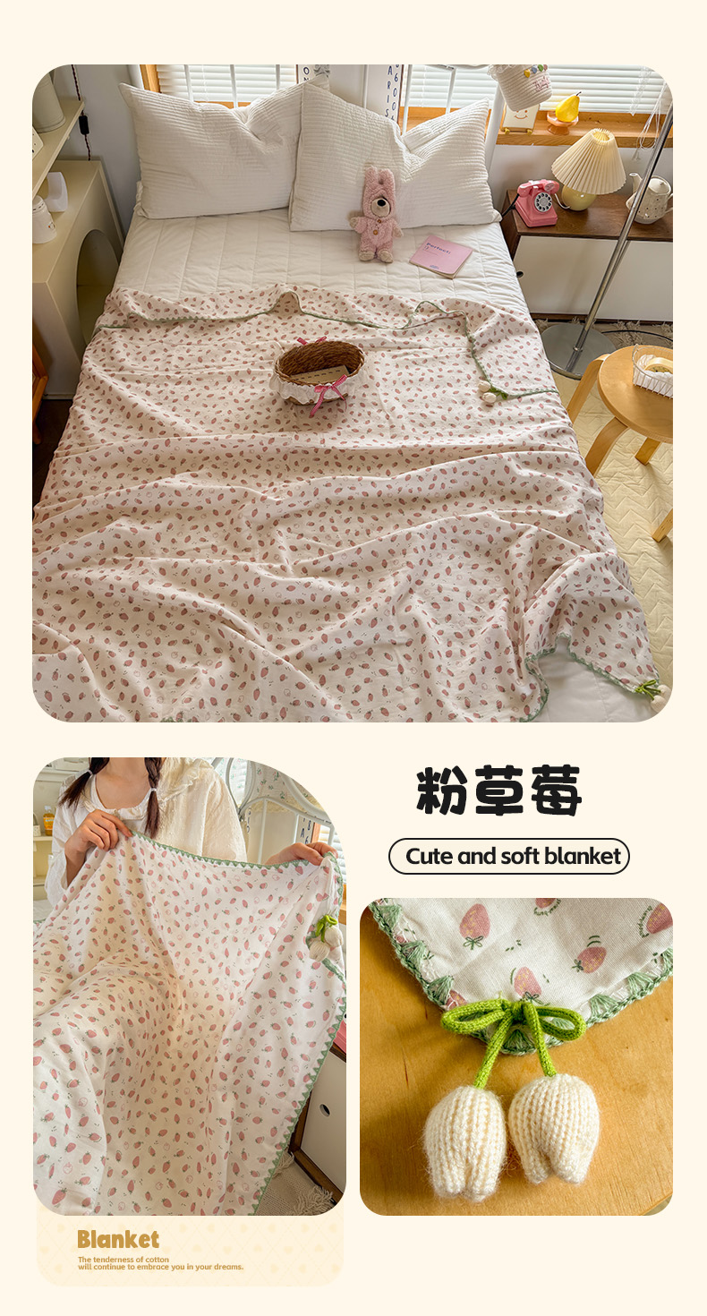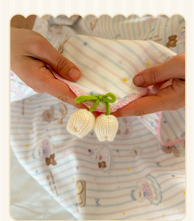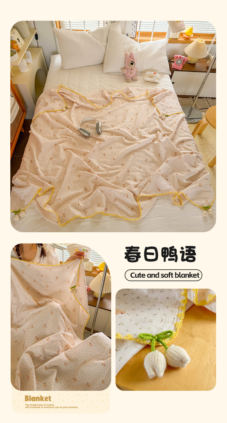 (总)潮邦创意家居 2026新A类全棉双层纱三角针四角郁金香吊坠盖毯—郁金纱语系列【含A类检测报告】,春日鸭语,彩色圆点,春上枝芽,蛋糕狗,方块动物园,粉草莓,风琴小熊,格纹小熊,狗狗爱,黑点粉结,红爱心,花朵大耳兔,花间暮语,萌趣猫,暖棉汪趣,气球小兔,睡兔,睡衣泰迪,素色林间,碎花小兔,小灰兔,樱桃圆点
