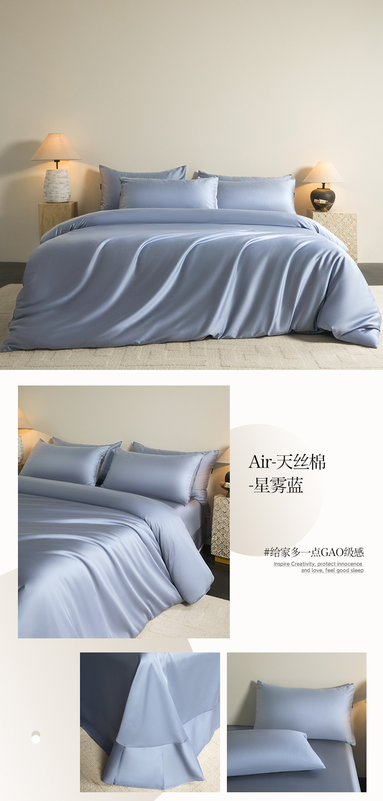 商品名称:秀色家纺 2026新款60S进口天丝贡缎新疆长绒棉纯色轻奢四件套 Air-天丝棉-星雾蓝