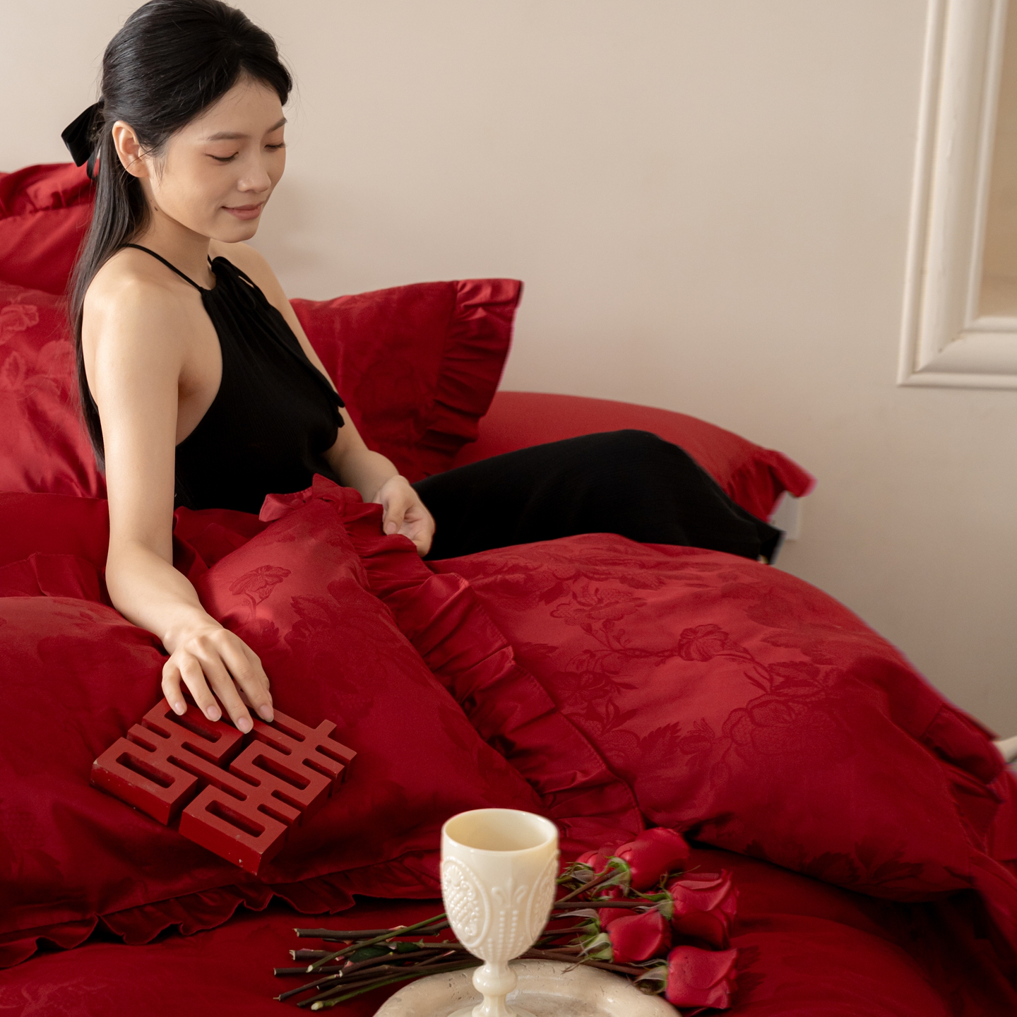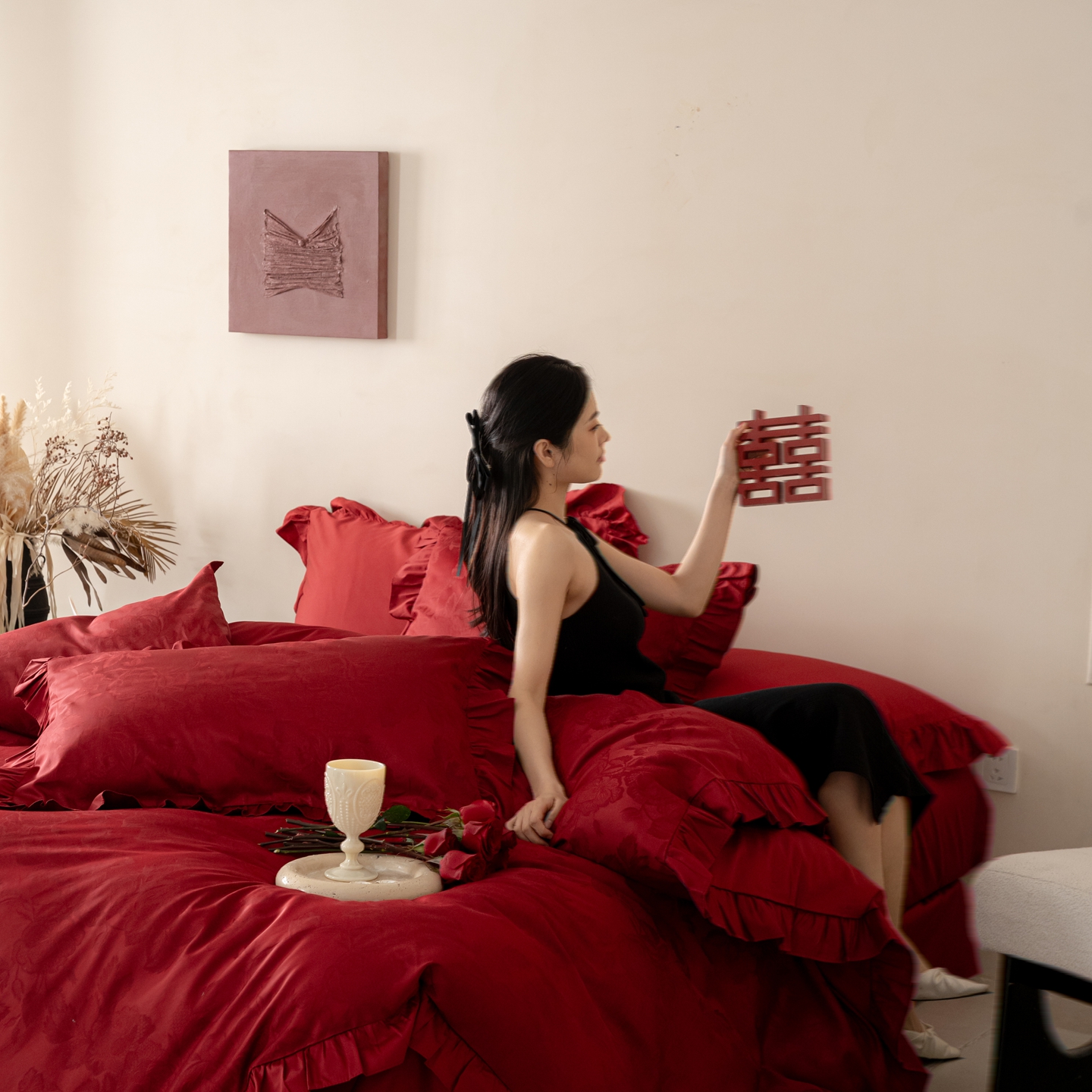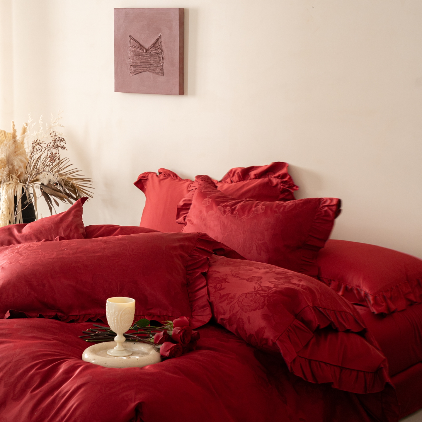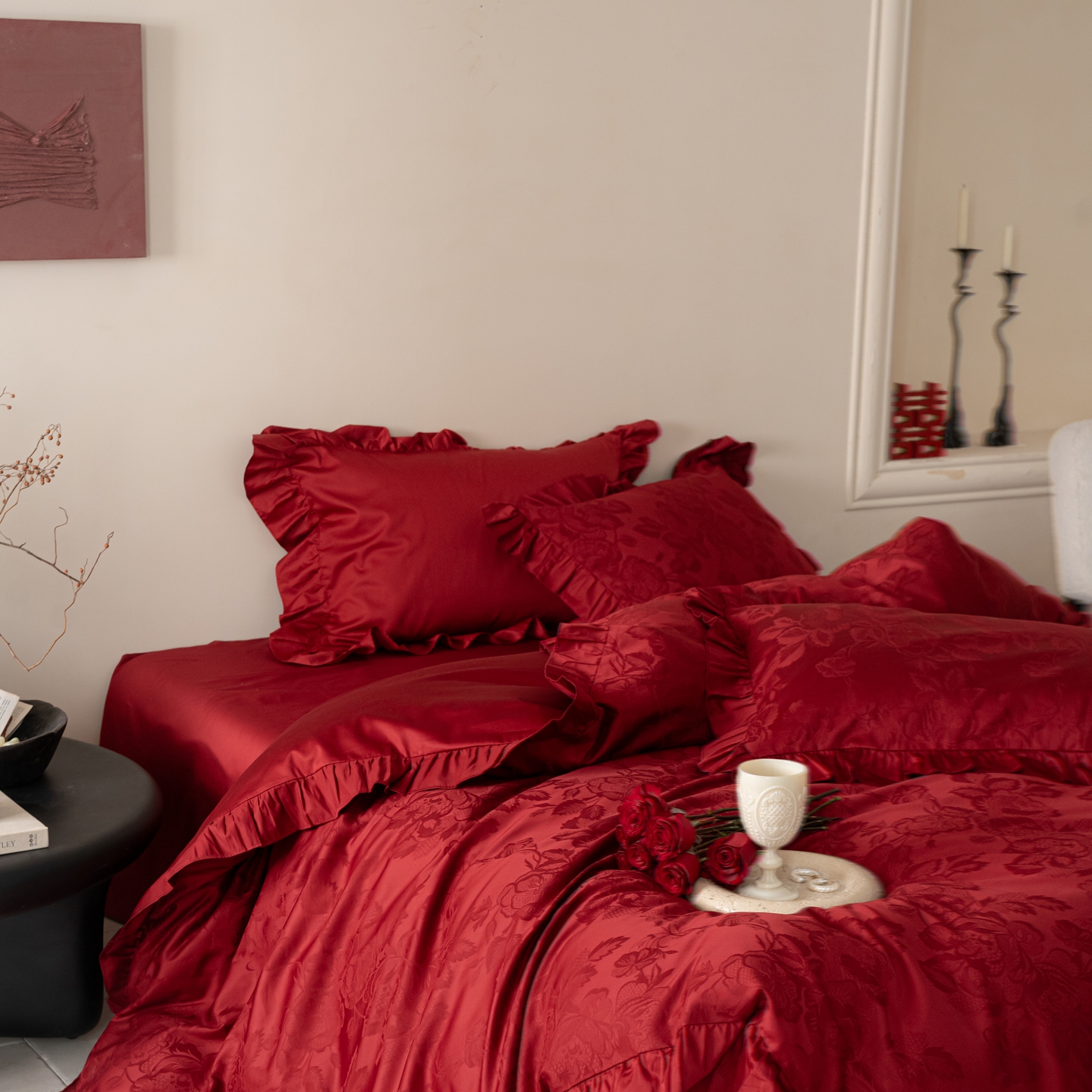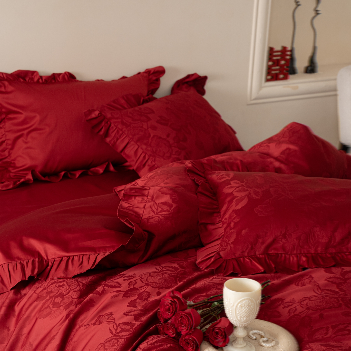 (总)优然居家纺 2025春夏新款木耳边喜字蝴蝶结小爱心复古红四件套-小欢喜,小欢喜