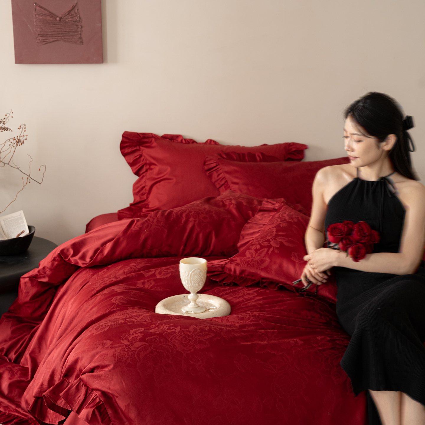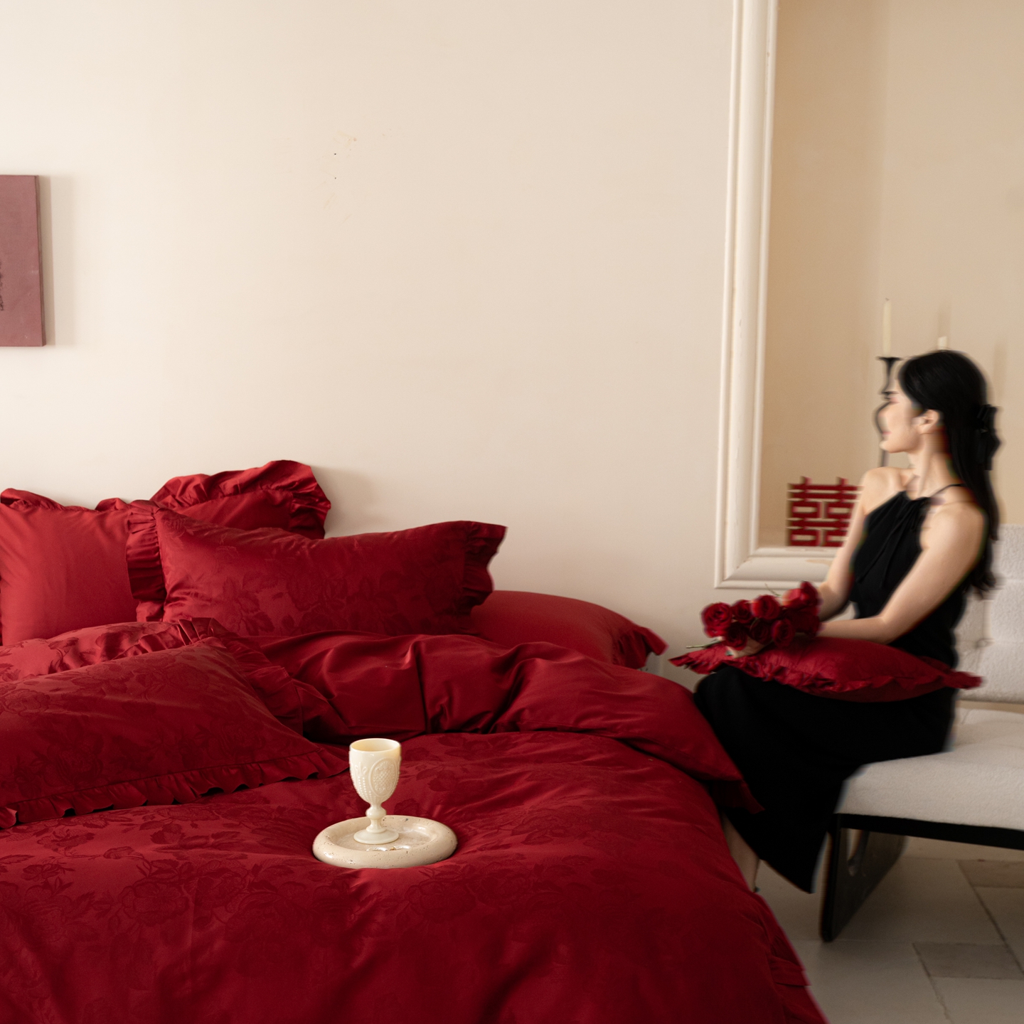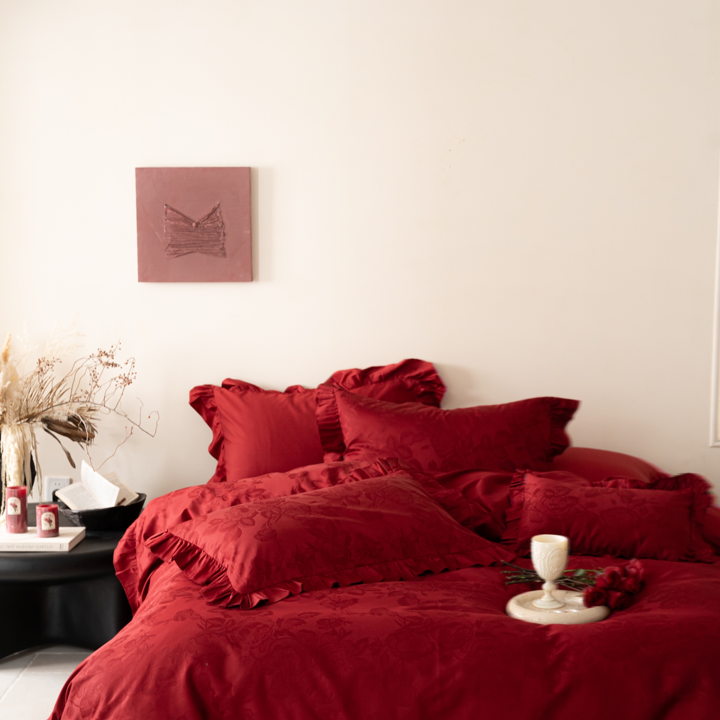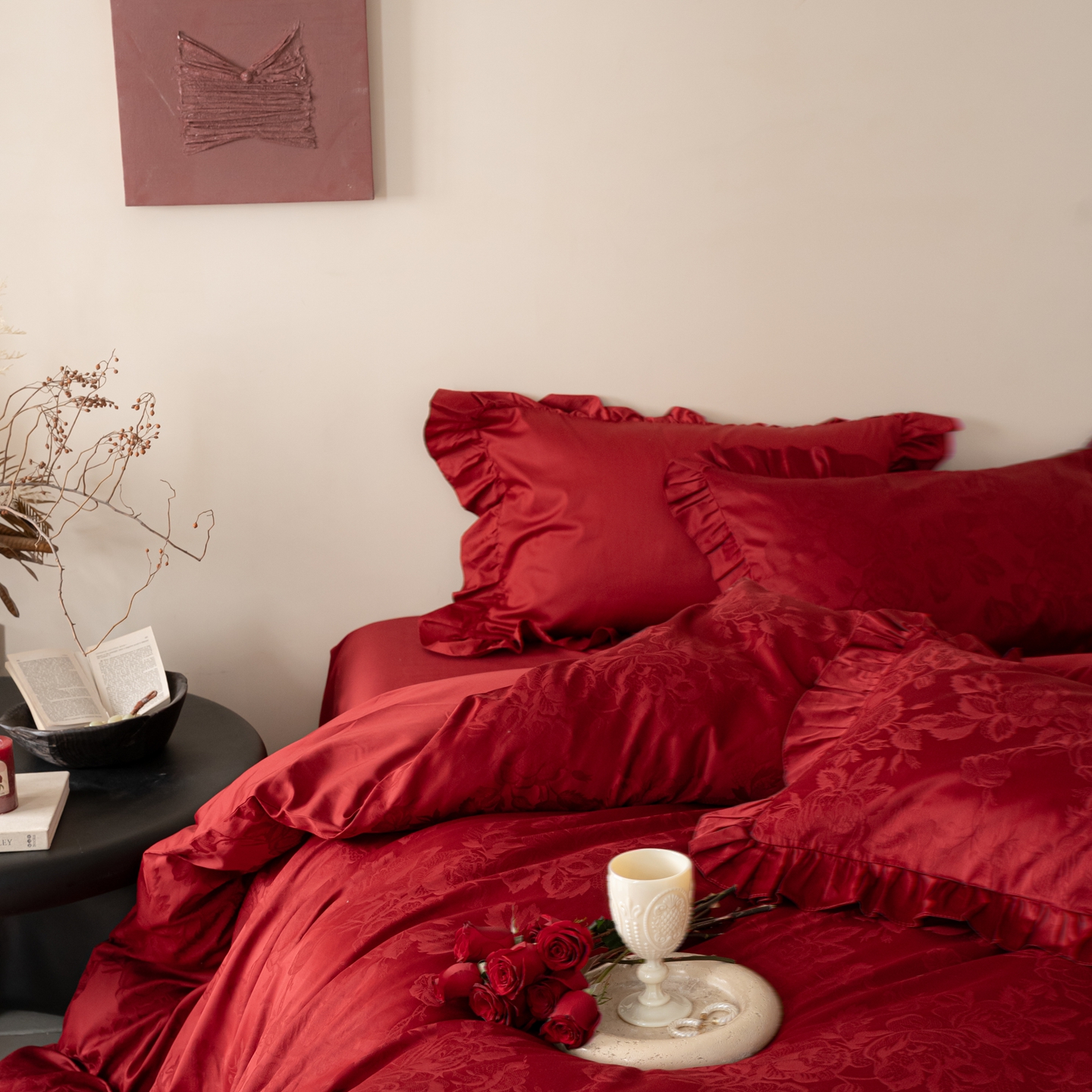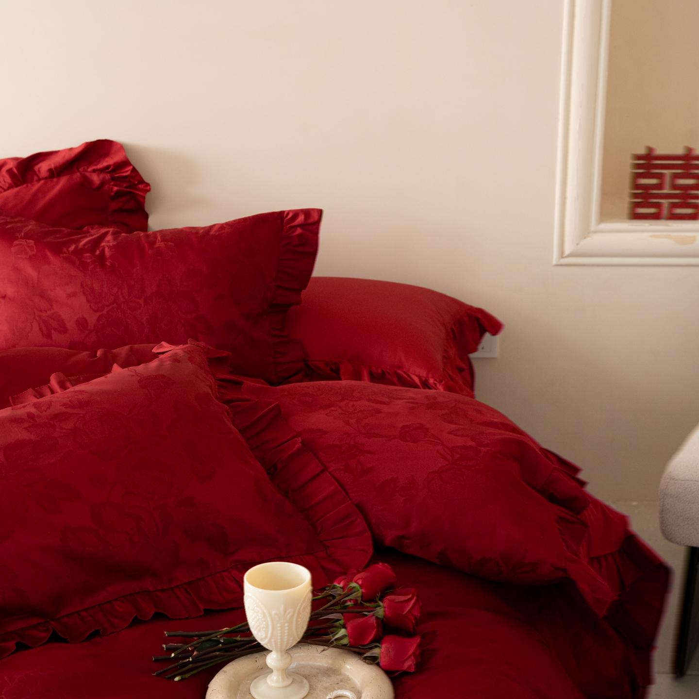 (总)优然居家纺 2025春夏新款木耳边喜字蝴蝶结小爱心复古红四件套-小欢喜,小欢喜