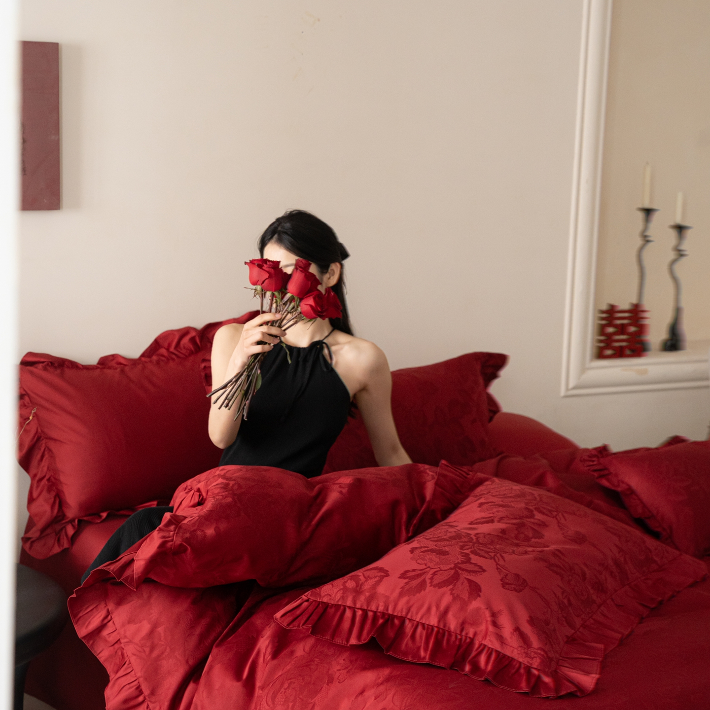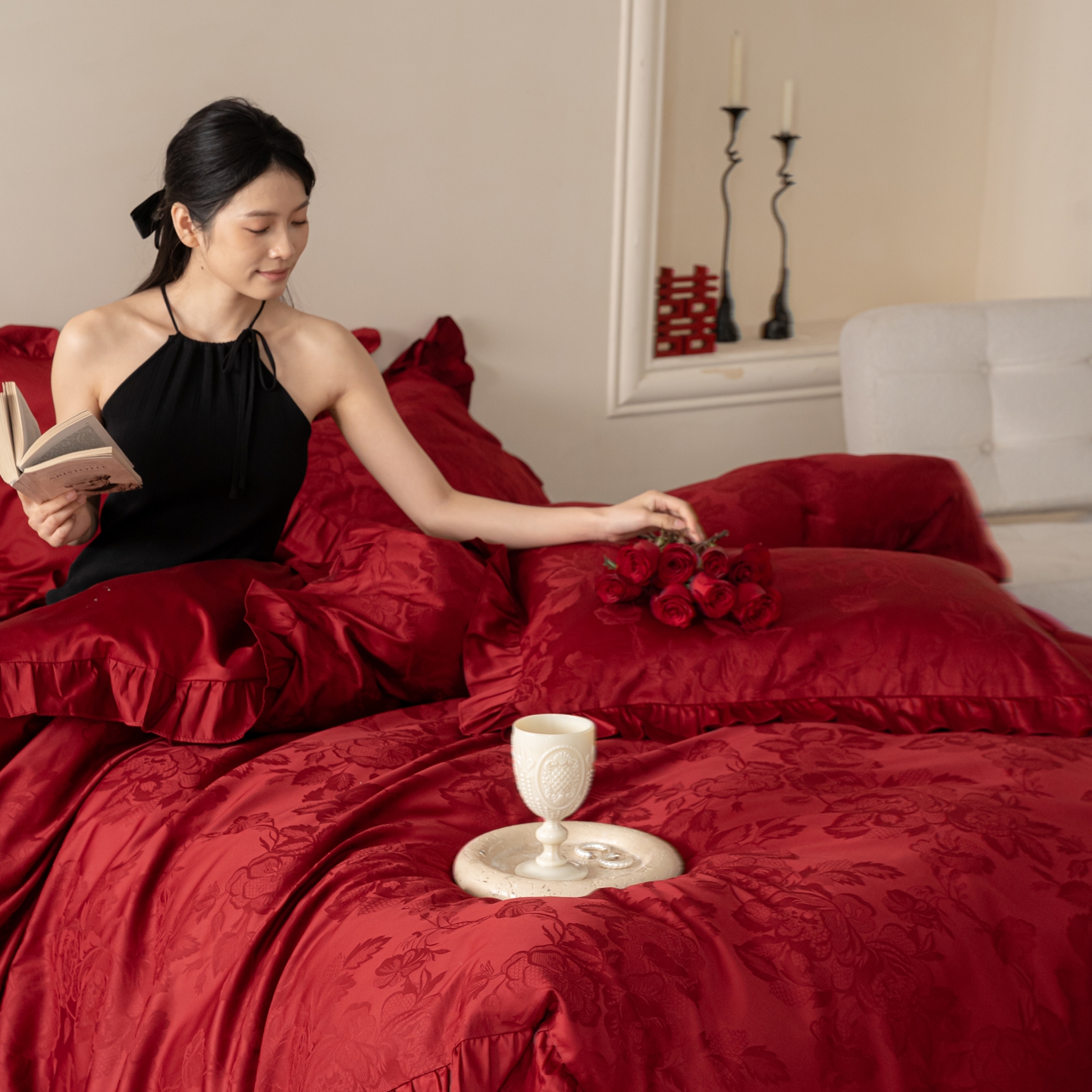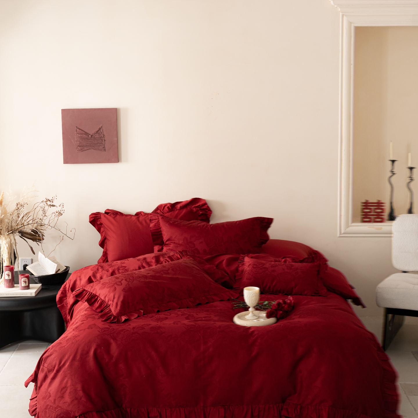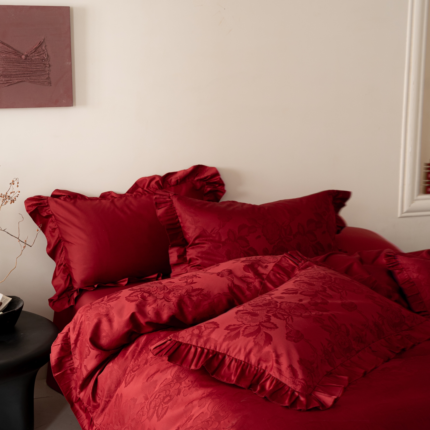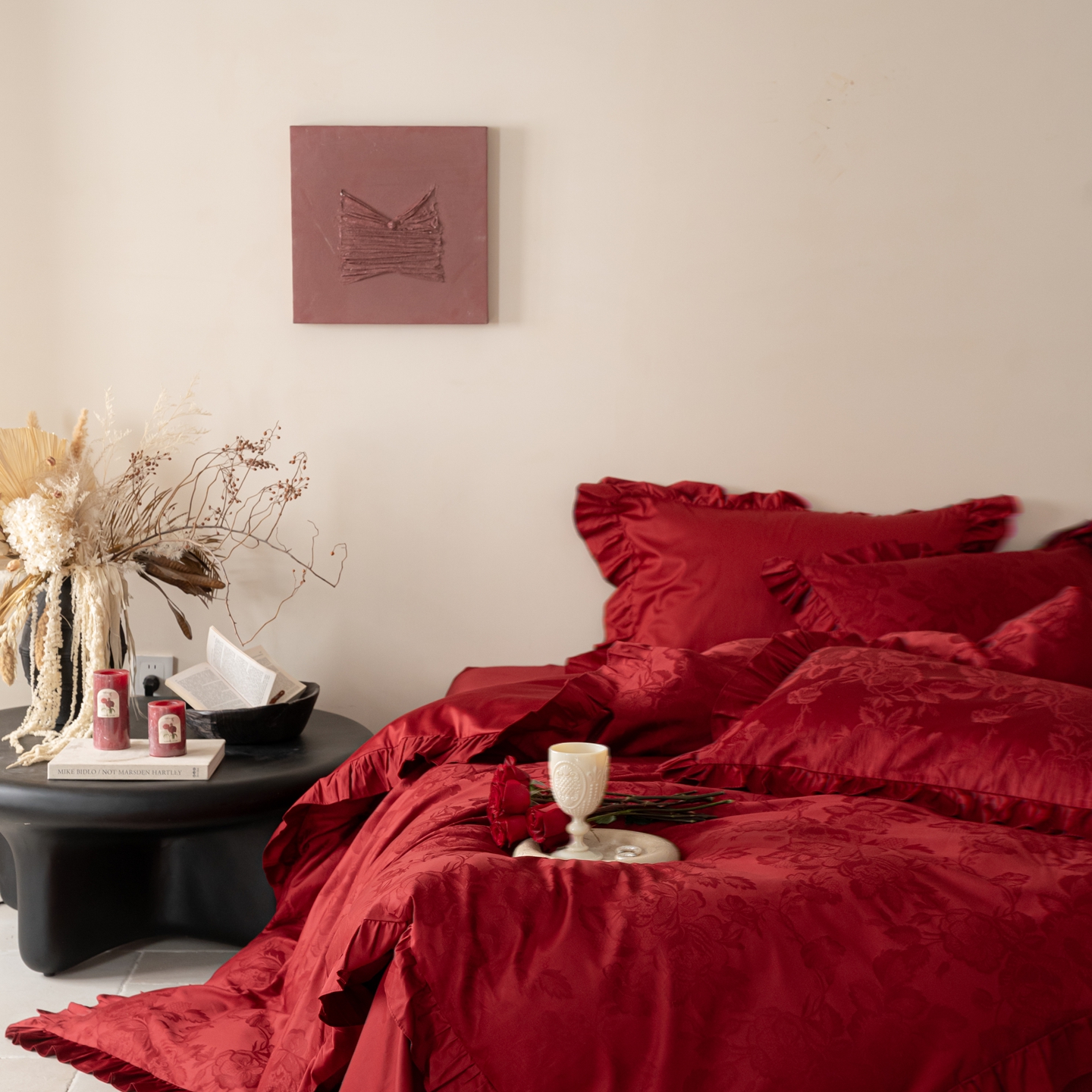 (总)优然居家纺 2025春夏新款木耳边喜字蝴蝶结小爱心复古红四件套-小欢喜,小欢喜