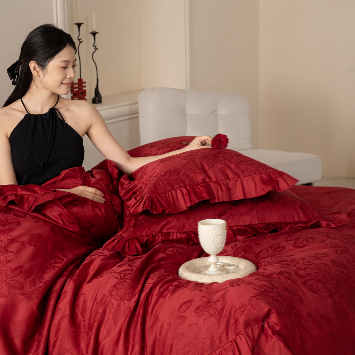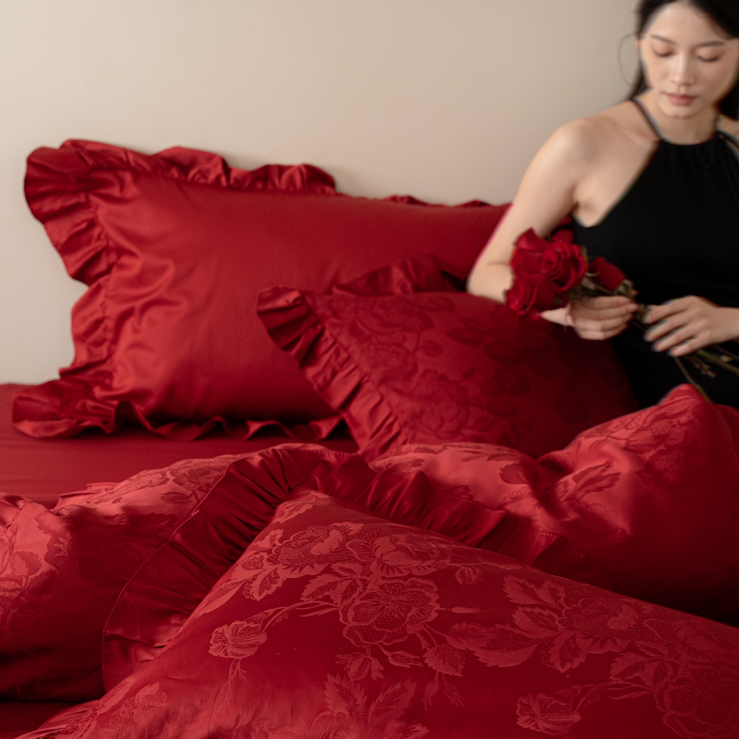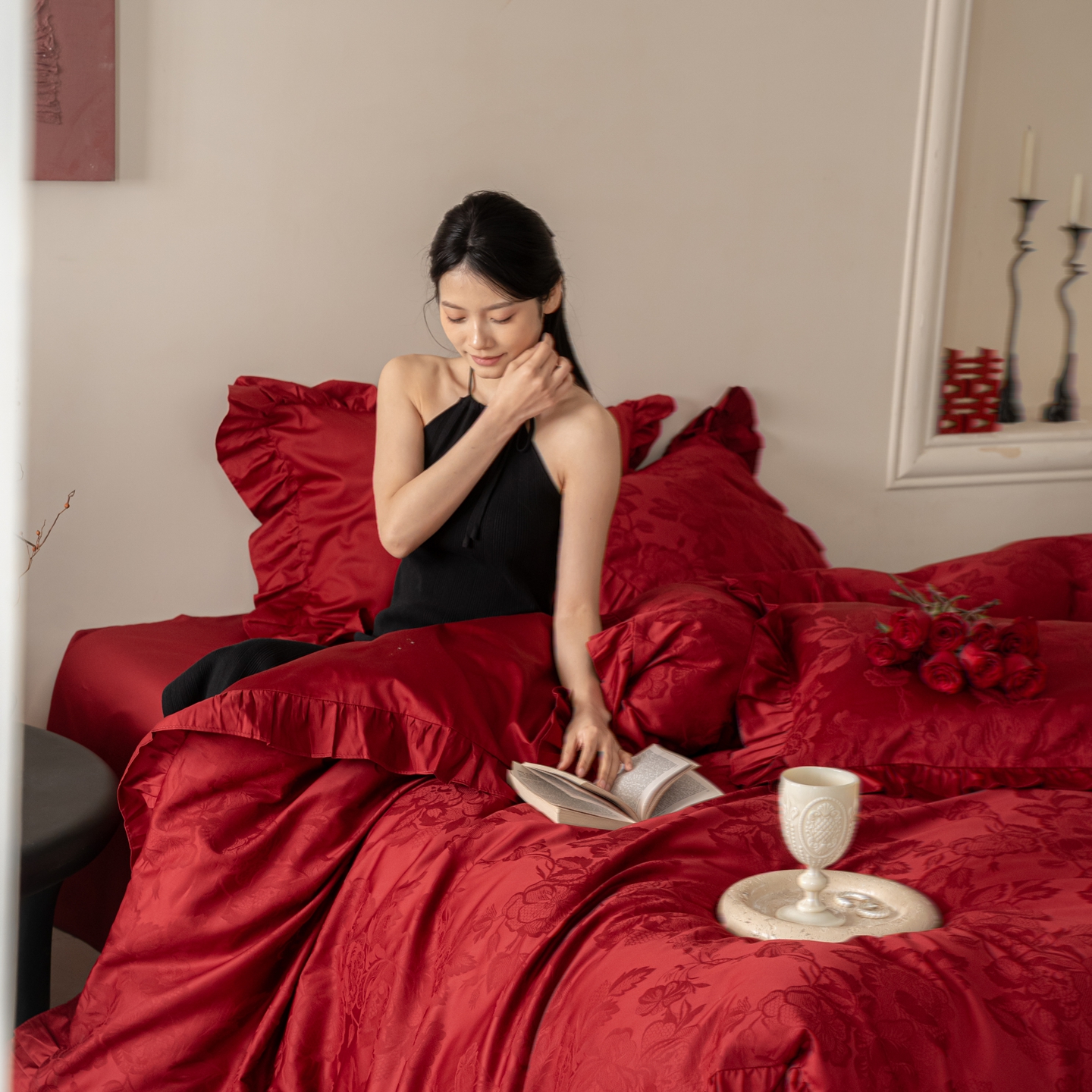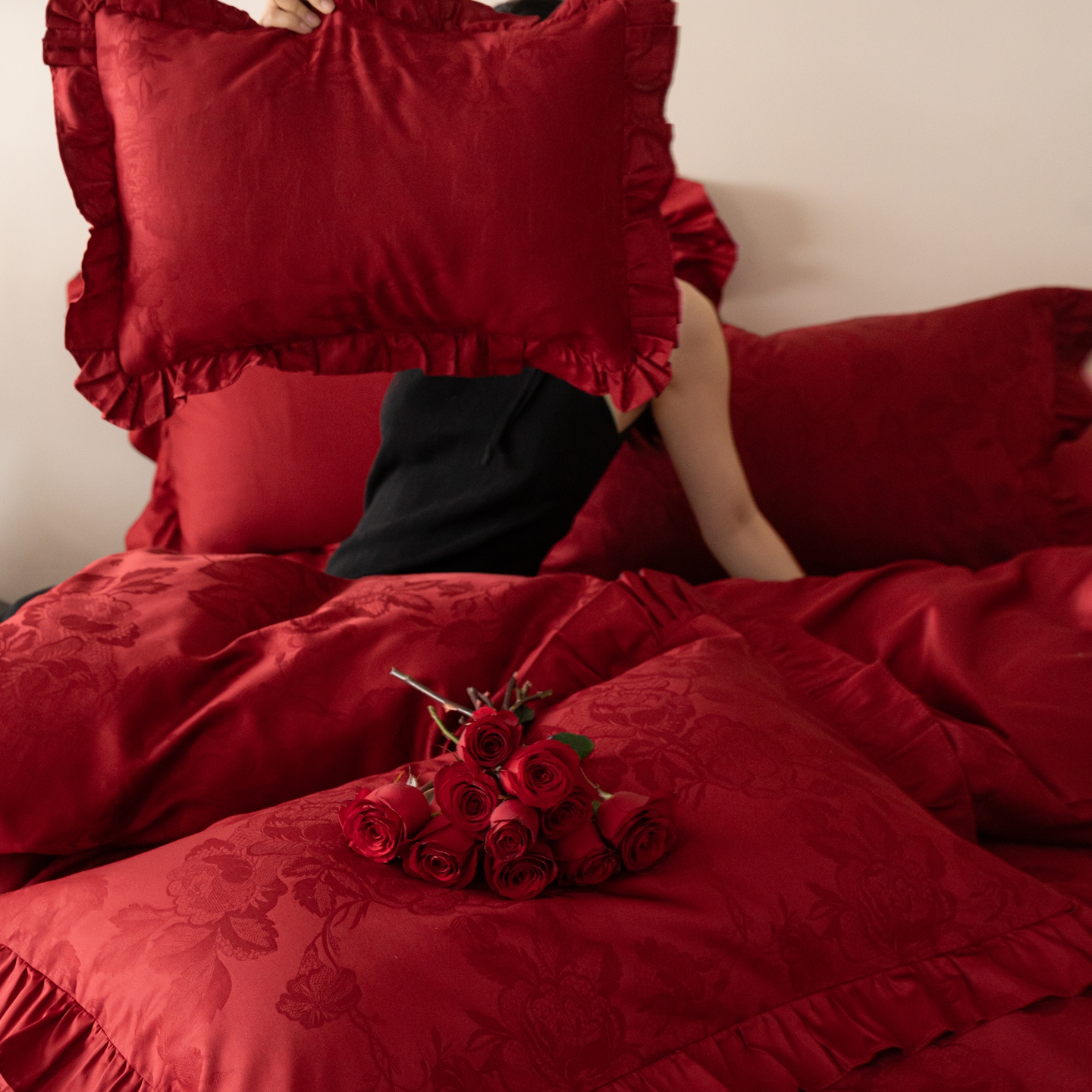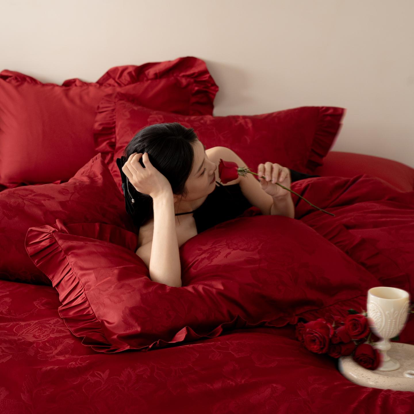 (总)优然居家纺 2025春夏新款木耳边喜字蝴蝶结小爱心复古红四件套-小欢喜,小欢喜