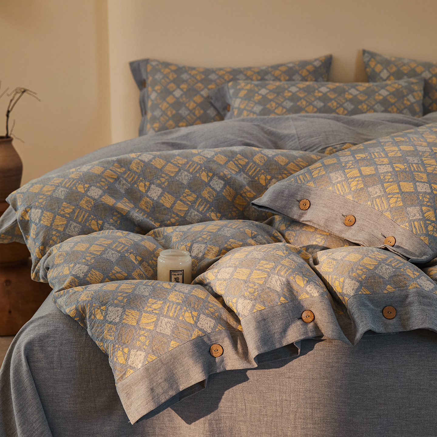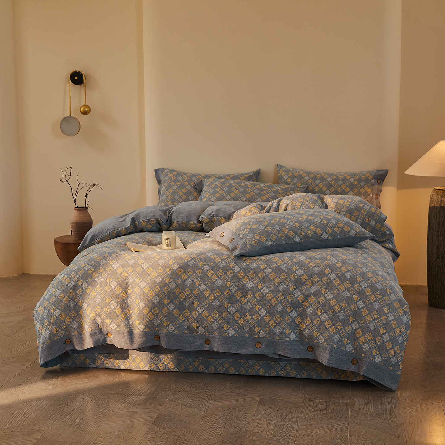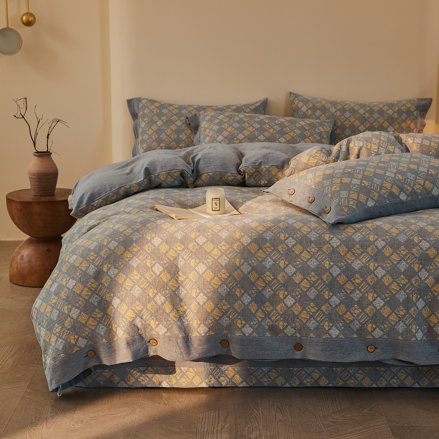 (总)仰望棉麻双层纱供应链 2026新款全棉色织提花双层纱纽扣款四件套-森意棉棉,森意棉棉