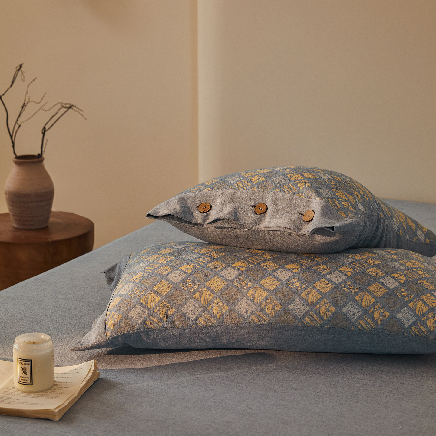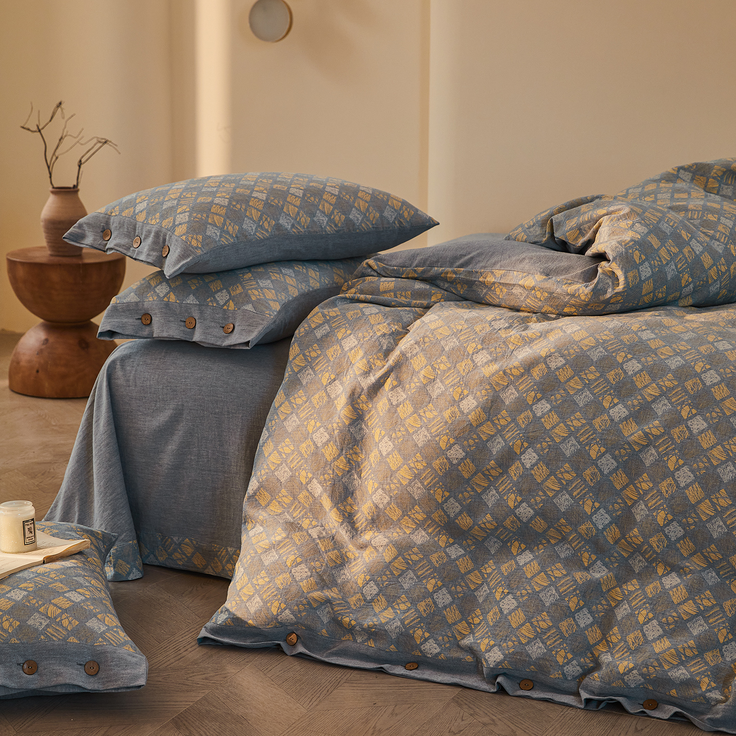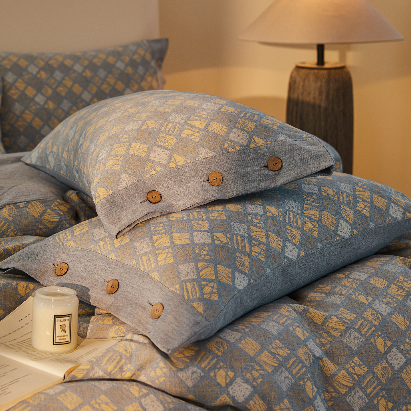 (总)仰望棉麻双层纱供应链 2026新款全棉色织提花双层纱纽扣款四件套-森意棉棉,森意棉棉