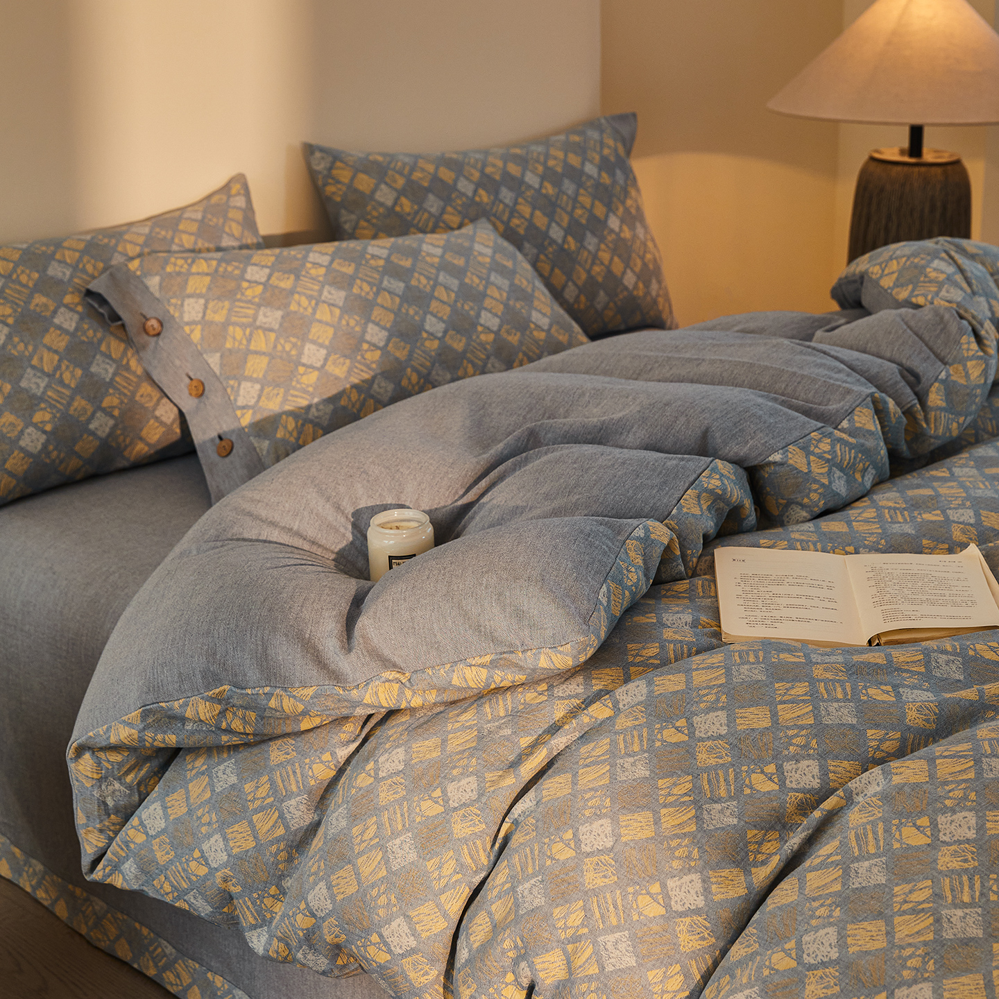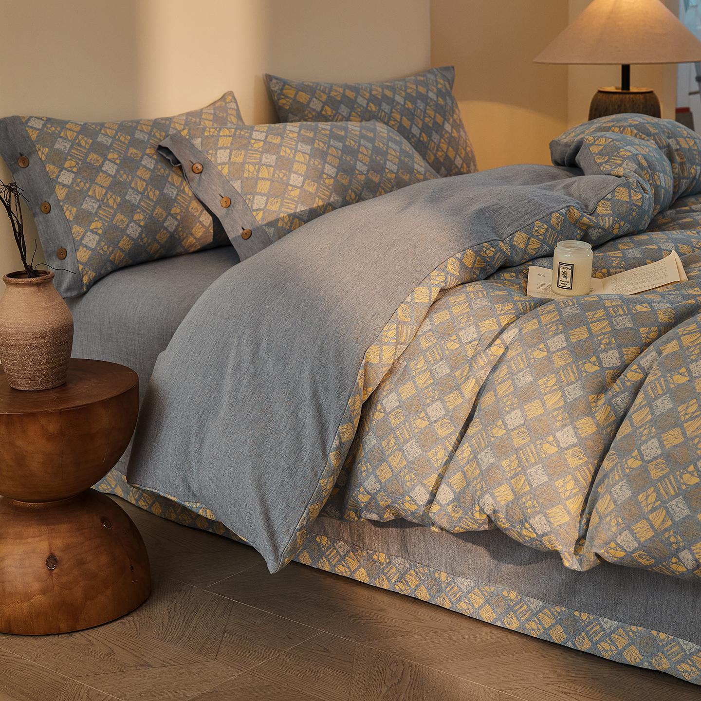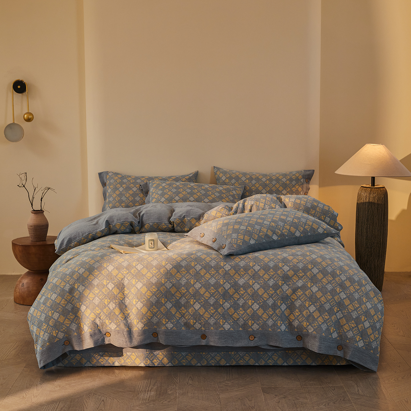 (总)仰望棉麻双层纱供应链 2026新款全棉色织提花双层纱纽扣款四件套-木林漫