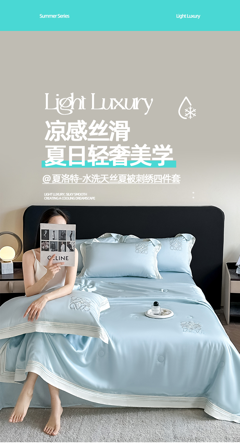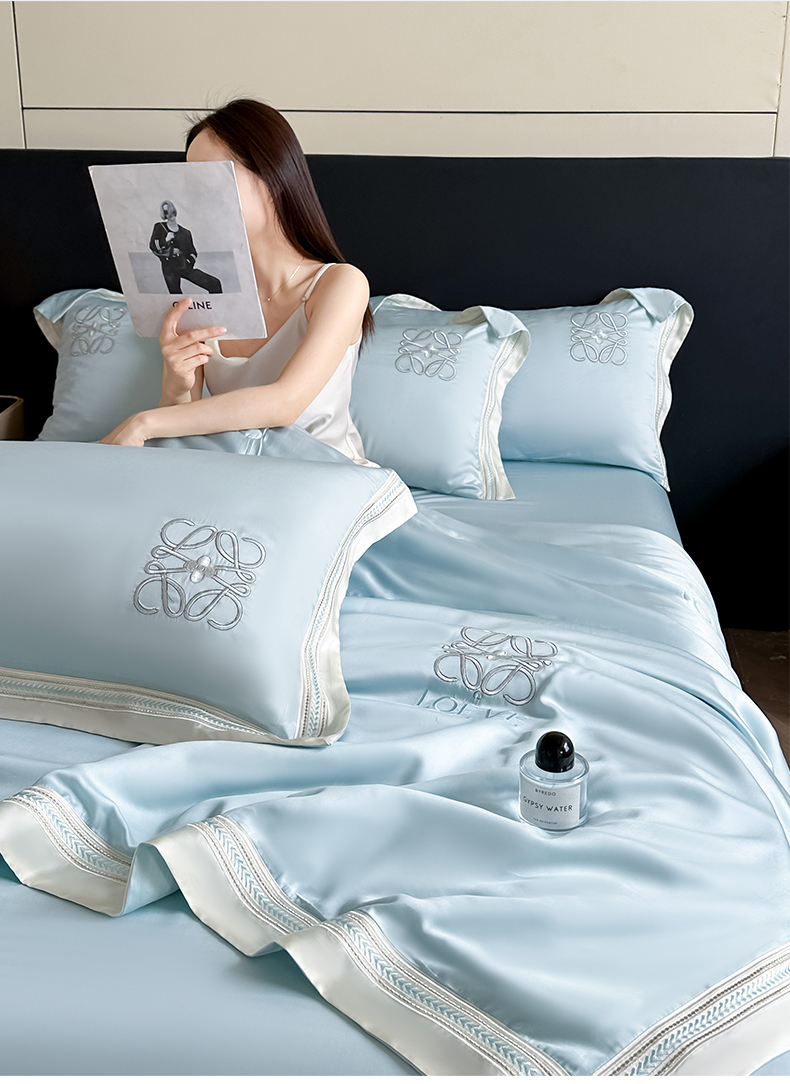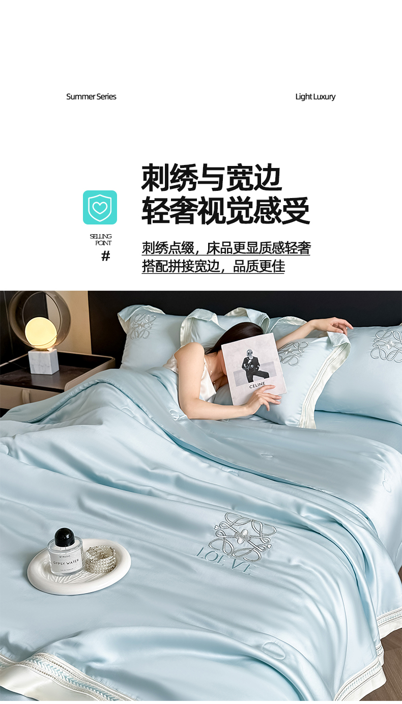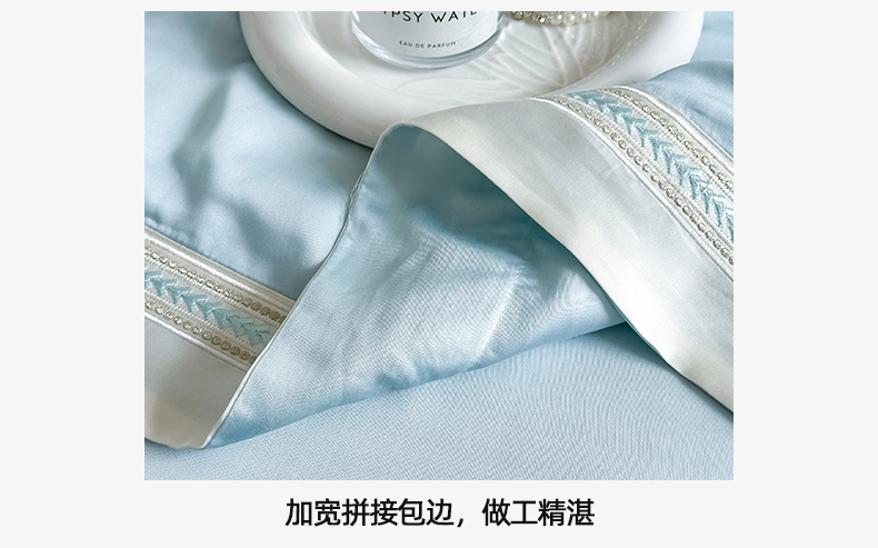 当前位置: 91家纺网 > 商品网购 > 床品套件 > 四件套 > 水洗真丝四件套 > 置顶家纺 2026新款水洗天丝夏被刺绣四件套-夏洛特 夏洛特-浅蓝