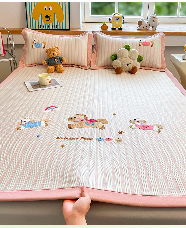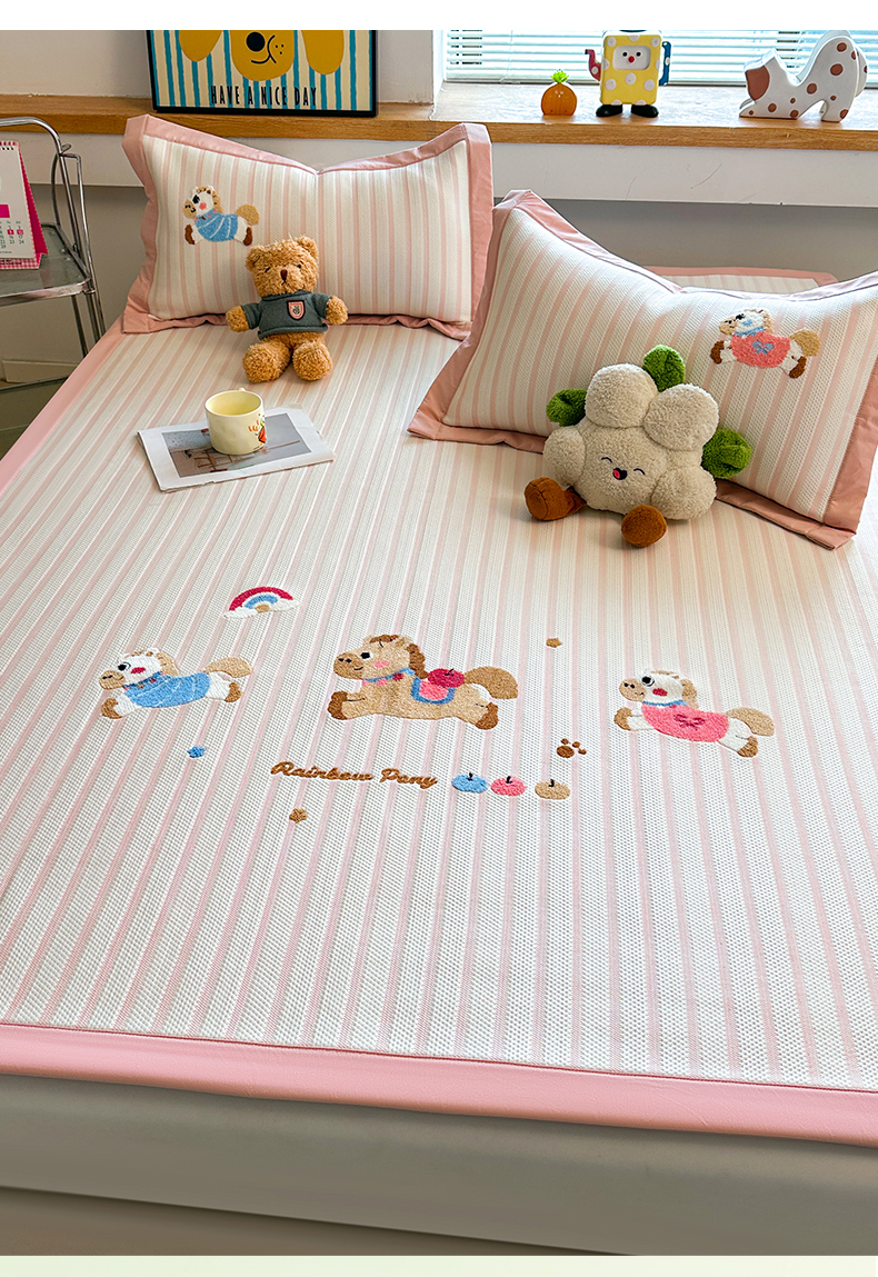 (总)雯豆家纺 2026新款PE中分子毛巾绣凉席三件套平铺席子卡通绣花条席,奔腾小马-蓝,奔腾小马-粉,发财小马-蓝,发财小马-绿,恐龙鸭-蓝,恐龙鸭-绿,软糖小KT-粉,软糖小KT-绿,三色熊-蓝,三色熊-绿,树懒-蓝,树懒-绿