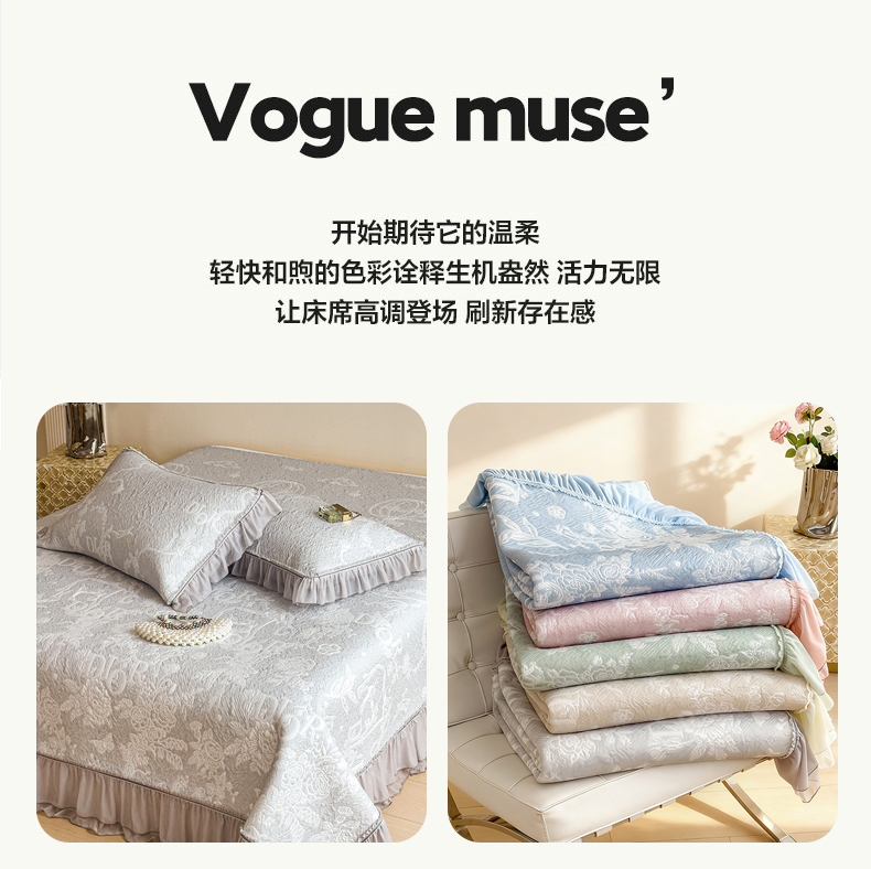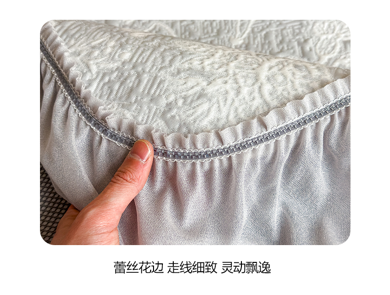 (总)慕木家纺 2026新款A类乙纶双面提花560克冰豆豆花边床盖款床裙迎客松系列(提供买家秀),迎客松-蓝,迎客松-绿,迎客松-粉,迎客松-灰