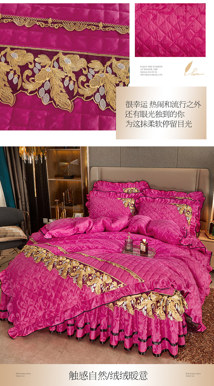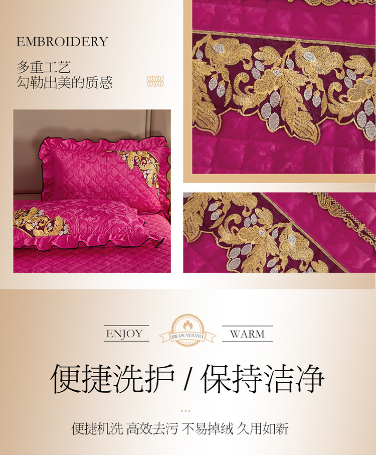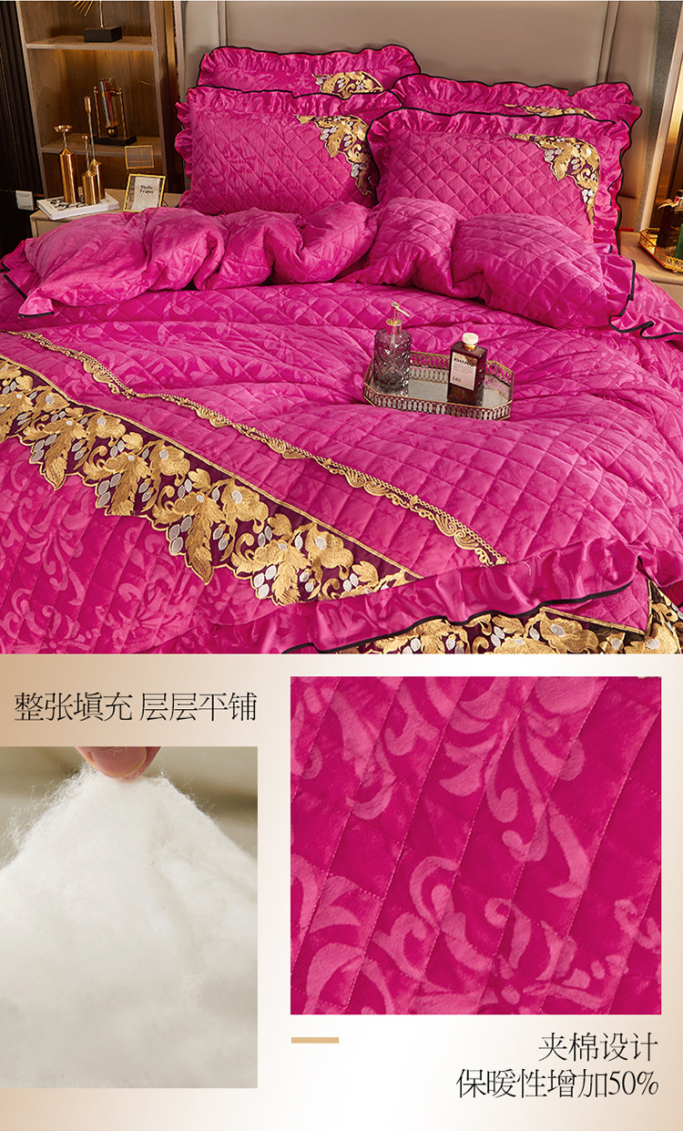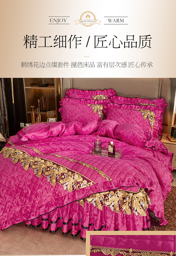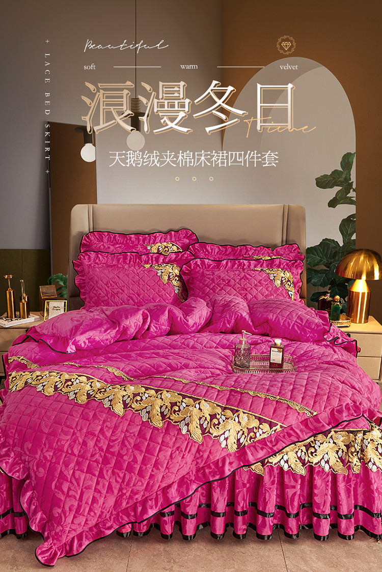 网红馆2025新款天鹅绒夹棉床裙四件套 浅忆拾光-玫红