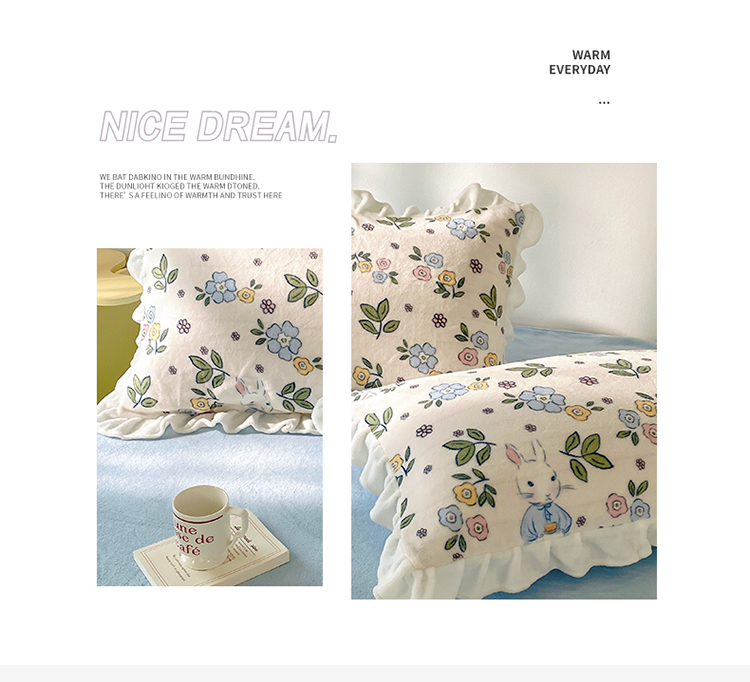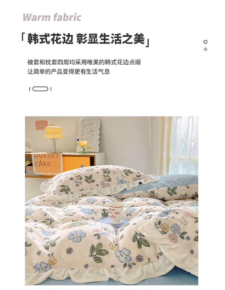 呗旺鹿2022ykk拉链荷叶边印花牛奶绒四件套法莱绒温馨家园