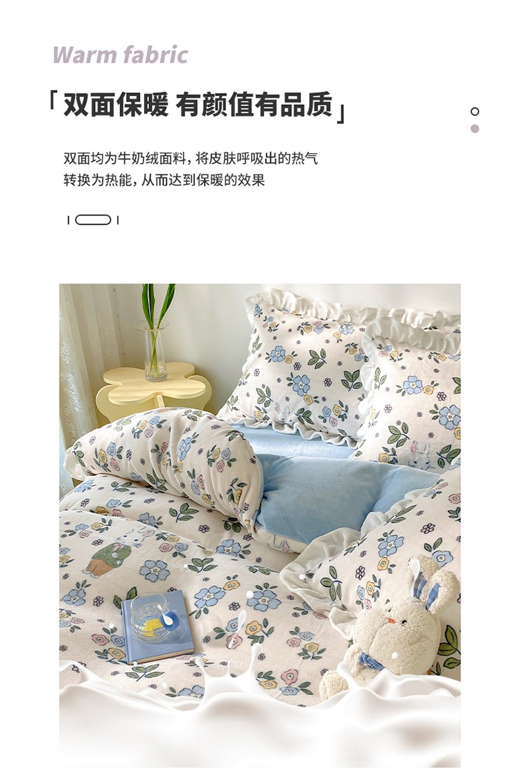 商品名称:呗旺鹿2022ykk拉链荷叶边印花牛奶绒四件套法莱绒温馨家园