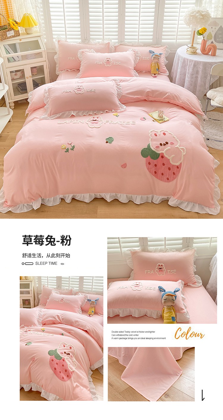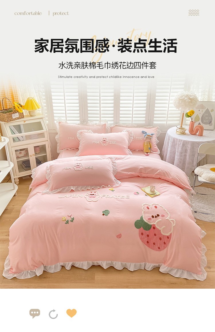 (总)易禾 2022新款水洗亲肤棉毛巾绣草莓兔四件套