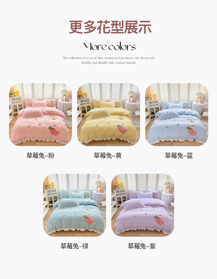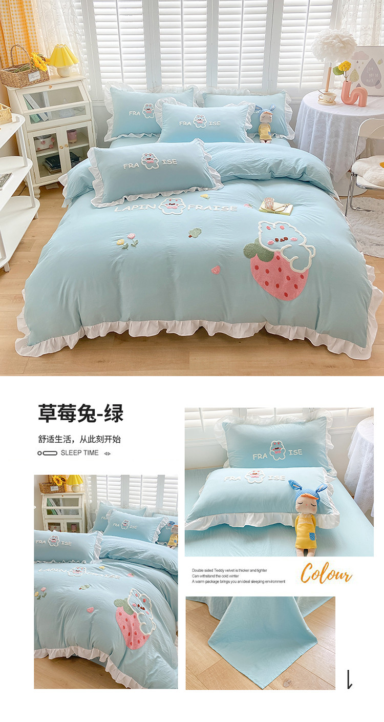(总)易禾 2022新款水洗亲肤棉毛巾绣草莓兔四件套,草莓兔-粉,草莓兔-蓝,草莓兔-黄,草莓兔-紫,草莓兔-绿