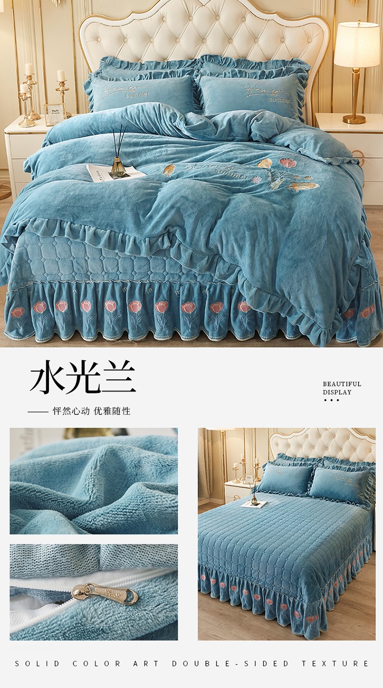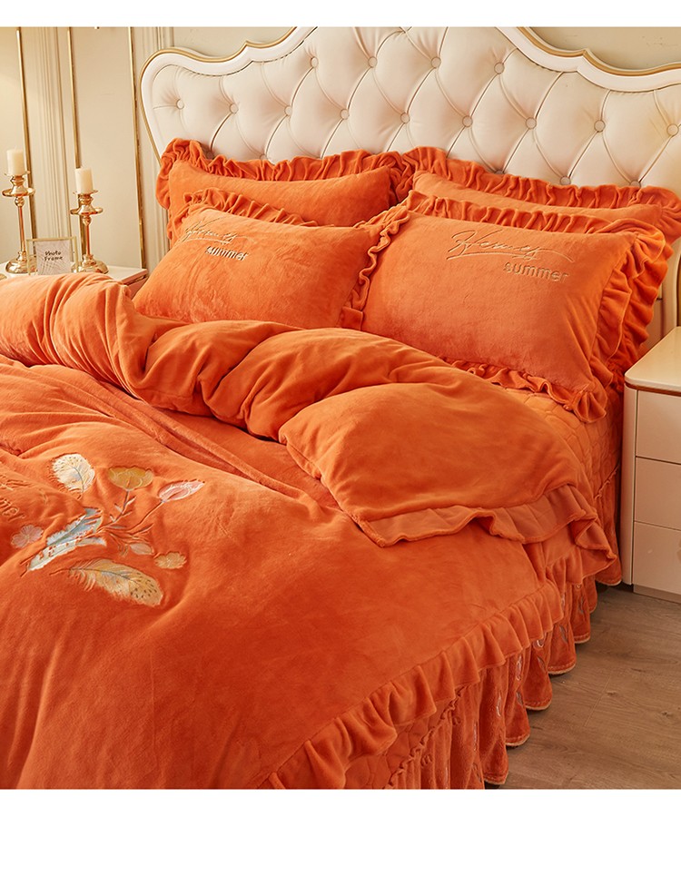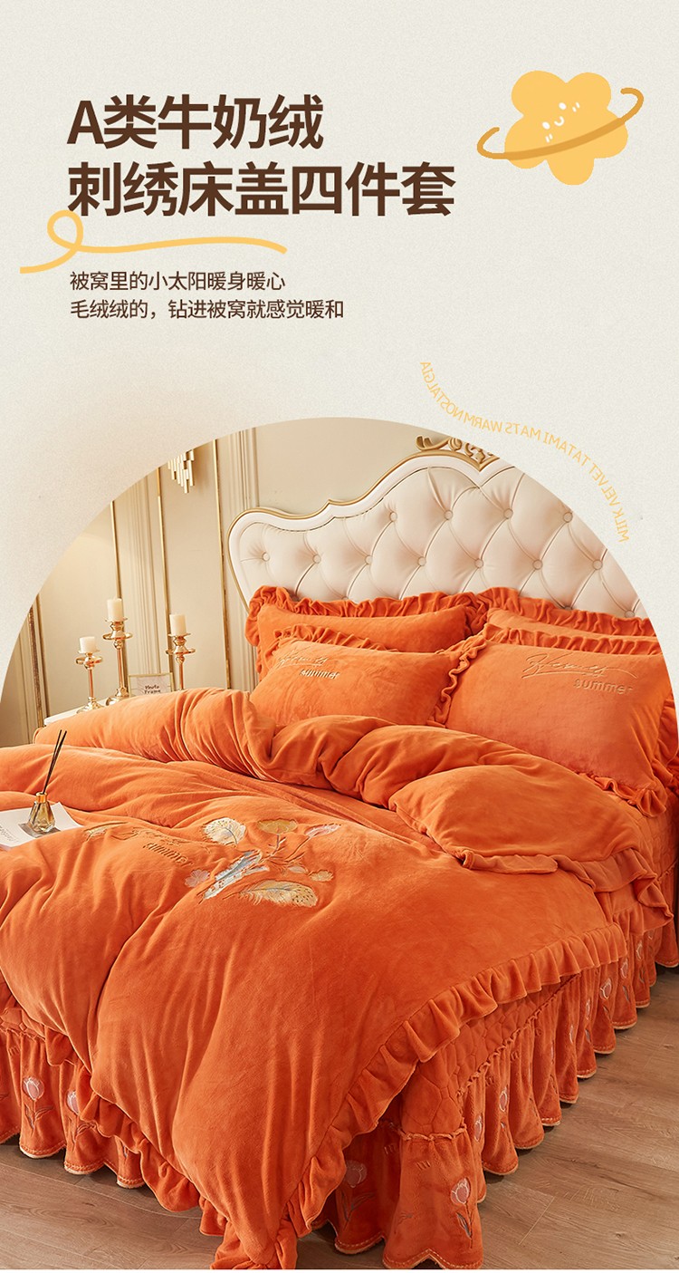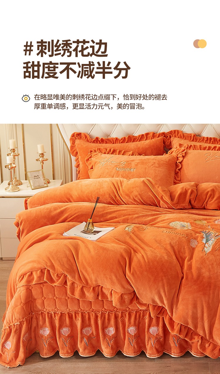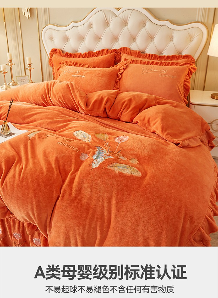 (总)恒爱 2022新款秋冬轻奢宝宝绒刺绣床裙款四件套,爱玛橙,宾利蓝,豆沙红,橄榄绿,高级灰,酒红,梦想粉,浅灰蓝,温馨粉,喜庆红,香妃粉,香芋紫
