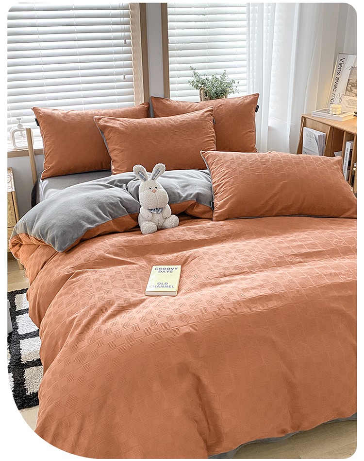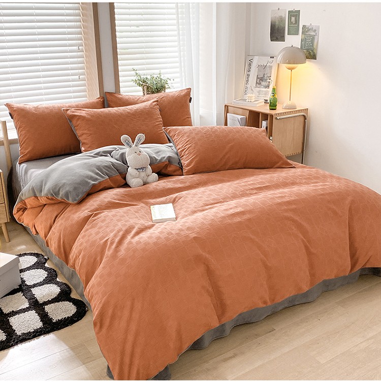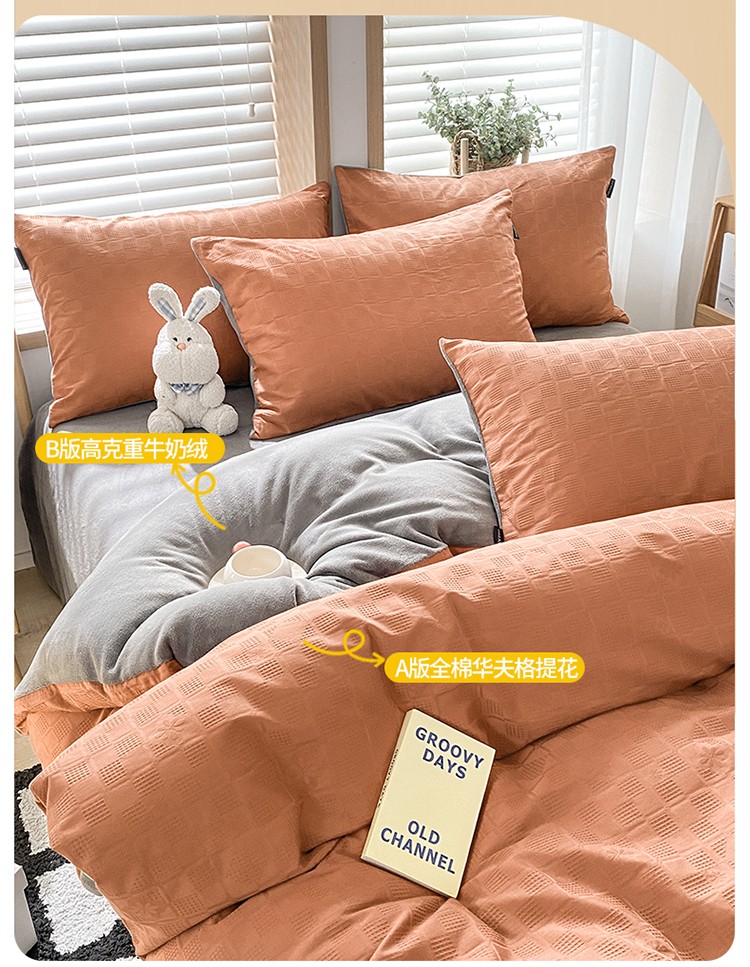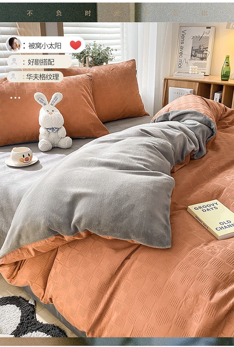 商品名称:蓝米卡夫 2024冬季A类60s华夫格棉绒四件套 南瓜桔+深灰