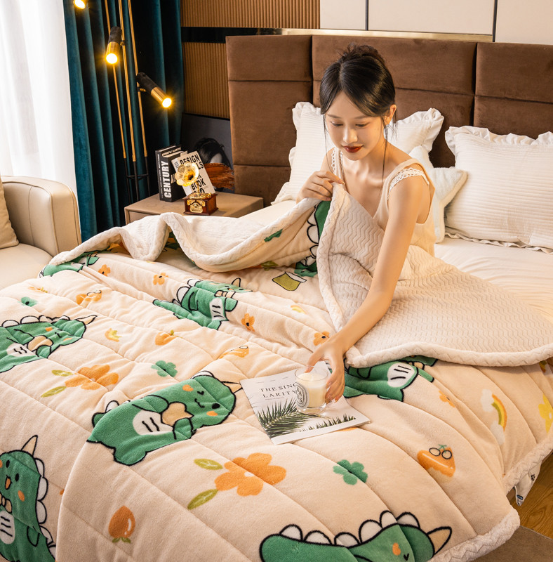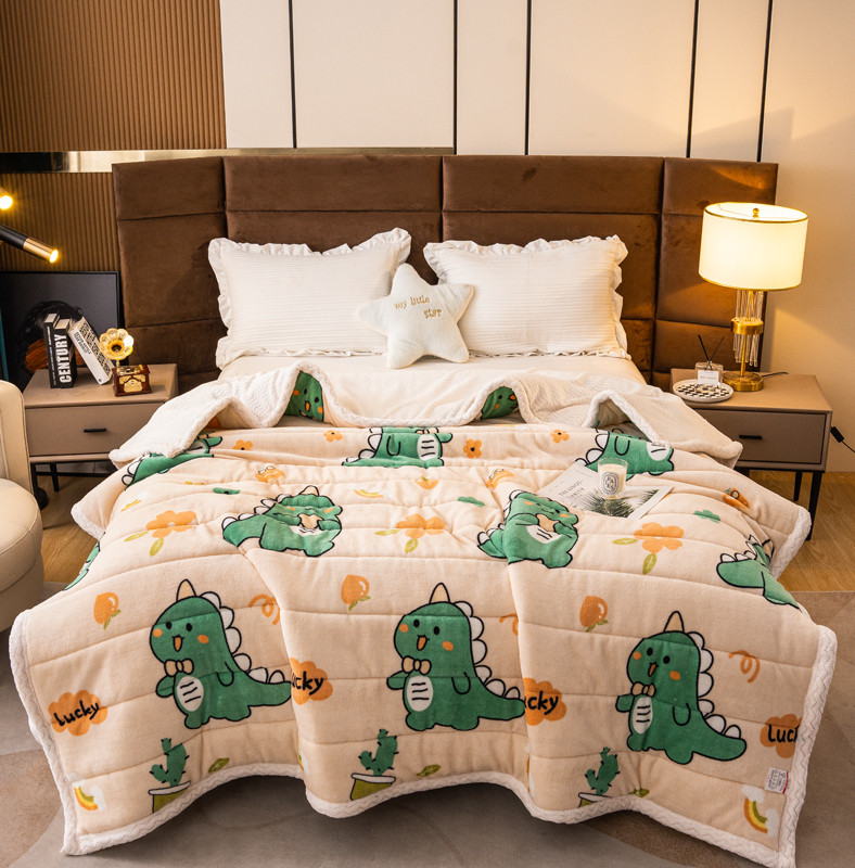 美莱家纺 2022新款牛奶绒贝贝绒夹棉加厚三层毛毯盖毯午睡毯 小恐龙