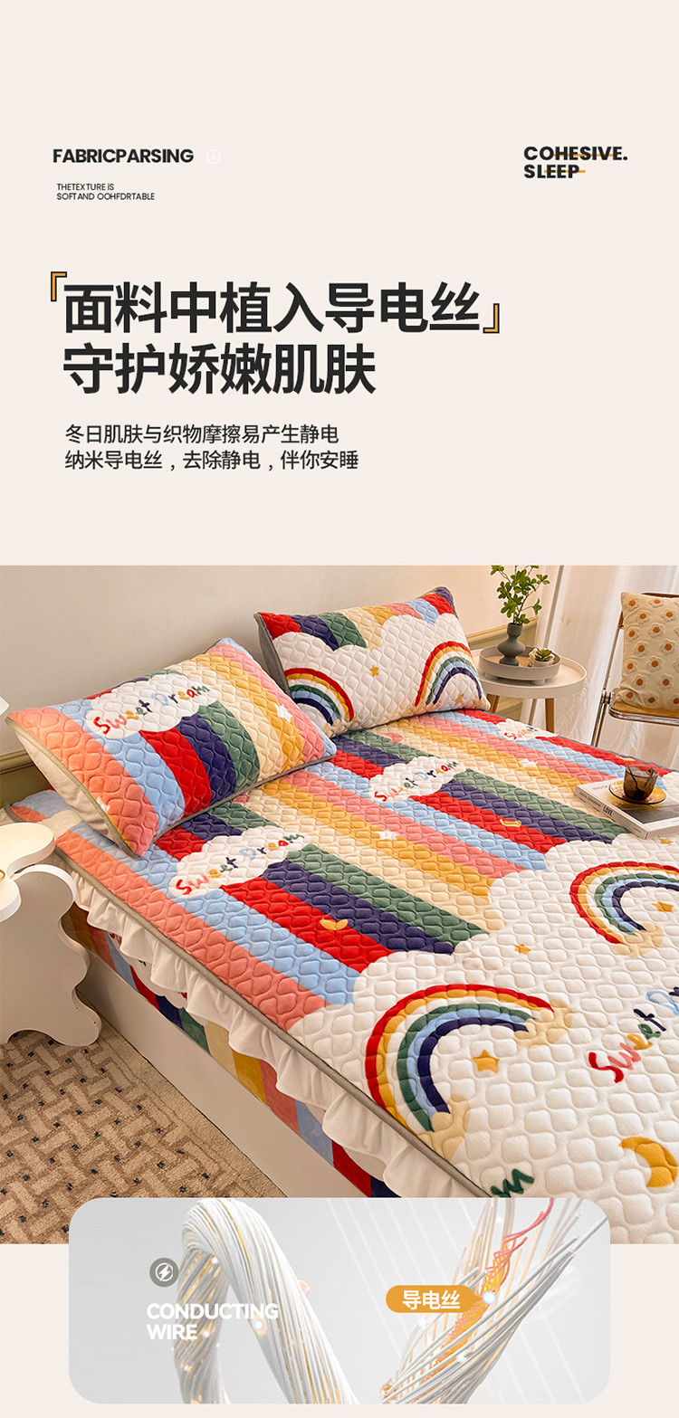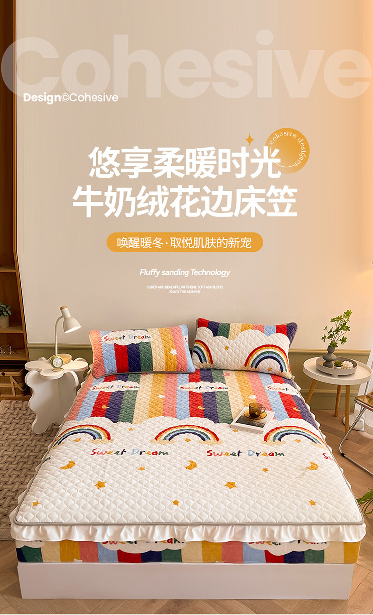 • 91家纺网 家纺一手货源 找家纺 澳梵家居 2022新款牛奶绒花边床笠三件套 彩虹漾