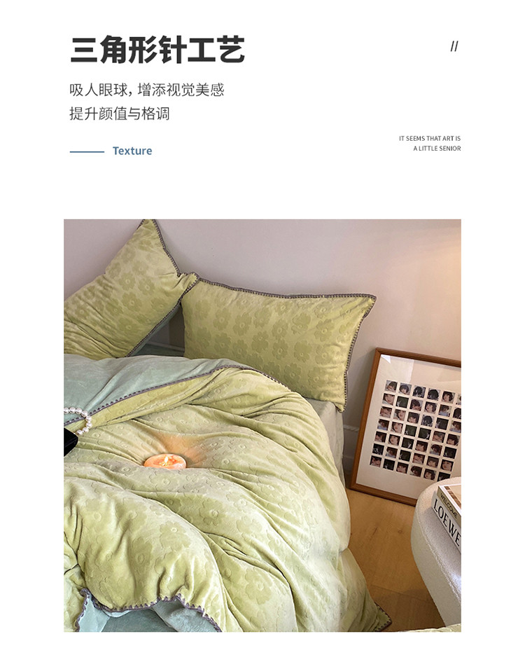 眠屿家纺 2022新款三角针兰花牛奶绒四件套 草绿
